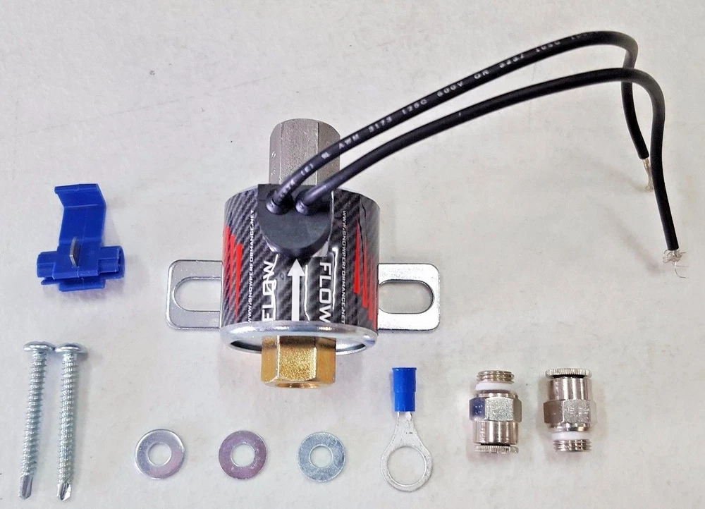 Snow Performance Shut Off Solenoid Upgrade: Snow performance shut off solenoid is used when mounting the injection nozzle lower than the reservoir or the reservoir is rear-mounted to prevent gravity flowing. It is also used to prevent siphoning when the injection nozzle is mounted after the throttle body or carburetor and is exposed to vacuum. Snow Performance electronic solenoids are designed for use with the Snow carburetor plate nozzle adapter. They include a wiring harness, a plastic solenoid with 1/8 in. NPT female threaded attachments, and necessary fittings. The solenoids should be mounted after the throttle plate to keep from siphoning at idle, or if the nozzle must be mounted lower than the reservoir to keep from gravity feeding.