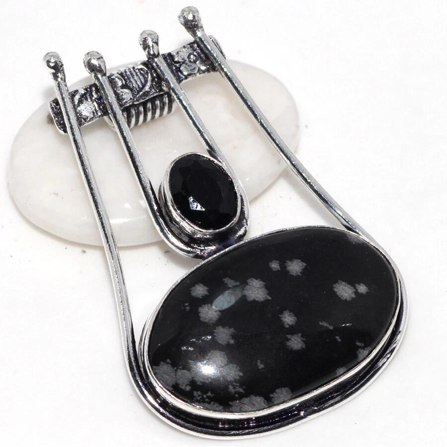 Snowflake Obsidian Black Onyx 925 Silver Plated Pendant 2" Stylish Jewelry JW