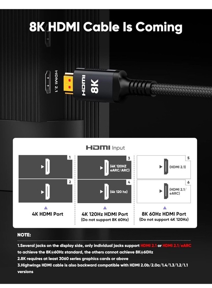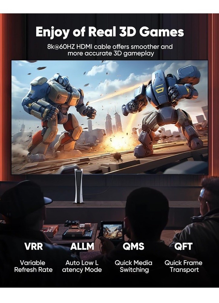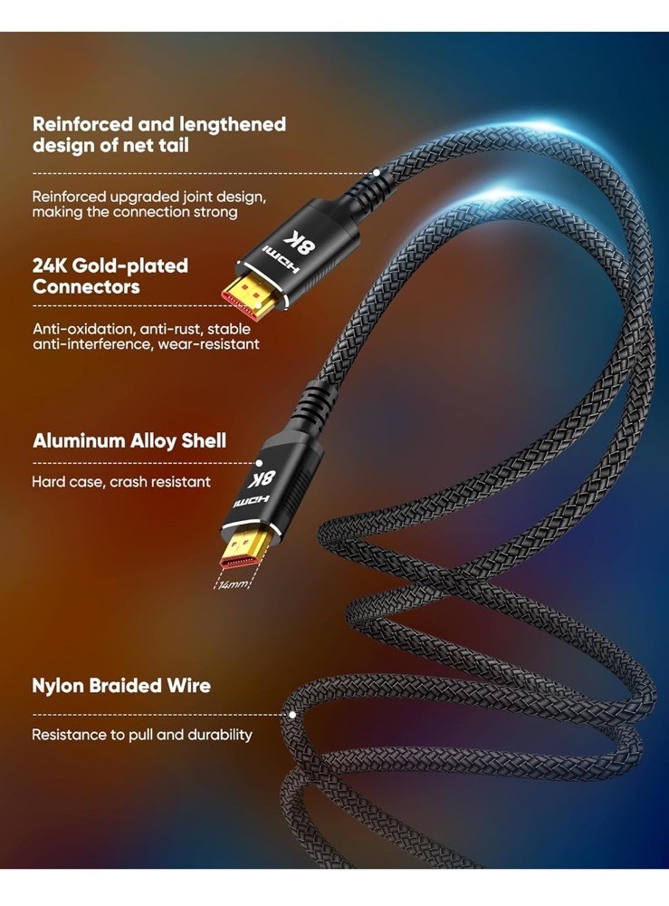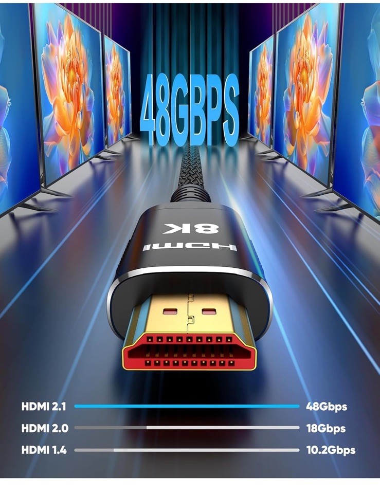 Open box New item! UHD HDMI 2.1 Cable: Meets the newest standard HDMI 2.1 Version and charactrize by 3 times transmission speed more than Ultra HD 4K, less lag, stuck and flick. This HDMI cord is also backward compatible with HDMI 2.0b/2.0a/1.4/1.3/1.2/1.1 version Supports 8K Video and More: This hdmi to hdmi cable supports 3D, Ethernet, 8K@60Hz, 4K@120Hz, 2K, 1080P, 48Gbps bandwidth, 48 bit/px HDR color depth, TrueHD 7.1 and new features such as eARC, VRR, QFT, QMS, ALLM, DSC, and more Universal Compatiblility: The 8k hdmi cable is compatible for all of HDMI devices, e.g., HDTV, Laptop, Monitor, ps-5, X-box, Projector, Entertainment/Sound/Video Conference System, Blu-ray players, and more. Fits for home and office, indoor and outdoor Durable Design: The SR Flexible Strength Design, 24K gold-plated ports and military-grade tensile nylon can ensure that this 8k hdmi cord withstand up to 25,000 flex times and accurately transmits signals, greatly extending use life Strict Quality Control: Our HDMI 2.1 cables have been put through rigorous performance tests in the laboratory before delivery. One 25 foot 8K HDMI cable in the box