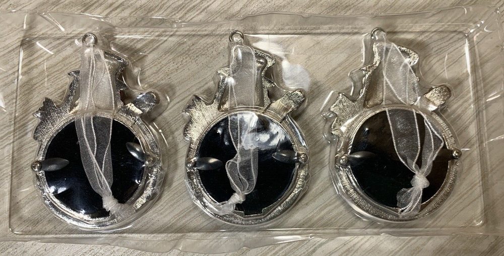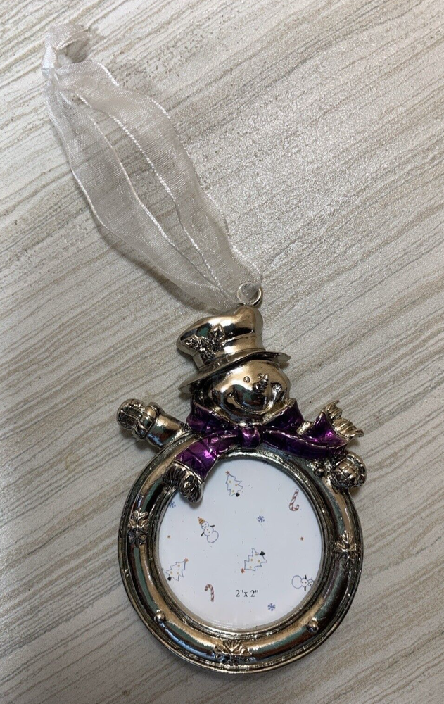 Snowman Round 1 1/2" Photo Frame Ornaments Colored Scarf Silver Snowmen Set of 3. These are new in the box but the box has been opened and there are some small dents in the box from storage. Each ornament holds a photo that is approximately 1 1/2" in diameter. Please see all photos as they are part of the description. We try to list as many details as possible, however some items are vintage and pre-owned so flaws are to be expected. We try to find out as much information as possible on each item we have available. On occasion we may make a mistake and appreciate your feedback.