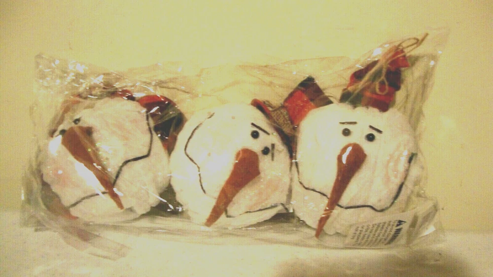 Here is a set of 3 hanging led snowman heads, can be used for ornaments on larger size trees or could hang on shelf hook, etc, they are mixed designs and have attached plastic battery box on backs as i show in picture and takes 2 AA batteries that are Not included, each have 6 hour timer also, they are made of polyfoam and ans wrapped in snow white fabric and have face designs, they each measure 6.5 inch high by 4.5 inch wide, are a larger size ornament and would accent any larger tree nicely hanging or can use for hanger on hook, etc and check out my many other nice holiday and everyday decor and lighting.