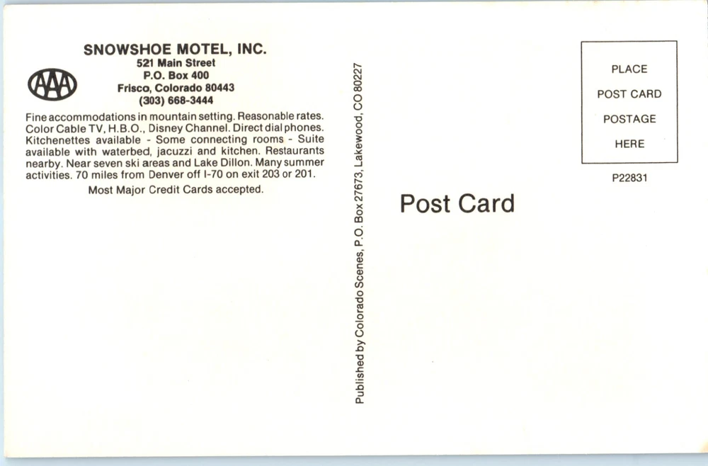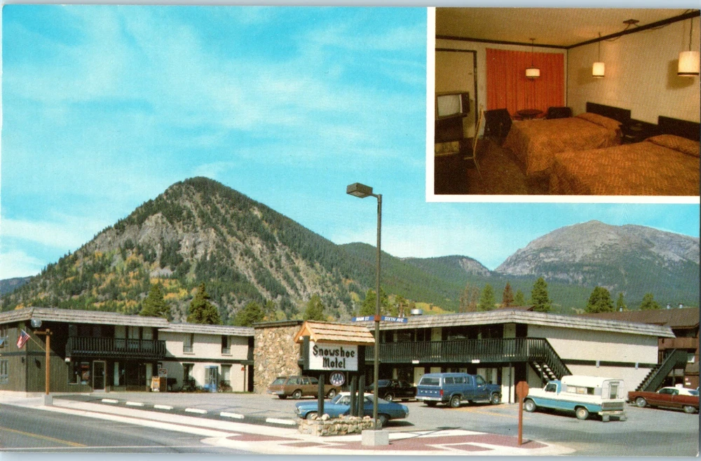 Snowshoe Motel Mountains Sky off HWY 70 AAA Old Ford Truck Vintage Postcard A5