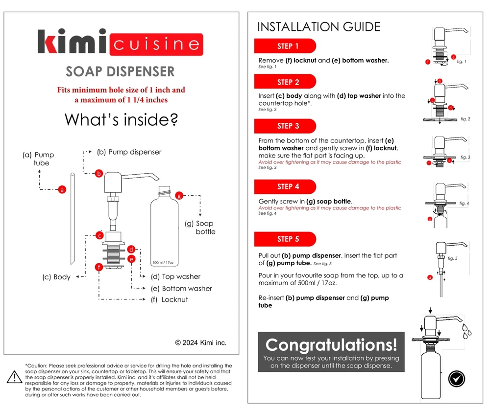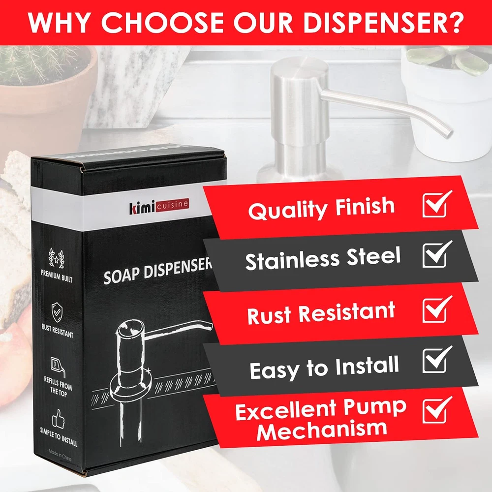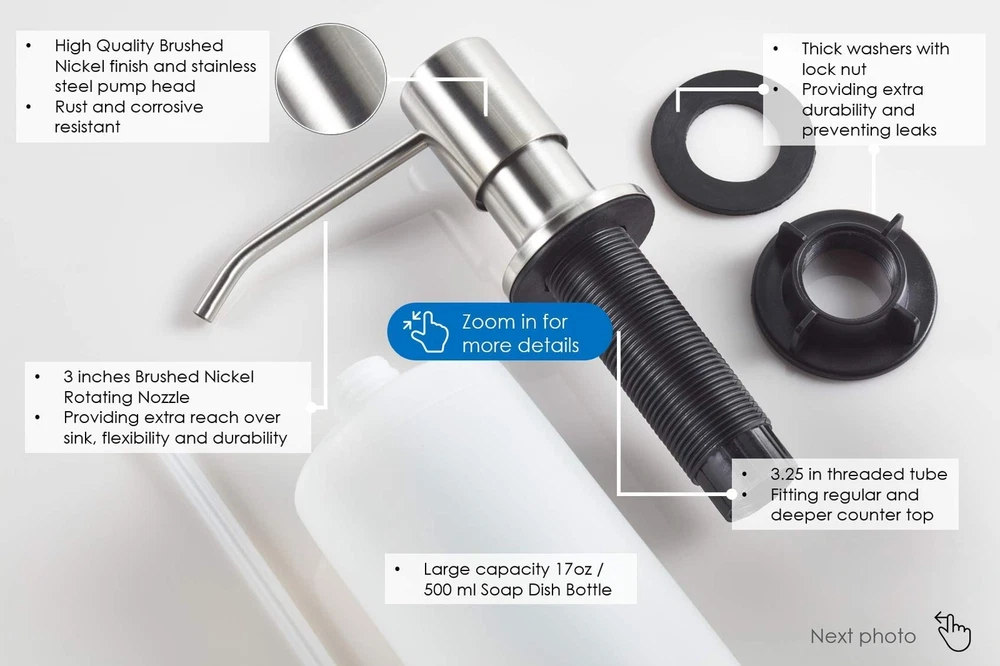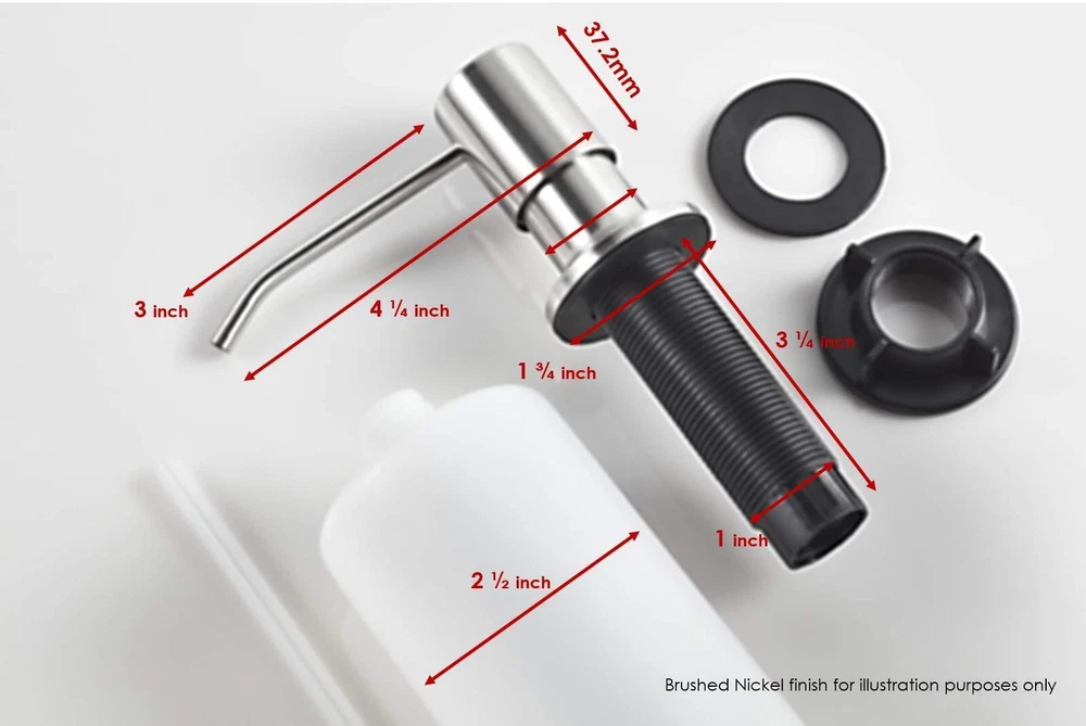 Are you Looking for a Durable Brushed Nickel Soap Dispenser for Kitchen Sink? Using the finest quality components, each of soap pumps are made for daily use making it of the be must have Kitchen accessories. They also make a perfect, unique gift for him or her, right in time for Christmas and the holiday season. A great way to help them "do the dishes" :) Here is What Makes our Sink Soap Dispensers Different ✅ DURABLE QUALITY - Built with finest quality stainless steel and PE plastic, our sink soap dispensers are acid and corrosive resistant, the Brushed Nickel finish allows it keep it look and shine for years to come even suitable as a commercial soap dispenser. ✅ QUICK INSTALLATION - Each package includes are simple step by step instructions. It only takes a couple of minutes to mount our sink soap dispenser on most kitchen sink, bathroom counters or any counter-tops. ✅ EASY TO REFILL - Simply remove the top of the mounted soap dispenser, pour and refill it from the top. Say goodbye to the days of crawling under the sink. ✅ BUILT- IN RESPONSIVE SOAP DISPENSER PUMP - Each soap pump is easy to push and delivers drip free dish soap from the very first pump. It's been tested to work with dish soap, hand soap, liquid detergent and even lotion. ✅ VERSATILE USE - The perfect and convenient addition to your kitchen or bathroom accessories for your every day needs. Use it as a dish soap dispenser, hand soap dispenser, bathroom soap dispenser, lotion dispenser or any liquid dispenser. ✅ 100% CUSTOMER SATISFACTION - We are so confident you'll love our Brushed Nickel Soap Dispenser that you won't want to return it. You'll be backed by our 30 day money back and 2 Year , the best kitchen soap dispenser on . (dispensador de jabon liquido para cocina) Built to last - Our Kitchen Soap Dispenser are made with exterior 304 stainless steel and interior durable PE plastic. The shiny multi-layered Brushed Nickel finish makes it resistant to corrosion and rust. Multipurpose - Our Kitchen Sink Soap Dispenser can be used in a variety of ways fill it up and use it as a hand soap dispenser, liquid soap dispenser or even for lotion. Makes it the must have kitchen sink accessories. A real space saver if you have an RV. Easy to Install and Fit – Perfect for 1 to 1.25 inch hole, use the provided locknut to tightly fit the Soap Pump onto your countertop hole. Designed for as an Insink Soap Dispenser installation, it can be installed it on any type of kitchen counter top Granite, Stainless Steel, Wood. Easy Troubleshooting: If your soap pump isn't working, these steps: 1) Verify and refill soap if low, 2) Disassemble and clean any clogs in warm water, 3) Eliminate airlocks by pumping while submerged in water, 4) Reassemble, ensure the tube straw is correctly connected for optimal flow. Satisfaction - Check out what other customers have to say. We proudly stand by the quality of our Kitchen Sink Soap Dispensers which makes them on of the best out there. You are backed by a our 2 Years .