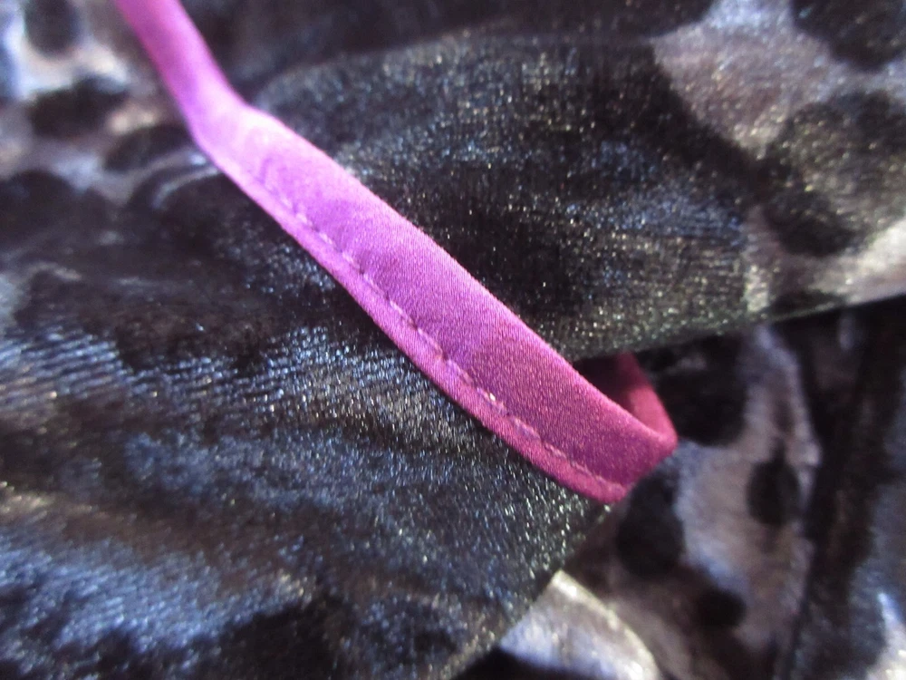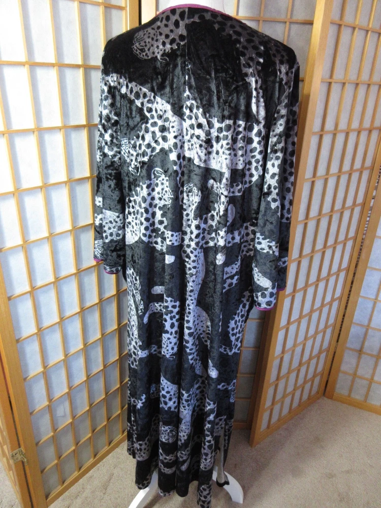 Sexy, elegant loungewear from Sofia Vergera, in pristine condition. Super soft crushed velvet jaguar print with purple trim. Polyester 95%/Spande 5%. 12" side slits. Other measurements: Length: approx 49" Armpit to armpit: approx 20" Sleeve length: approx 19" Please be aware there are no returns so measure carefully! All measurements are approximate and taken with utmost attention to accuracy Smoke-free home Seller has pets Items are not laundered prior to listing Please measure yourself to make sure this will fit you as there are no returns! Please measure your other clothing against this item of clothing to help you decide if this item will fit you! Please study photographs carefully as they are part of the description and items are sold “as is” Please do not hesitate to contact me with any questions you may have or if you need additional photos Actual color of item may vary due to camera flash, computer monitor, color variations I do not accept layaway so please do not ask me to "hold" something for you beyond eBay's policy. Thank you for your understanding.