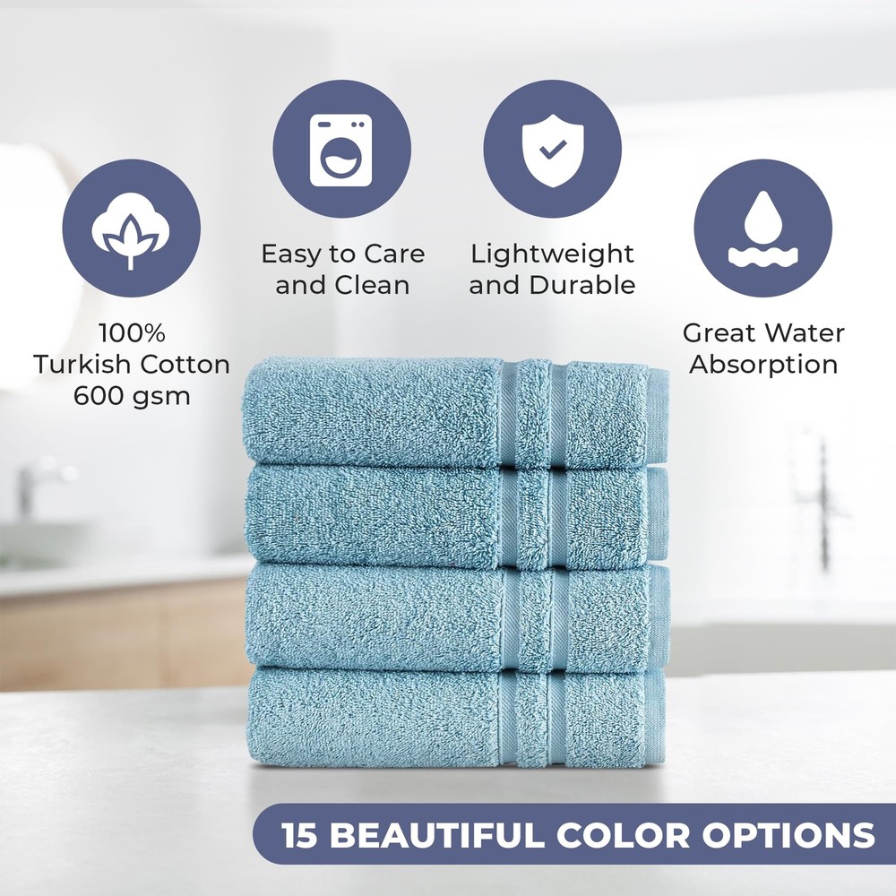 These hand towels are amazing—super soft, ultra-absorbent, and perfect for bathrooms, kitchens, or even travel. The Turkish cotton feels luxurious against the skin, and they dry quickly while staying plush wash after wash. Great value for a 4-pack, and the light blue color adds a fresh touch to any space. Highly recommend!