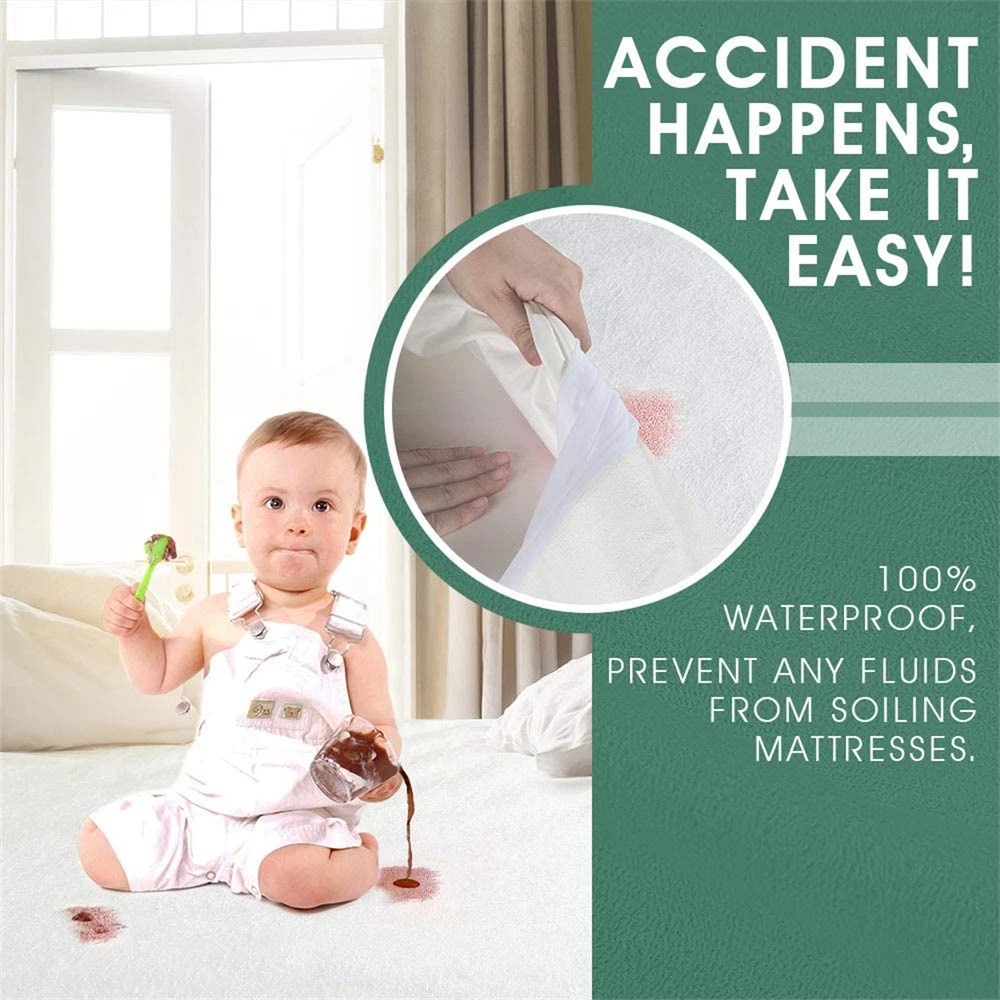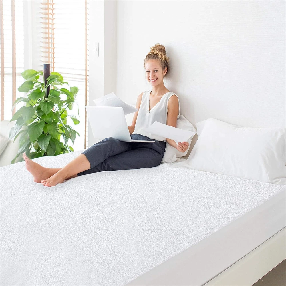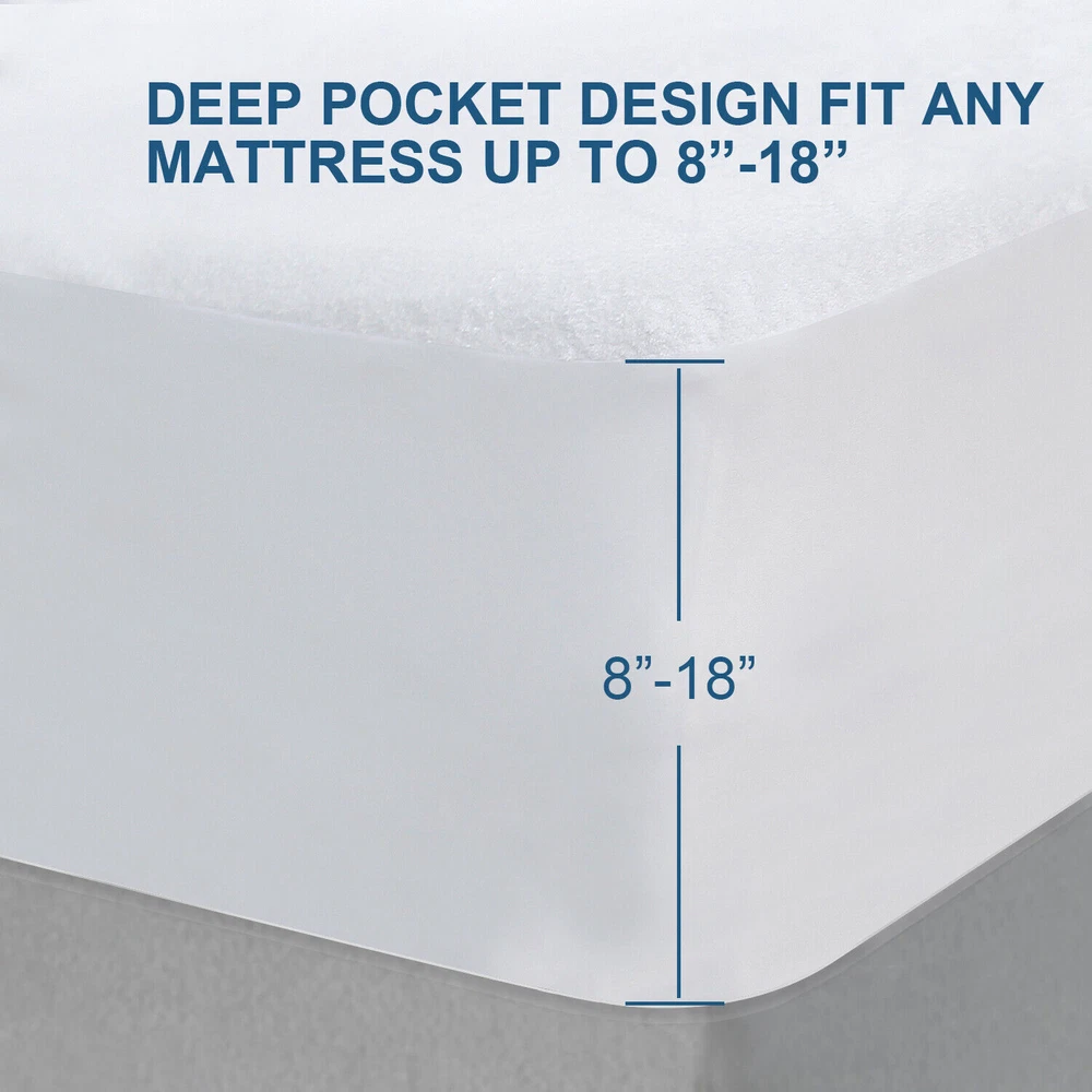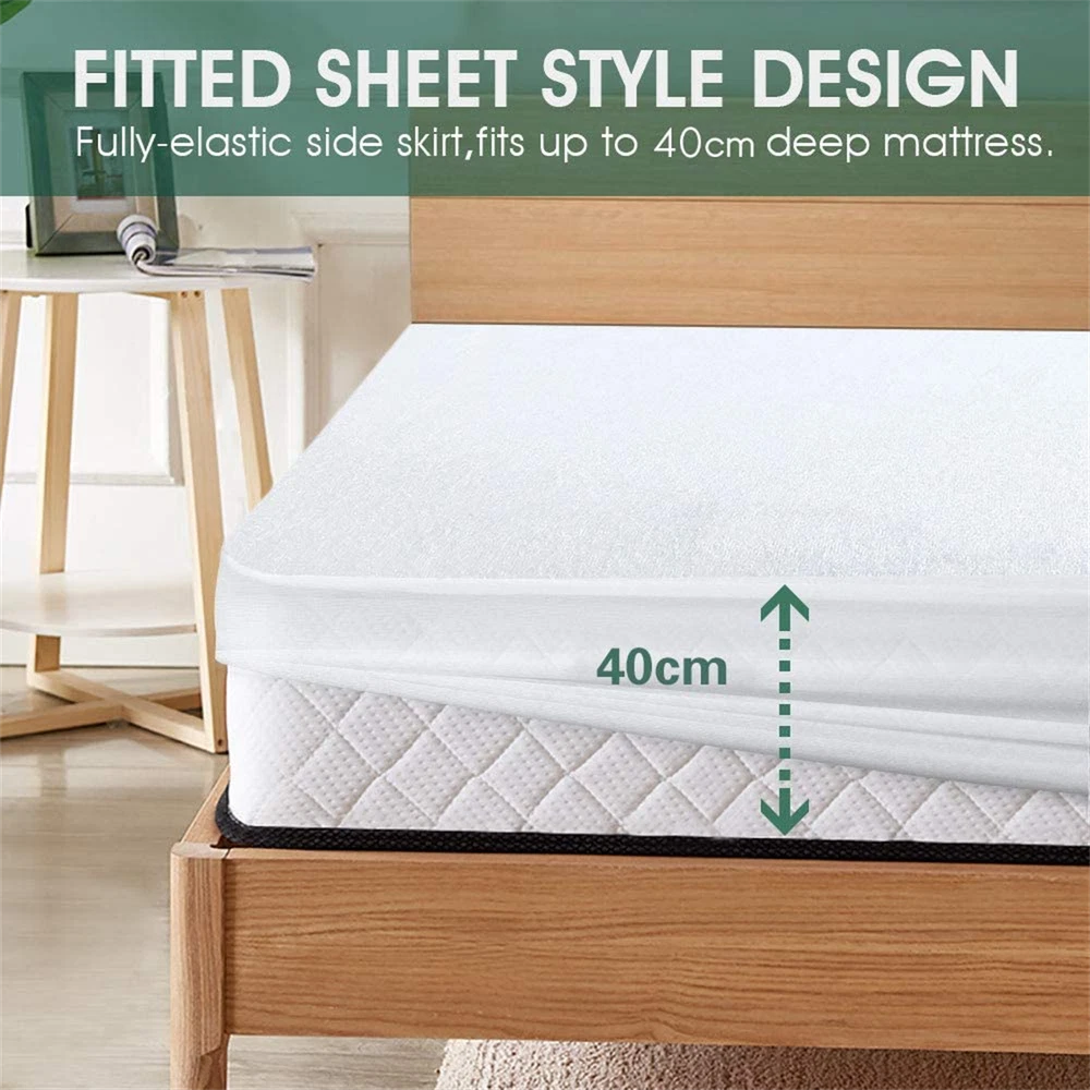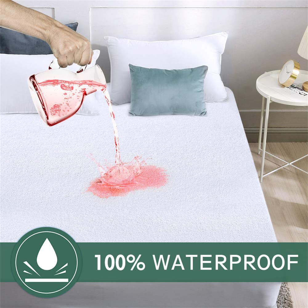 eBay Product description Ultra Smooth and Hypoallergenic: Our waterproof mattress protector top side is made from bamboo terry, which is a skin friendly and ultra soft fabric. With the waterproof membrane laminated back, it can protect the mattress from spills, liquids and stains, preventing the breeding of mold, dust mites and allergens, Especially suitable for those with kids, pets, or allergy, asthma, and eczema sufferers. Waterproof and Breathable: This mattress protector is lined with premium waterproof material (TPU) to prevent leakage. It is more breathable and noiseless, vinyl, phthalates and pvc free, full protection against urine and fluids, giving you a clean and healthy sleeping night. Strong Elastic and 360ᄚ Snug Fit : Fitted cover style design with strong elastic all around, that can ensure your mattress protector stay in place, avoid bunch up or slip out of place. Provide a more secure protection for your valuable mattress, extend the life of your mattress. Easy Care and Machine Washable: Machine washable and tumble dry a low setting. Our waterproof mattress pad covers are available in a range of sizes: Twin (39" x 75") , t he side skirt can automatically fit mattresses height up to 8-14 inch . Twin XL (39" x 80") , t he side skirt can automatically fit mattresses height up to 8-14 inch . Full (54" x 75") , t he side skirt can automatically fit mattresses height up to 8-14 inch . Full XL ( 54" x 80") , t he side skirt can automatically fit mattresses height up to 8-14 inch . Queen (60" x 80"), t he side skirt can automatically fit mattresses height up to 8- 18 inch . King (76" x 80") , the side skirt can automatically fit mattresses height up to 8- 18 inch . California King (72" x 84") , the side skirt can automatically fit mattresses height up to 8- 18 inch . You can choose which you need. We would recommend purchasing 2 mattress protectors. That you can use one to replace the other when accidents do occur.