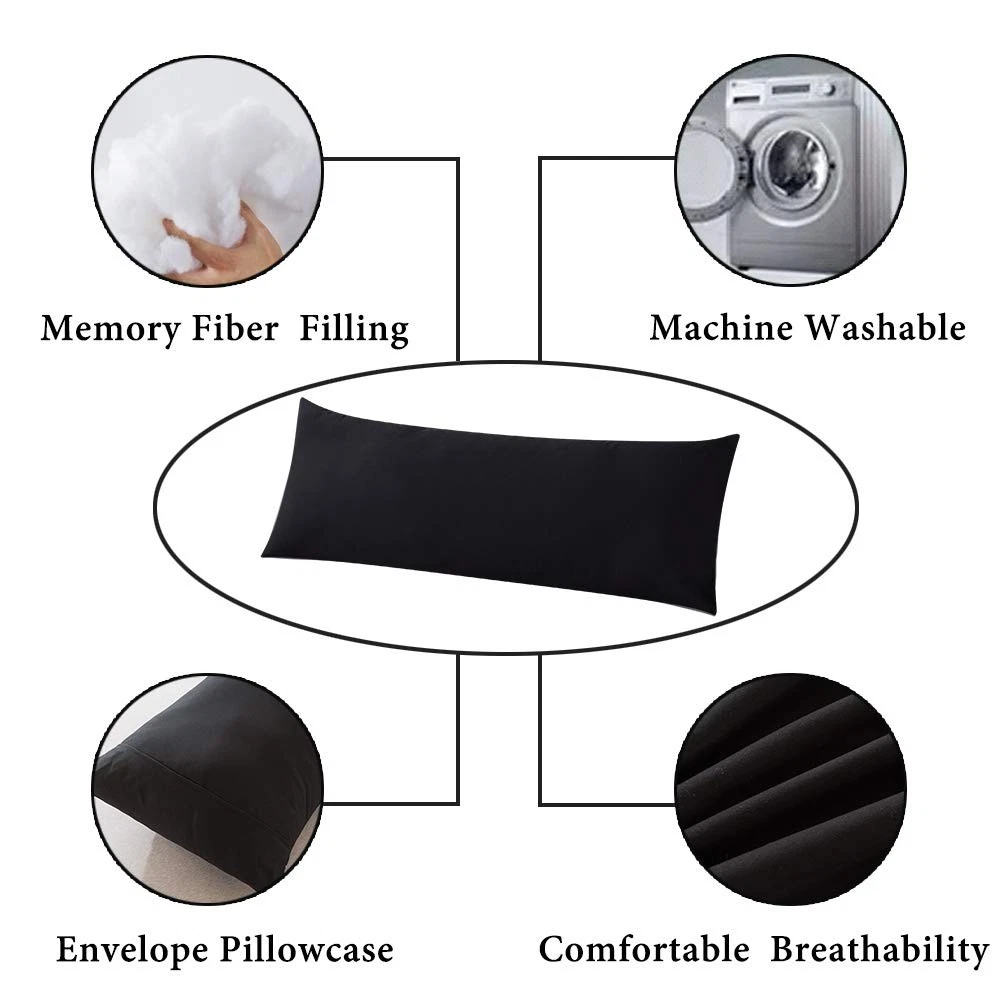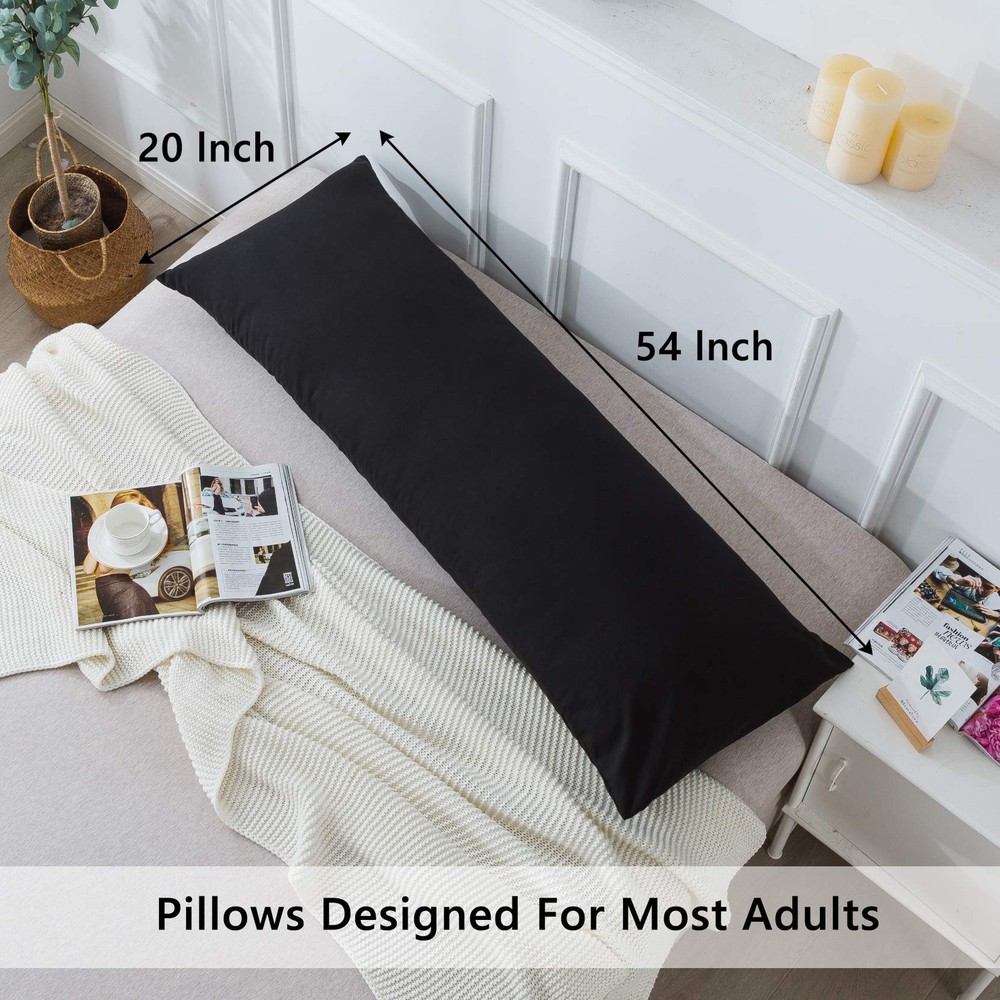 Our full body pillow includes 1 pillow insert and 1 pillowcase. It can instead of a bulky pillow bring extraordinary comfort to your body. Body pillowcase is skin-friendly and breathable, keeping you cool and comfortable all night long. If you always need a pillow under your feet when you sleep If you always like to work or watch TV on your bed and sofa If you're constantly having neck, shoulder, or lower back pain from work If you feel tired after working, need a rest and a warm hug, The best gift you will feel is our body pillow. If you want a firmer one, it is highly recommended that you can buy two pillows, then put two pillows insert into one pillowcase. Removable pillowcases save you more time to enjoy life. ✅Note: The Black pillowcase is rolled inside, please make the insert fluffy and put it inside the pillowcase. 【Long Body Pillow】Each order includes 1 pillow insert + 1 Black 100% polyester body pillowcase.Envelope closure design (no zipper),The body pillow is skin-friendly and breathable,Filled with high quality fiber.medium density and supportive,keeping you cool and comfortable all night long. 【Multi-Function】Adjustable Full body pillow insert provides additional relief and enough support for your body while sleeping in bed,Fits perfectly to the original contour of the body, Very suitable for hotels or bedrooms,In addition,This long pillow creates ideal support while sleeping,reading,nursing and breastfeeding. 【Ergonomic Comfort】This long 20x54 inch body pillow is made for adults.Whether you need to relax your hips,back,neck and abdomen,our long pillows can instead of a bulky pillow bring extre extraordinary comfort to your body,Make your body and mind fully relaxed.If you want a very firm pillow,you can choose to buy two pillow inserts into one pillowcase. 【Easy to Care】This large body pillow is Machine washable and Dry in the low-temperature drum,It will help to remove smells that might be lingering. The body pillow is overfilled with whole piece 160 GSM microfiber, Notice:we recommend that you wash the pillowcase more and pillow insert less to extend the service life. 【Service】For ease of transportation, our pillows have been vacuum compressed for a long time and will be flat when opened but don't worry, please pat, squeeze and fold them back to their full, fluffy shape. If there is any dissatisfaction,please feel free to contact us,we will provide you with 24 hours after-sales service and 100% satisfaction.