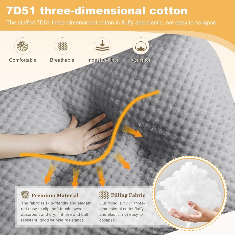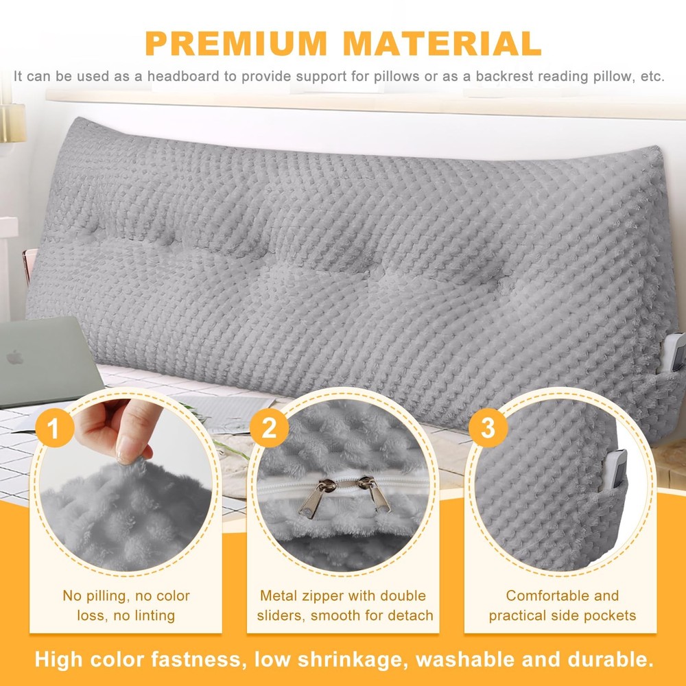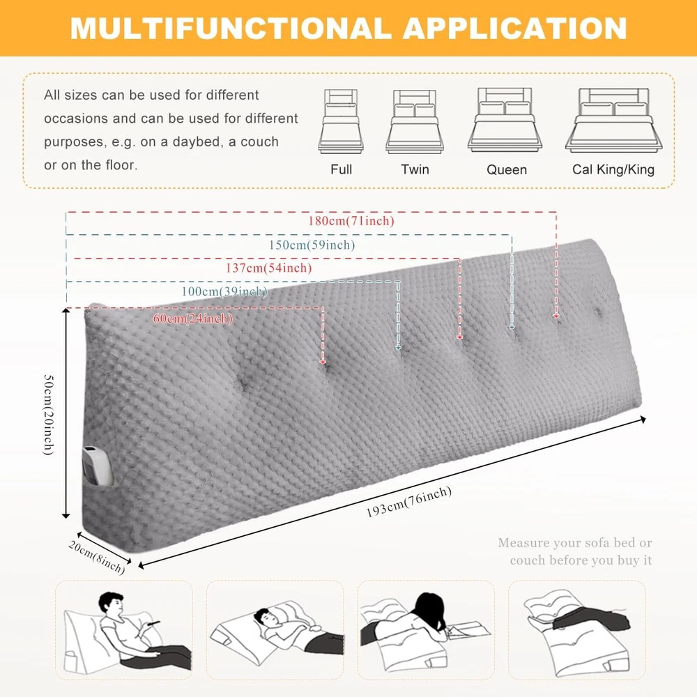 Product Description Cover Material:Fluffy Fleece Filling: 7D51 three-dimensional cotton Design: Double head zipper, Removable buttons Features: Soft and Skin-friendly, Breathable Fabric, not easy to slip PP cotton resilience, long leaning does not collapse. Cleaning: Machine Washable. Recommended water temperature below 40 degrees. High color fastness, low shrinkage, washable and durable. Designed in line with the human body curve, give you a comfortable reading and rest experience. ERGONOMICALLY SHAPED SUPPORT: headboard wedge pillow provides us with scientific, comfortable and healthy support according to ergonomics. It can be used as a headboard cushion to decorate the bed or as a backrest positioning support bolster cushion for back pain relief. SOFT AND SUPPORTIVE MATERIAL: Upgrading fleece fabric adopts novel fluffy fiber, which makes large triangular wedge bed pillow has advantages that others cannot match: the fabric is skin-friendly and elegant, not easy to slip, soft touch, sweat-absorbent and dry, lint-free and ball-resistant, good wrinkle resistance, drape and crisp. The stuffed 7D51 three-dimensional cotton is fluffy and not easily deformed. REMOVABLE COVER AND EASY CLEAN: The triangular reading bed rest pillow has a metal zipper with double sliders, which is smooth for detach. The buttons are detachable for quick and easy disassembly. The wedge headboard pillow fabric has high color fastness, low shrinkage, washable and durable. TWO LARGE SIDE POCKETS: Backrest Wedge Pillows are designed with two side pockets to store your phone, glasses, remote control and other items. While filling the headboard gap in bed, the supportive headboard effectively gives you the most convenient reading and resting experience. ESSENTIAL FAMILY GOODIES: Triangular Headboard Pillow not only decorate the bed and act as a headboard, but also fill in the gaps and keep items from falling out. You can use it as a support bolster cushion, which provide back support for your family when reading, playing games, and taking a nap. It's also popular in college dorm beds.