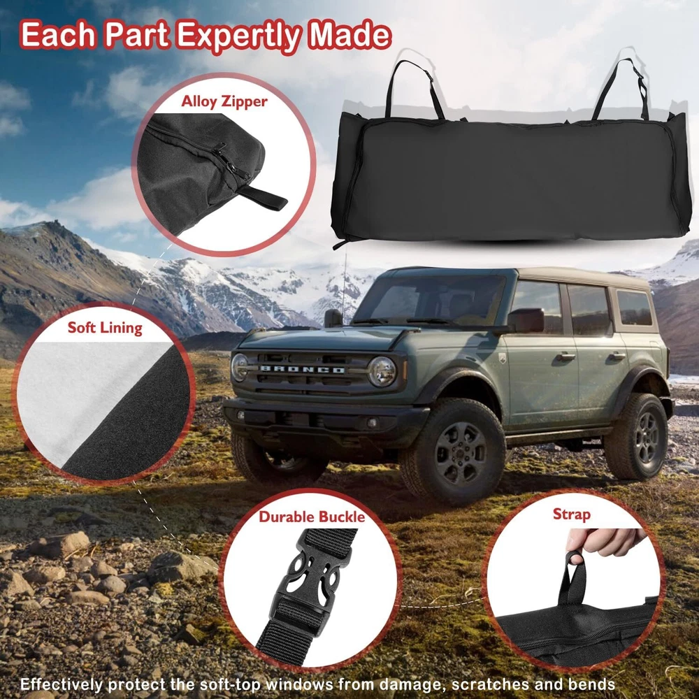 【Perfect Fitment】 The soft top window storage bag is compatible with Ford Bronco 2021 2022 2023 2024 4-Door models with soft-top windows. This will NOT fit for Bronco Sport model. Kindly please check your vehicle model before purchase. 【Comprehensive Protection for Soft-Top Window】 This organizer storage bag will effectively protect the soft-top windows from damage, scratches and bends. A must-have storage accessory when you take off the soft-top windows for enjoying the open air and sunshine. Store the window panels easily with our quality protection bags. 【Expertly Made & Superior Quality】 The interior soft lining will separate the panels and avoid collision. To prevent window panels from rubbing and causing scratches, the storage bag is designed with 2 partitions and some buckles, hooks and loop fasteners inside for panels fixed in place. Furthermore, the storage bag is attached with straps for easy carriage and transportation. 【Built to Last】 Made of premium-grade 600D Oxford Cloth with soft inner liner. Waterproof and more durable. Dirt-resistance, anti-impact and anti-deformation for long-lasting reliable use. 【Satisfaction Guarantee】 If you're not satisfied with the product, simply return it in 60 days or get a replacement within 1 year for quality-related issues via our customer service. If your item is defective, incorrect, arrived damaged or any other problems, please contact us (include pictures if possible) and we will reply in 24 hours.