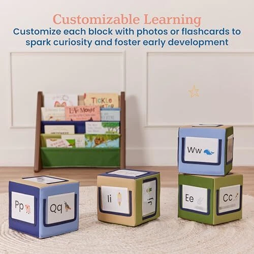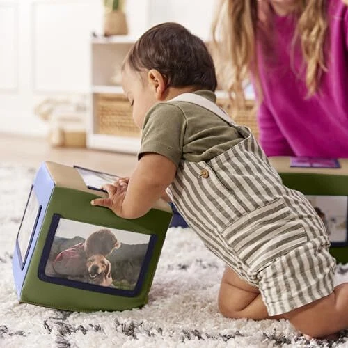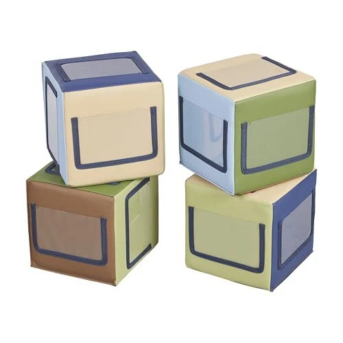 Introduce interactive learning and play with SoftZone Picture Me Soft Blocks, a 4-pack of soft foam dice featuring six 4x6 clear pockets for photos, flashcards, and educational material. Designed for use by babies, toddlers, and elementary-aged children, these versatile cubes adapt to every stage of development for hands-on engagement. Babies and toddlers will love exploring the soft, easy-to-grip activity cube, which promotes fine motor skills, hand-eye coordination, and sensory exploration. Customize each pocket with photos of family and pets or introduce early vocabulary words and concepts to stimulate language development. Perfect for active play, the soft foam building blocks encourage physical activity as children roll, stack, and toss, building gross motor skills. With older children, transforms into an educational tool, displaying numbers, letters, or more advanced concepts. Designed to foster social interaction, the game cube helps children develop essential skills like sharing, cooperation, and teamwork when used in group activities or classroom settings. Soft and lightweight, these modular quiet blocks fall over without making loud crashes. The foam core is covered with water-resistant polyurethane vegan leather with a durable woven backing. The classroom must-haves are great for use in a daycare, or preschool and are perfect for home. Personalized Activity Blocks: 4-pack of soft blocks, each with six picture sleeves, promoting motor skills, hand-eye coordination, spatial reasoning, and recognition; perfect for a playroom or school Developmental Play: Rotate photos, flashcards, or educational materials on the toy blocks to introduce vocabulary, family members, and pets, building familiarity and early language skills Kid-Friendly Design: Supports cognitive skill development and stimulates natural curiosity through open-ended play; lightweight, easy-to-carry shapes are safe and fall gently when knocked over Certified Safe: This latex-free block playset is GREENGUARD [GOLD] Certified for low VOCs, CPSIA compliant, adheres to CAL TB 117 requirements, and constructed with CertiPUR-US Certified foam Product Dimensions: Sensory toy measures 8" L x 8" W x 8" H; Adult Active Engaged & Direct Supervision Required