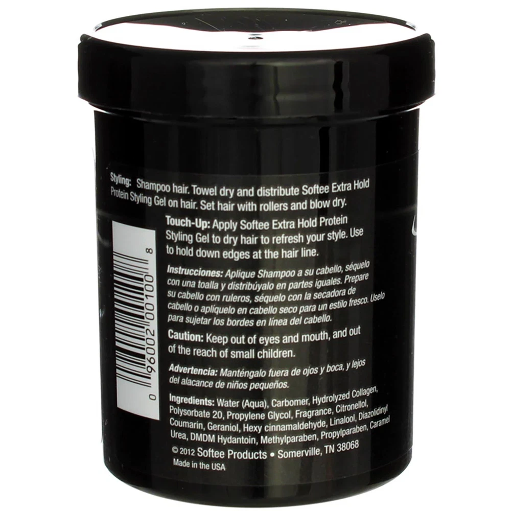 Product Description Specially designed to bump out the frizz and help mold your style This unique, lightweight formulation transforms dry, lackluster hair into shiny healthy hair Exceptional smoothing agents deliver smooth, lustrous hair without wax, residue or build-up to weigh the hair down Ingredients Water (Aqua), Carbomer, Hydrolyzed Collagen, Polysorbate 20, Propylene Glycol, Fragrance, Citronellol, Coumarin, Geraniol, Hexy Cinnamaldehyde, Linalool, Diazolidinyl Urea, DMDM Hydantoin, Methylparaben, Propylparaben, Caramel. Instructions Styling: Shampoo hair. Towel dry and distribute Softee extra hold protein styling gel on hair. Set hair with rollers and blow dry. Touch-up: Apply Softee extra hold protein styling gel to dry hair to refresh your style. Use to hold down edges at the hair line. Product Description Specially designed to bump out the frizz and help mold your style This unique, lightweight formulation transforms dry, lackluster hair into shiny healthy hair Exceptional smoothing agents deliver smooth, lustrous hair without wax, residue or build-up to weigh the hair down Ingredients Water (Aqua), Carbomer, Hydrolyzed Collagen, Polysorbate 20, Propylene Glycol, Fragrance, Citronellol, Coumarin, Geraniol, Hexy Cinnamaldehyde, Linalool, Diazolidinyl Urea, DMDM Hydantoin, Methylparaben, Propylparaben, Caramel. Instructions Styling: Shampoo hair. Towel dry and distribute Softee extra hold protein styling gel on hair. Set hair with rollers and blow dry. Touch-up: Apply Softee extra hold protein styling gel to dry hair to refresh your style. Use to hold down edges at the hair line. Warnings Safety Warning: Keep out of eyes and mouth, and out of the reach of small children. Disclaimer The product descriptions and instructions provided by Vitabox are for informational purposes only and are qualified in their entirety by the information available from manufacturers of the products. You should carefully read all product packaging, and contact the manufacturer with any questions before using a product. While we endeavor to ensure that product descriptions are current, manufacturers sometimes change their products. We are not liable for inaccuracies or misstatements about products. We do not provide medical advice or recommendations. You should not use the information provided by Vitabox for diagnosing or treating a health problem or disease. If you have or suspect that you have a medical problem, immediately contact your health care provider. Information and statements regarding dietary supplements have not been evaluated by the Food and Drug Administration or any other government agency and are not intended to diagnose, treat, cure, or prevent any disease. Disclaimer The product descriptions and instructions provided by Vitabox are for informational purposes only and are qualified in their entirety by the information available from manufacturers of the products. You should carefully read all product packaging, and contact the manufacturer with any questions before using a product. While we endeavor to ensure that product descriptions are current, manufacturers sometimes change their products. We are not liable for inaccuracies or misstatements about products. We do not provide medical advice or recommendations. You should not use the information provided by Vitabox for diagnosing or treating a health problem or disease. If you have or suspect that you have a medical problem, immediately contact your health care provider. Information and statements regarding dietary supplements have not been evaluated by the Food and Drug Administration or any other government agency and are not intended to diagnose, treat, cure, or prevent any disease.