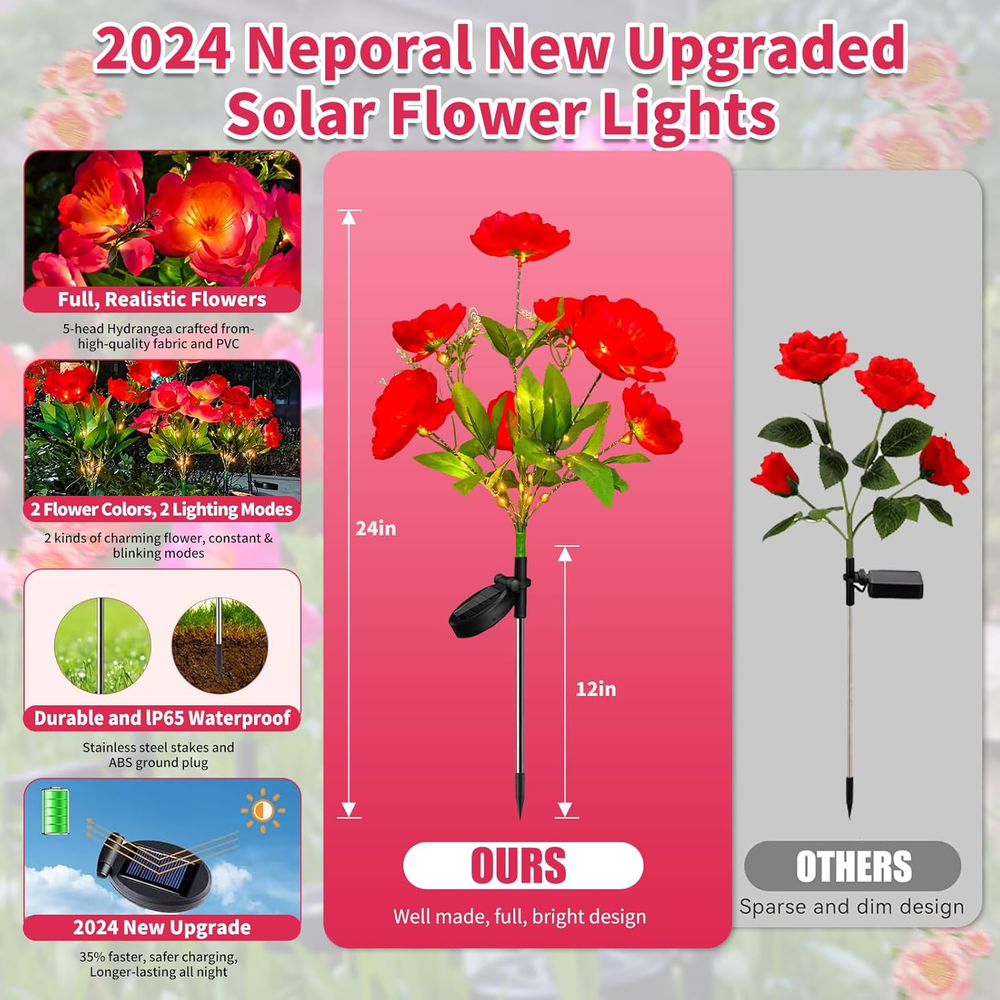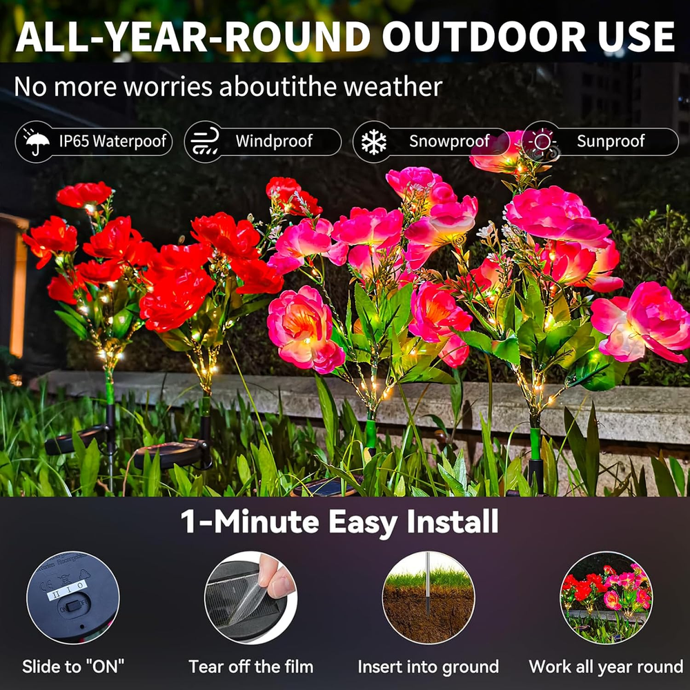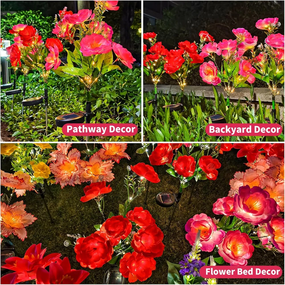These solar flowers are a gorgeous addition to my garden! They light up beautifully at night with a warm, inviting glow, and the two lighting modes add a nice touch. Super easy to install, waterproof, and the solar charging works perfectly—no wiring needed. Love how they brighten up my yard while saving energy. Highly recommend for anyone wanting cute, low-maintenance outdoor decor!
