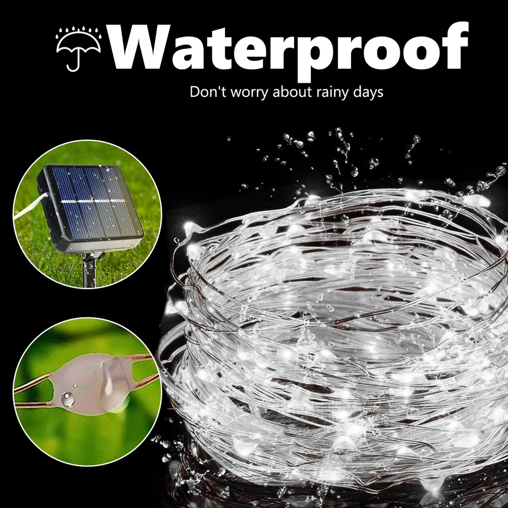 Solar Powered and Auto On/Off: White Christmas string lights powered by solar energy with no extra electric cost or battery replacement needed. The light sensor charges the lights during the day and turns them on automatically at night Flexible DIY Christmas String Lights: On 33ft ultra-thin and high-quality bendable silver wire, the solar string lights conform to any shape you want, with steady 360 degree viewing angle which illuminate in every direction. Also, they easy to store and ready for next use 8 Modes and Memory Function: Choose from 8 modes including waves, combination, sequential, slo-glo, chasing/flash, slow fade, twinkle/flash, and steady on.The built-in memory chip saves your last mode setting, so you don’t need to reset it daily Waterproof: With an IP65 rating, these solar Christmas lights are designed to withstand all weather conditions, including heavy rain and snow, making them suitable for indoor and outdoor use Widely Used Solar String Lights: These solar-powered string lights are perfect for Halloween, Christmas, weddings, holidays, gardens, yards, lawns, fences, porches, trees, roofs, and decks