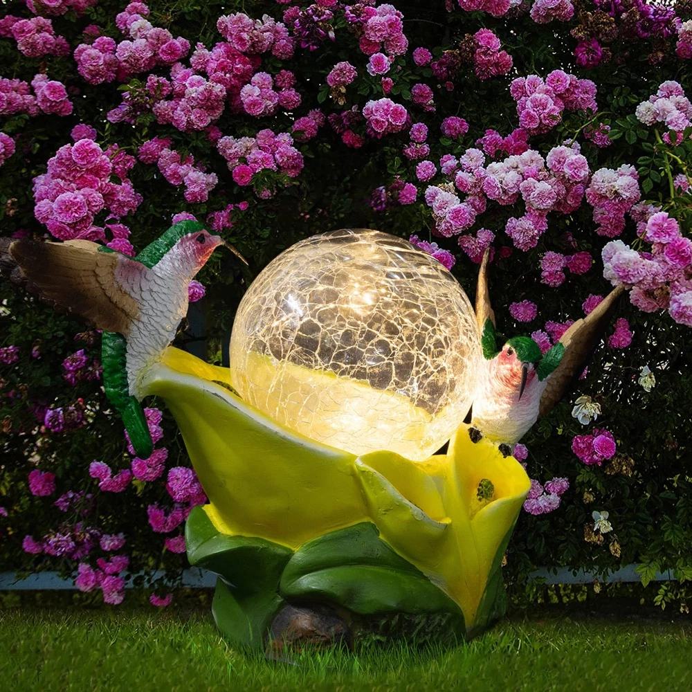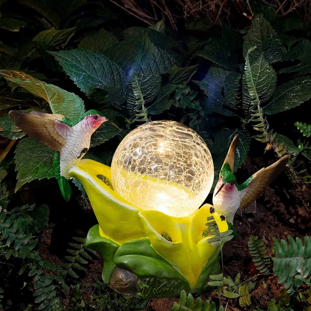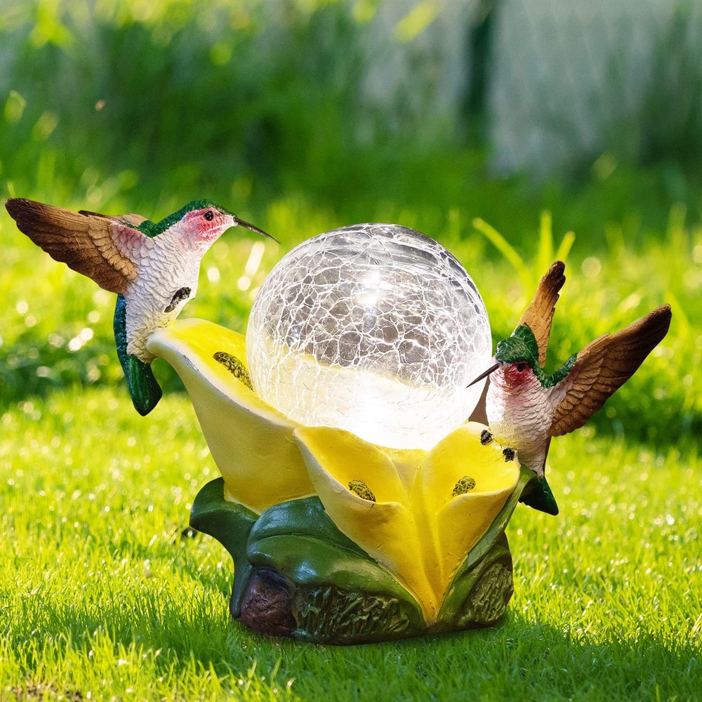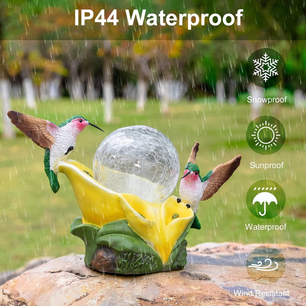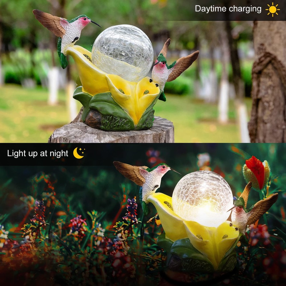 Garden Statue 【Multipurpose Decor】Hummingbird statues are Great addition to your garden that fits for outdoor decoration, such as backyard, garden, lawn, patio, yard, fence, walkway. You can enjoy the vivid color during the daytime and soft light at night. 【Waterproof & Premium Materials】Every part of solar powered garden statue is made of long-lasting resin and HAND PAINTED UV-resistant paint, which makes it become solid and waterproof, and can withstand the rain, snow, wind, frost. 【Save You Electricity Bills】100% Solar-Powered hummingbird Garden Statue. Turn on the power switch before use, the solar garden statue will automatically charge and store energy during the day, and it will automatically light up your garden at night. 【Perfect Gifts】Whether you are looking for Housewarming, Valentine's Day, Birthday, mother's Day, Easter, Halloween, Thanksgiving, or Christmas gifts, this garden ornament hummingbird figurine will be your best choice. Size:9.2" L x 4.3" W x 5.9" H. 【Convenience】Please feel free to contact us if you have any problems while using the solar garden statue. Our experienced customer service team will provide you with satisfactory after-sales service and 30 days replacement.
