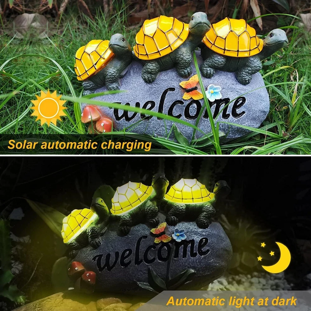 đ˘ăAdd an ecological touch to your Fall gardenăEvery garden statue and figurine is made of long-lasting resin and coated with UV-resistant paint. Making it solid and lasting. The garden turtles decorations to welcome guests onto your gardenălawn ă yard ă pond during the Thanksgiving Christmas and illuminate at night with fairy-tale colors. đ˘ăEnergy Efficiencyă100% solar-powered. Turn on the power switch before use, solar Turtles statue will automatically charge and energy during the day, and at night (in the dark) the Garden Turtles will light up automatically (warm light) to illuminate your Fall garden, which will save you time and electricity bills. đ˘ăHigh-Quality & Waterproof Materialsă Finished with a resistant ip44 coating, this solar garden decorations is built to withstand all types of weather conditions. Color fading, water and frost neednât be a concern with this durable resin, outdoor Fall garden decor. It is sure to brighten up your Outdoor GardenăyardăLawnăpondăpatio. đ˘ăWarm GiftsăSize: 9.8 "L x 6.3" W x 3.9" H. The garden dĂŠcor figurines is of the best garden gifts you can give. This lawn ornament is a perfect gift for your family and friends for Thanksgiving Christmas holiday,birthdays, weddings and housewarming. This charming outdoor statue will also add charm to your garden and lawn decor. Light up the fairy tale world. đ˘ă180 DAYS FREE ă We want you to love this addition to your garden and home decor. If for some reason you are not completely satisfied, we offer refunds and returns.180 days Free .