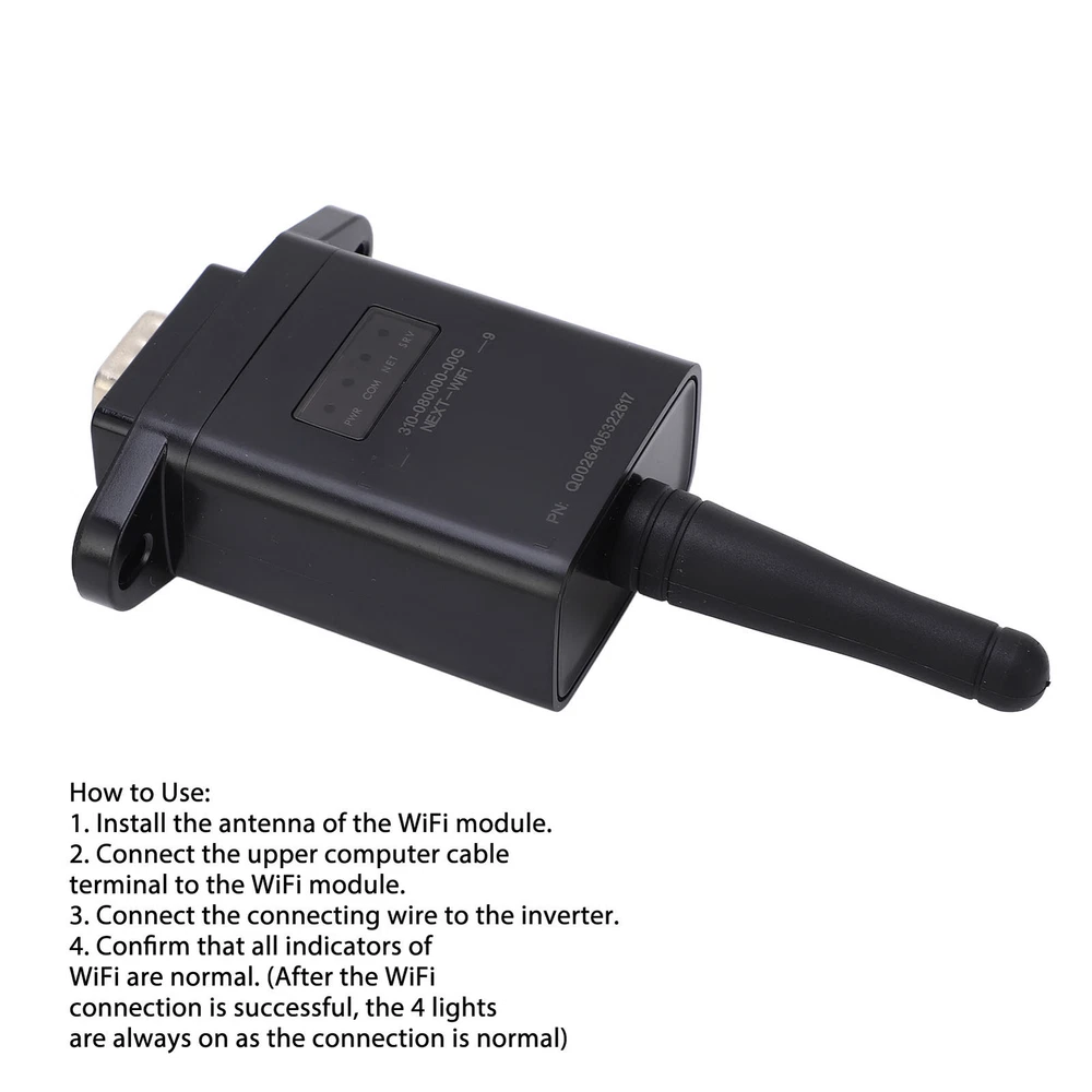 Feature: 1. Remote Monitoring: The WiFi module enables access to the inverter for remote monitoring, and remotely control and monitor through APP. 2. RS232 Port: With RS232 communication interface, the remote control board can ensure fast connection and stable performance. 3. Applicable Type: For 7.2KW, 8.2KW, 10.2KW, SM1.5KWSM2.4KW, SM3.2KVA, VM3.5KW, VM5.5KW, and other WiFi . 4. ABS Material: The shell is made of excellent ABS material, which is hard and impact resistant, very sturdy for long term use. 5. Simple Connection: With connecting wires and screws, easy to install and use, 4 lights are always on, it means the connection is normal. Specification: Item Type: Solar Inverter WiFi Module Material: ABS Function: This product is mainly used for grid connected inverter of solar photovoltaic power generation. Communication Interface: RS232 Applicable : For 7.2KW, 8.2KW, 10.2KW, SM1.5KW, SM2.4KW, SM3.2KVA, VM3.5KW, VM5.5KW, and other WiFi . Package List: 1 x Solar Inverter WiFi Module (Silkscreen Random) 1 x Antenna 1 x Connecting Cable 2 x Screw 1 x User Manual
