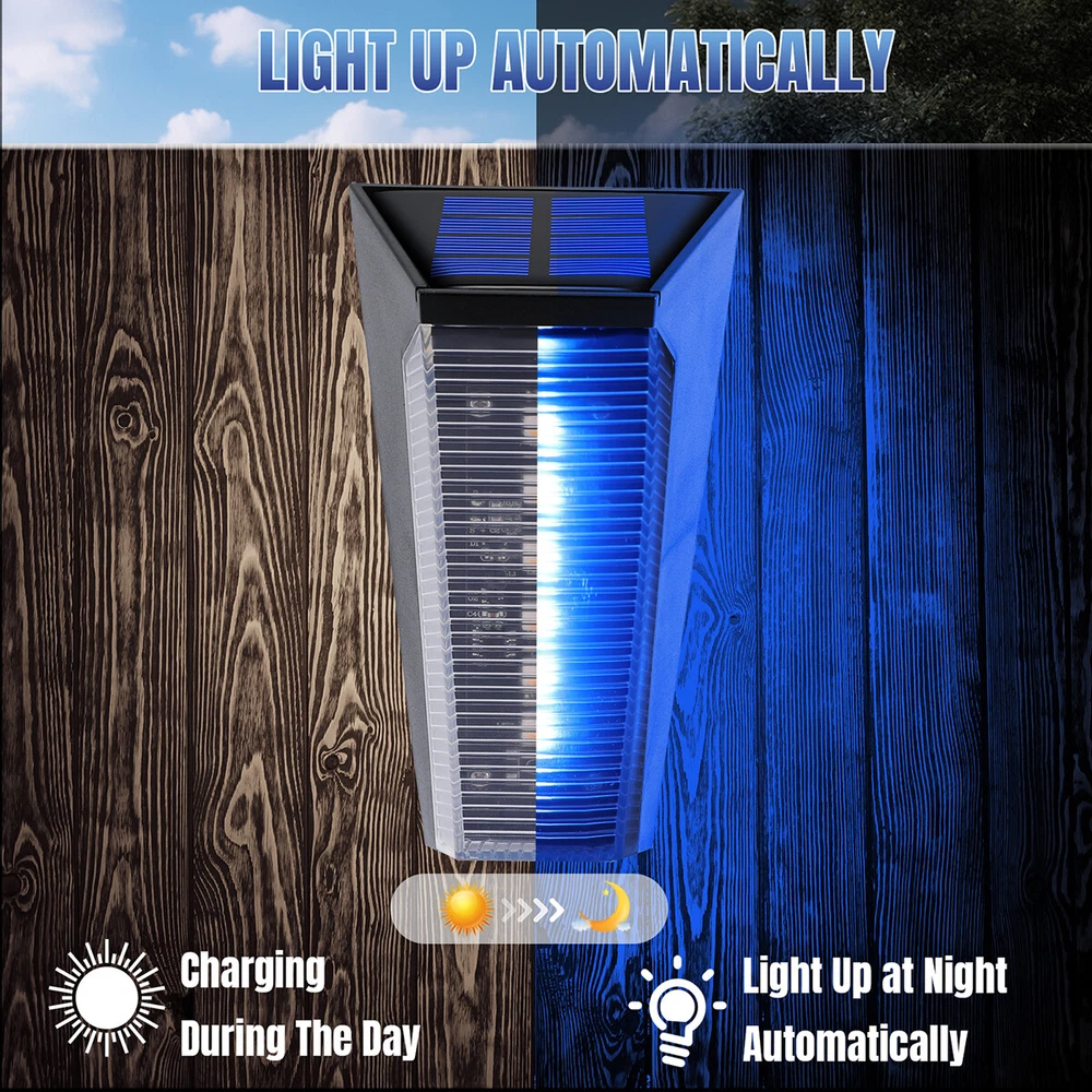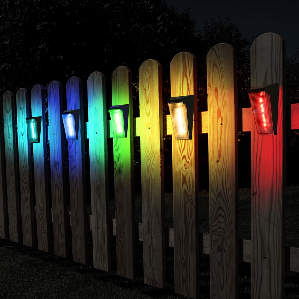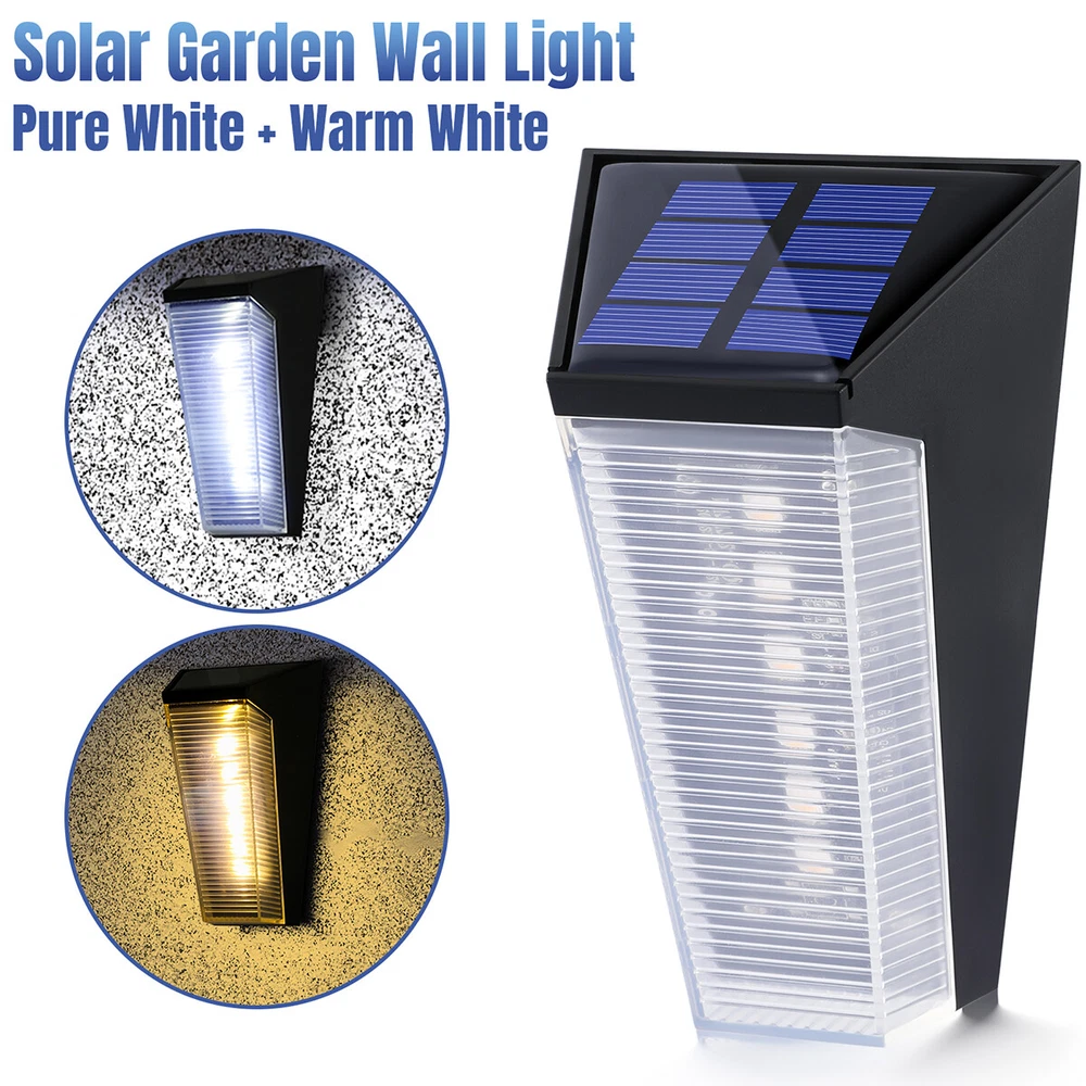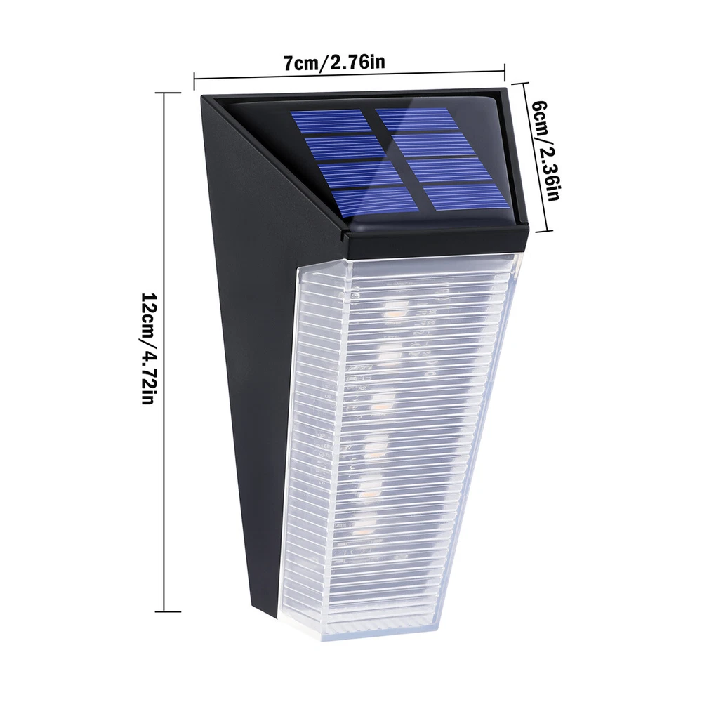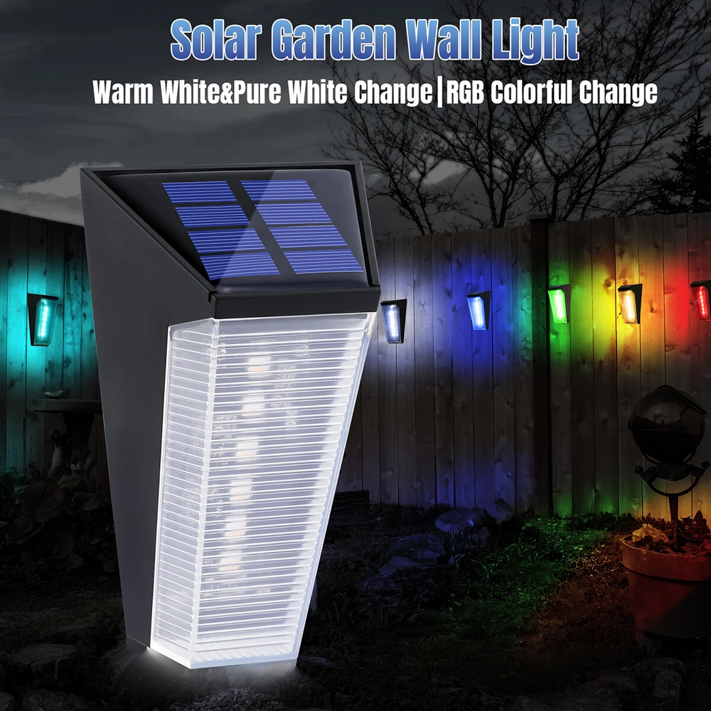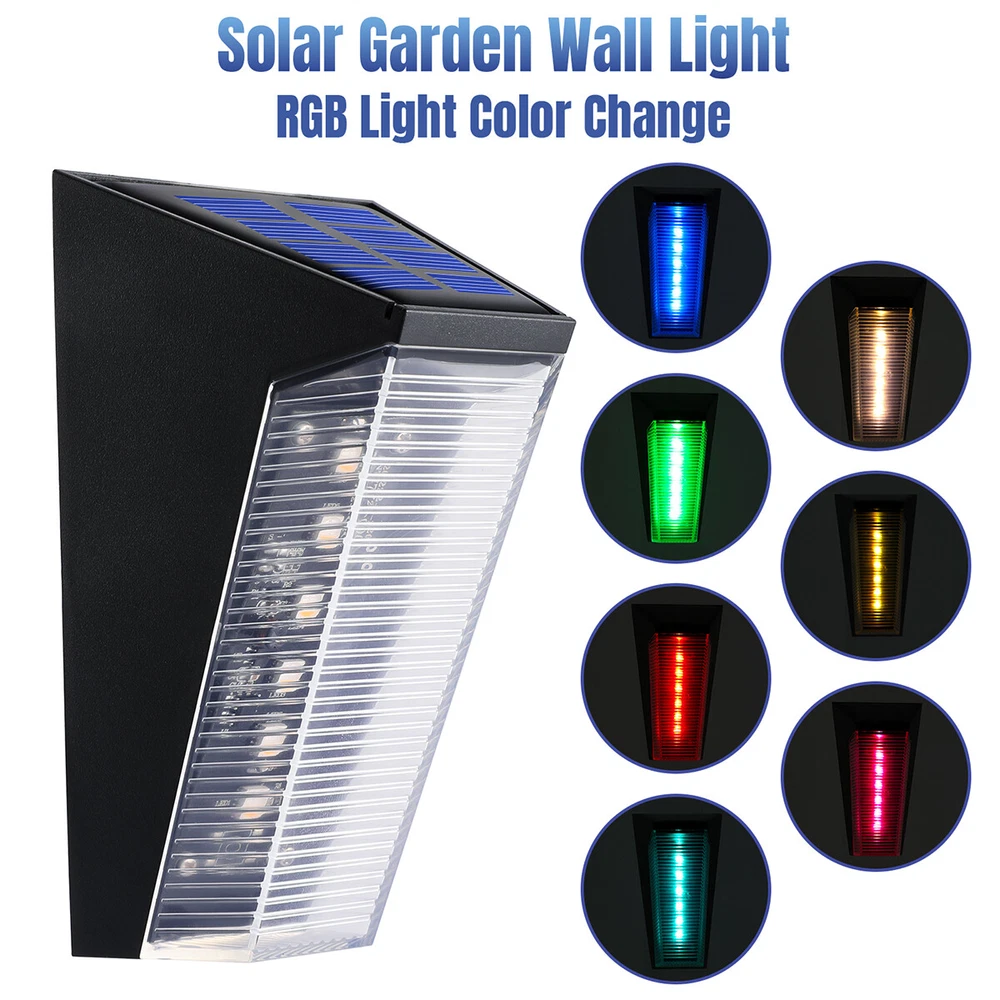 LED Solar Deck Lights Outdoor Garden Patio Pathway Stairs Step Fence Wall Lamp Product Feature 1.Solar Charging: The Solar Wall Light can be charged by solar energy, absorbing energy during the day and automatically lights up at night. 2.Outdoor Waterproof: The Solar Wall Light has IP55 waterproof rating, fearless of wind and rain, and can be used normally on rainy days. 3.ABS Material: The Solar Wall Light is made of ABS material with excellent impact resistance, which can effectively prevent damage due to accidental impact during use. 4.Intelligent Light Control System: Solar Wall Light adopts intelligent light control system, which can intelligently sense the change of external light and automatically turn on and off the light. 5.Easy to Install: Solar Wall Light is an independent power generation system, no need to lay complicated wires and cables, installation is more convenient and quick. [Warm Light + White Light] Working Mode: Solar Wall Light has 8 working modes, 1 speed white light, 2 speed warm light, 3 speed full mode cycle, 4 speed dual color fast cycle, 5 speed dual color slow cycle, 6 speed dual color gradient, 7 speed dual color fast cycle fast flash, 8 speed dual color mixed fast flash. Product Specification Solar Panel: polycrystalline silicon 2V*130mA Battery Parameters: Ni-MH AA 1.2V/600mA Voltage: 1.2V Power: 3W Light Source: Dual (2-color) *6 pcs warm/pure white LED ( 8 working modes ) 7 color change *6 pcs RGBW SMD ( 5 working modes ) Charging Method: solar charging Charging Time: >8 hours Working Hours: >8 hours Waterproof Grade: IP55 Switch Mode: hand control + light control Material: ABS Color: black Size: 6x7x12cm/2.36x2.76x4.72in Package Includes 2x Solar Wall Lights 2x Screws 2x Expansion Tubes