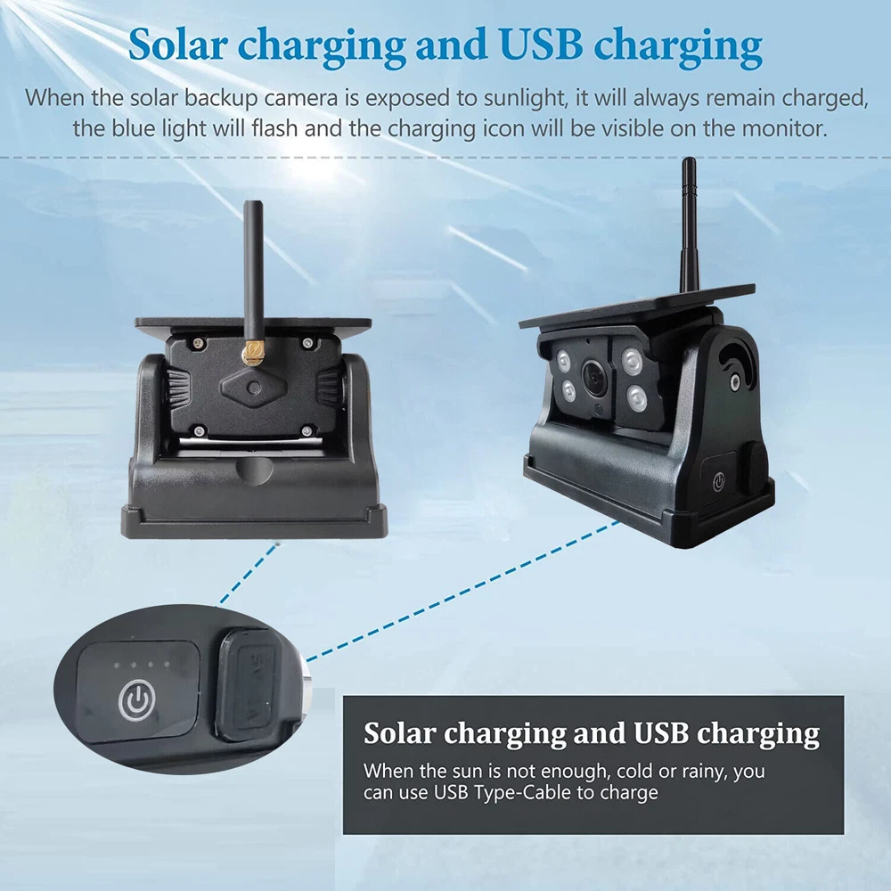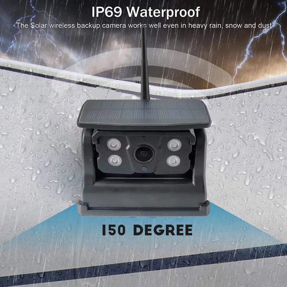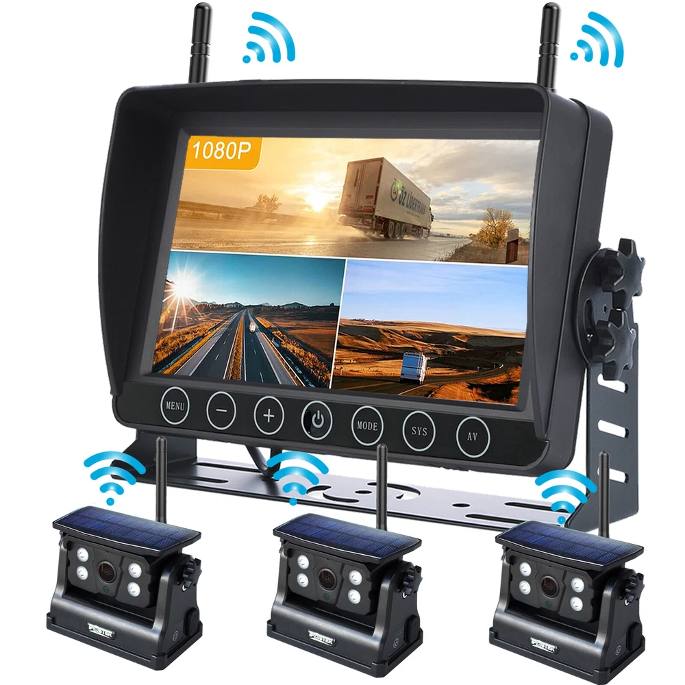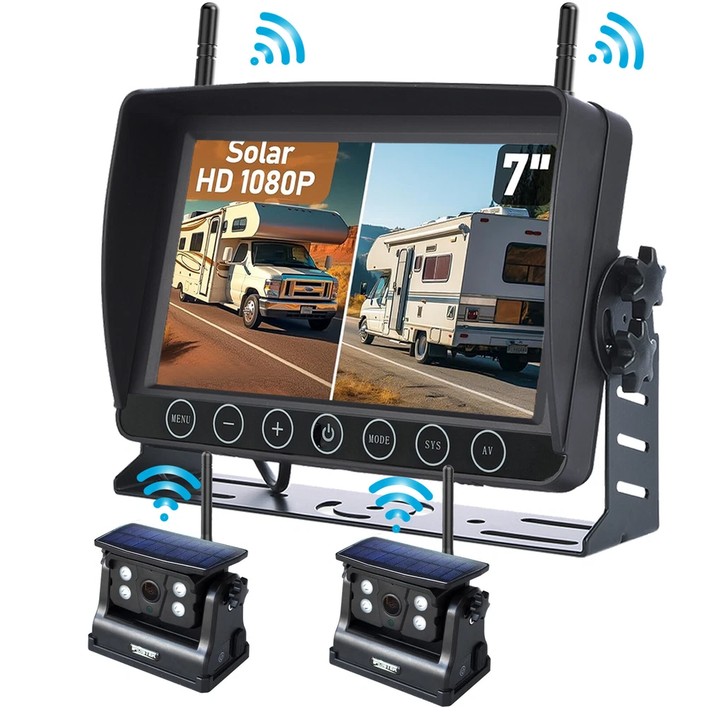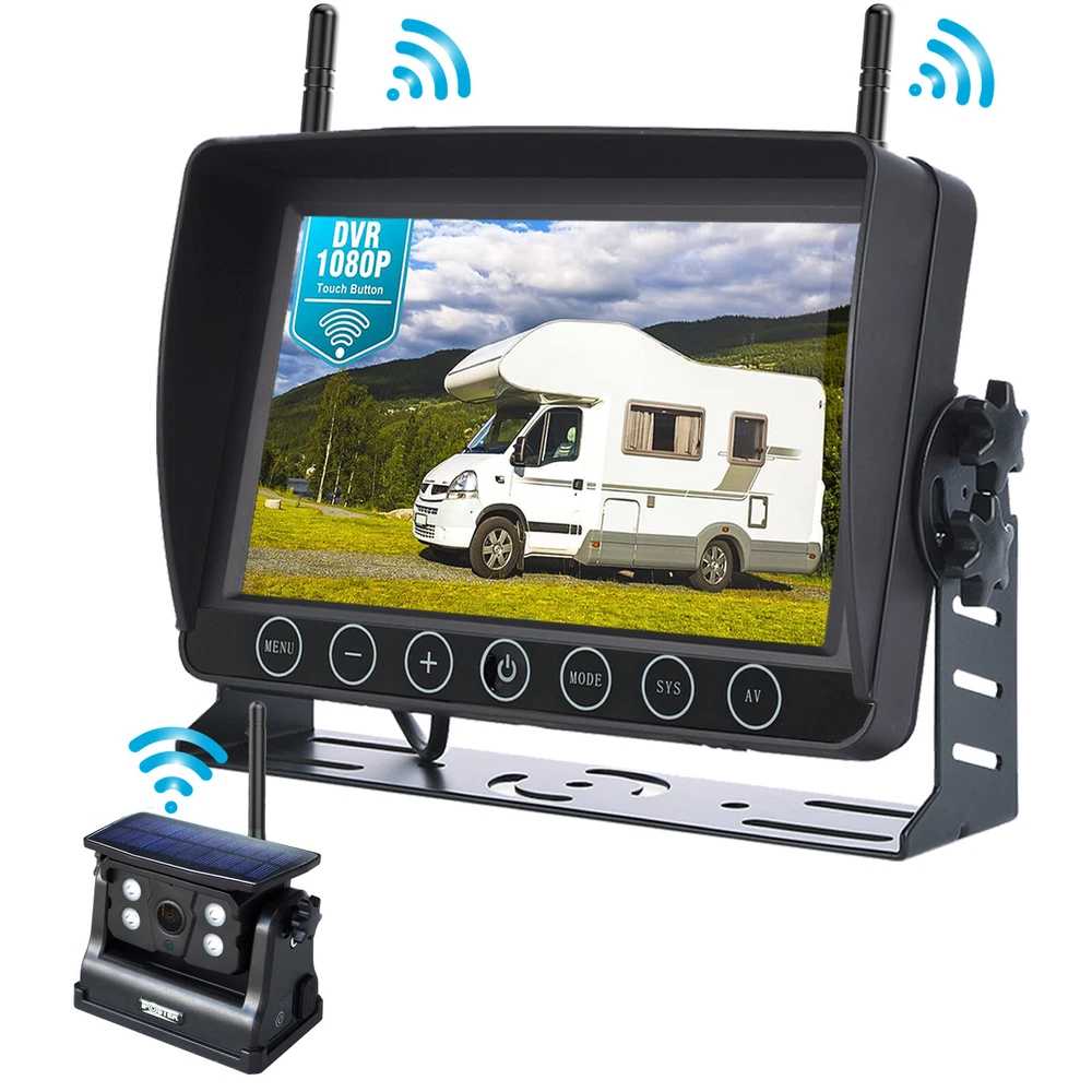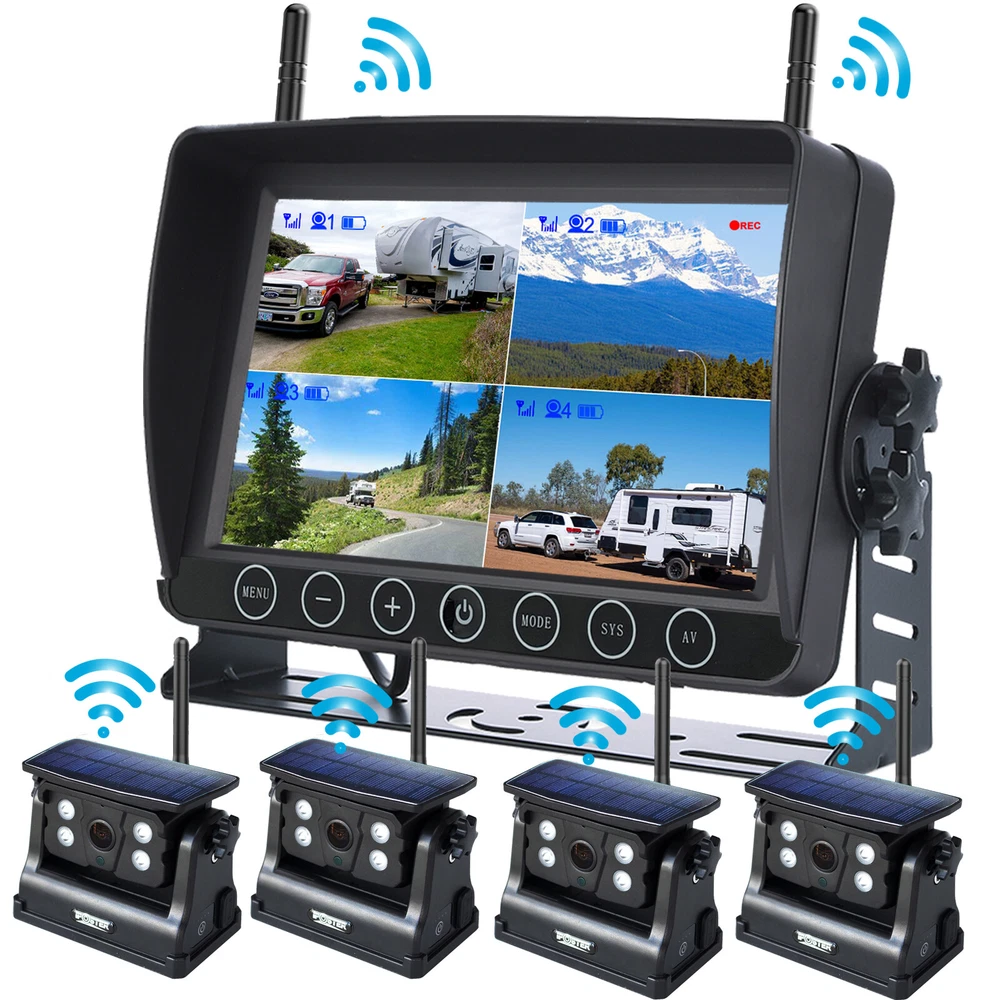 7" Solar Magnetic Digital Wireless 4 Channels Splitscreen Monitor with Built-in DVR-Loop Recording Max support 256GB Card (SD card is not inlcued)+ Wireless 1080P Backup Rear View Camera updated low-power consumption with Solar Panel / 9000mah Rechargeable Battery / 7 IR Leds Night Vision 150° Viewing DC12-36V For Truck Trailer RV Caravan Camper About this item: ► 【Latest Digital Signal】 RV backup camera with Unique digital signal dedicated dual antenna, power, transmission distance, stability, durability are improved by at least 50%. The rv car camera can send 1080P videos to the display via the stronger signal. The signal can reach 320ft in open area and working on vehicle range under135ft. ► 【4 CH 1080P Monitor】 The back up camera systems wireless with capacitive touch button sensor more durable and smoothly as well as extend the service life. It can add up to Four rear view camera/side view camera/front view camera. ► 【 Guideline 】 Trailer backup camera with super large HD 1080P 7" monitor. The image is super clear and any distortion is reduced to a minimum. Thus, you will get to enjoy a flawless parking and driving experience. The image could be flipped between mirror(rear view) and facing(front view). Backup lines optional to turns on/off. ► 【 Mirror / Flip image 】 The camera image can be set to mirror image or flip image mode. ► 【 Night Vision 】 Monitor back up camera system with 4 channels, up to 4 cameras can be added to the HD 1080P monitor. With 7 infrared lights. It has a wide viewing angle of 150 degrees. ► 【 Camera built in 9.5cm x 6cm solar panels 】 It can consectively generate power for the 9000mah battery, the camera also canbe recharged via type c port . Recharge battery even work on cloudy days. ► 【 Camera built in a magnetic base 】 Camera can suck on any steel surface strongly, you can easily move the portable camera to anywhere. ► Backup camera system can be use for Reversing/Rear view or full time constantly view, suitable for RV, 5th Wheel, Truck,Trailers, Campers, Bus and different type of vehicles. Monitor Features: Screen resolution: 1080P Screen type: IPS Screen Screen size: 7 inch Working voltage: DC12-36V Camera Features: Material: Alloy matel Resolution: 1080P Night Vision: 7 IR LED lights Solar Panel Size: 9.5cm x 6cm Battery Capacity: 9000mah Magnetic Base Size: 11cm x 7.4cm Waterproof: IP69 Working Voltage: DC12-24V Signal Coverage: 135ft apro. Package Included (1 camera and monitor kit): 1x 7" Digital Wireless Monitor 1x Solar Magnetic Battery Wireless Cameras 3x Antennas 1x USB Cigarette Light Adapter 1x Power Cable 1x Metal U-style Bracket 1x Type c Power Cable 1x Installation Kit 1x User Manual