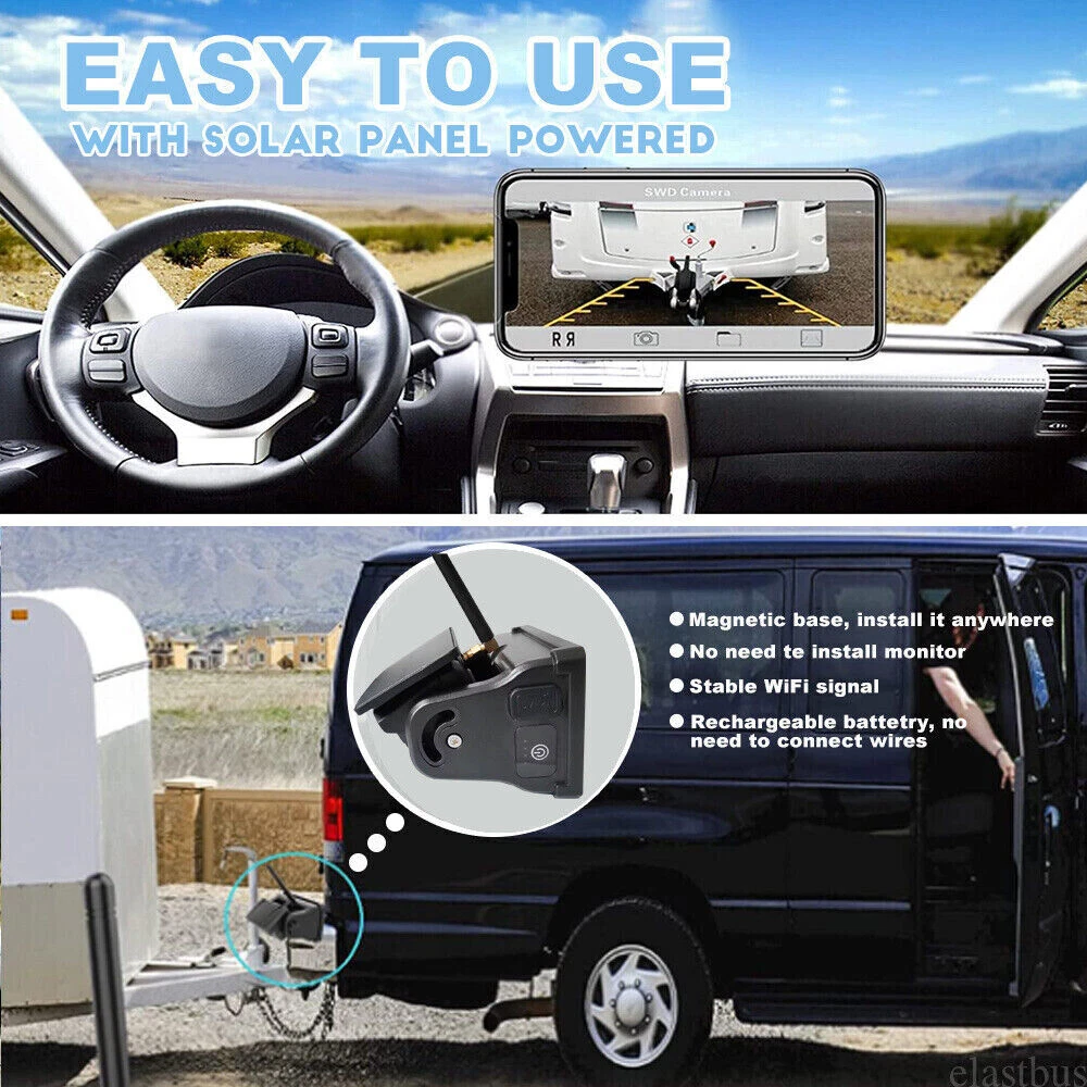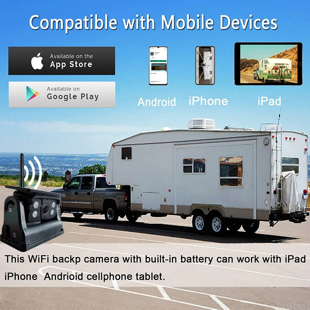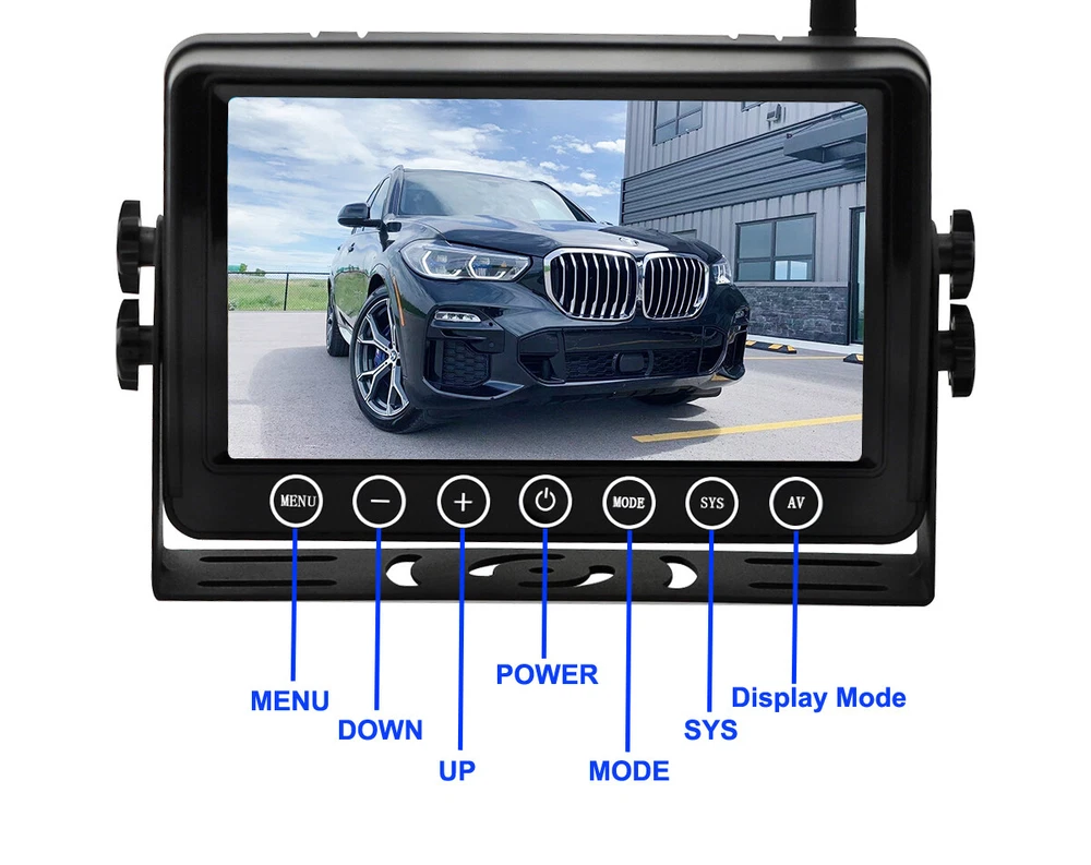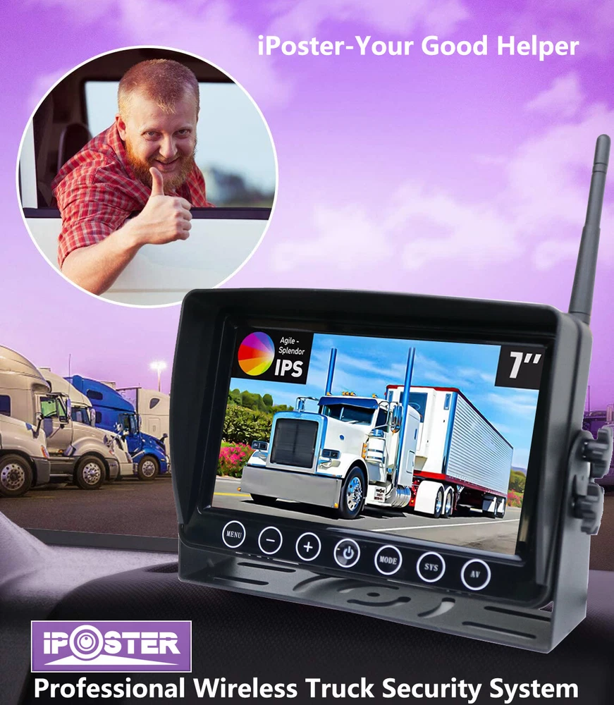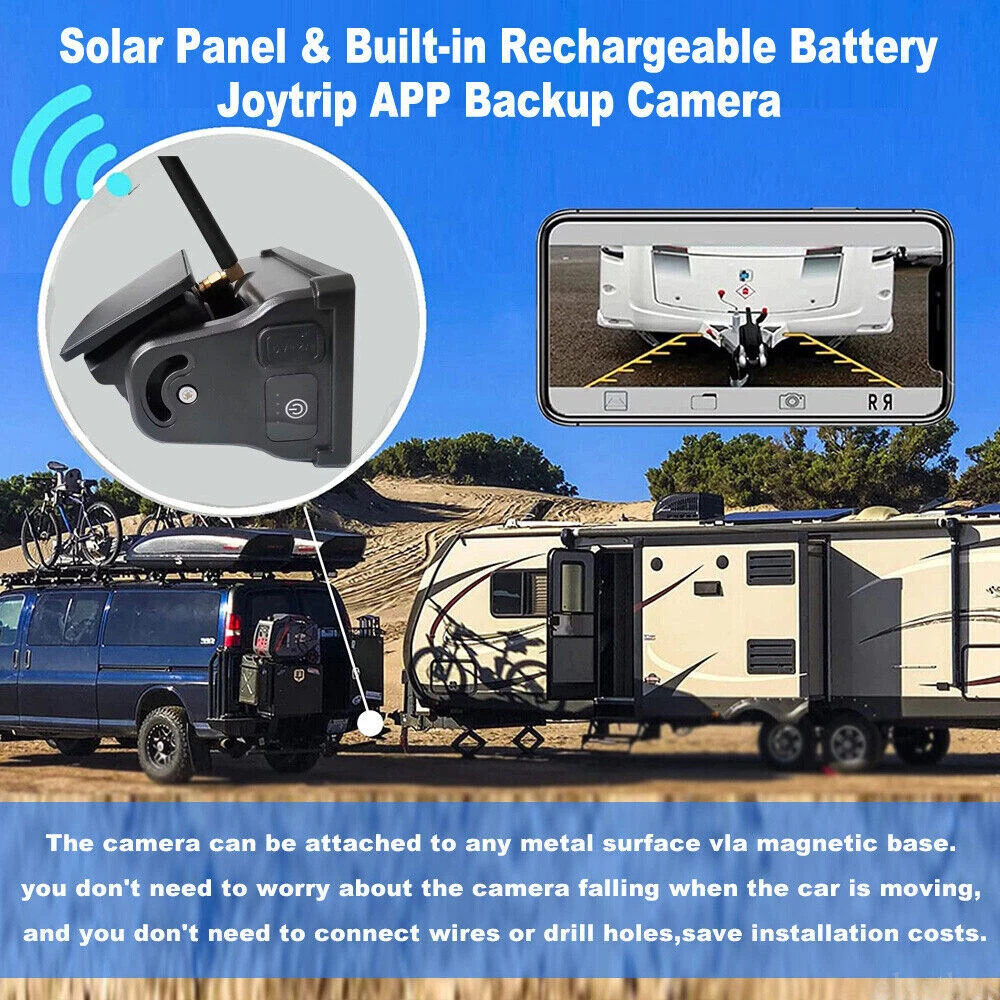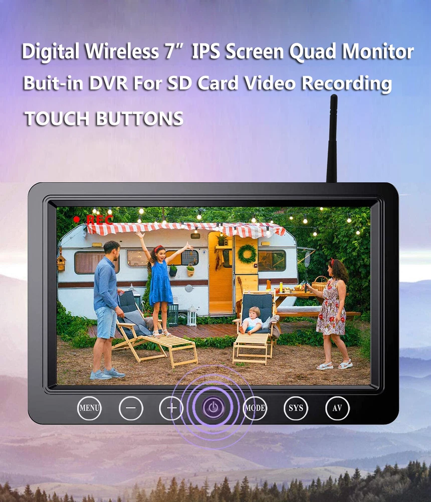 7" Solar Magnetic Digital Wireless 4 Channels Splitscreen Monitor with Built-in DVR-Loop Recording Max support 256GB Card (SD card is not inlcued)+ Wireless 1080P Backup Rear View Camera updated low-power consumption with Solar Panel / 9000mah Rechargeable Battery / 7 IR Leds Night Vision 150° Viewing DC12-36V For Truck Trailer RV Caravan Camper About this item: ► 【Latest Digital Signal】 RV backup camera with Unique digital signal dedicated dual antenna, power, transmission distance, stability, durability are improved by at least 50%. The rv car camera can send 1080P videos to the display via the stronger signal. The signal can reach 320ft in open area and working on vehicle range under135ft. ► 【4 CH 1080P Monitor】 The back up camera systems wireless with capacitive touch button sensor more durable and smoothly as well as extend the service life. It can add up to Four rear view camera/side view camera/front view camera. ► 【 Guideline 】 Trailer backup camera with super large HD 1080P 7" monitor. The image is super clear and any distortion is reduced to a minimum. Thus, you will get to enjoy a flawless parking and driving experience. The image could be flipped between mirror(rear view) and facing(front view). Backup lines optional to turns on/off. ► 【 Mirror / Flip image 】 The camera image can be set to mirror image or flip image mode. ► 【 Night Vision 】 Monitor back up camera system with 4 channels, up to 4 cameras can be added to the HD 1080P monitor. With 7 infrared lights. It has a wide viewing angle of 150 degrees. ► 【 Camera built in 9.5cm x 6cm solar panels 】 It can consectively generate power for the 9000mah battery, the camera also canbe recharged via type c port . Recharge battery even work on cloudy days. ► 【 Camera built in a magnetic base 】 Camera can suck on any steel surface strongly, you can easily move the portable camera to anywhere. ► Backup camera system can be use for Reversing/Rear view or full time constantly view, suitable for RV, 5th Wheel, Truck,Trailers, Campers, Bus and different type of vehicles. Monitor Features: Screen resolution: 1080P Screen type: IPS Screen Screen size: 7 inch Working voltage: DC12-36V Camera Features: Material: Alloy matel Resolution: 1080P Night Vision: 7 IR LED lights Solar Panel Size: 9.5cm x 6cm Battery Capacity: 9000mah Magnetic Base Size: 11cm x 7.4cm Waterproof: IP69 Working Voltage: DC12-24V Signal Coverage: 135ft apro. Package Included (1 camera and monitor kit): 1x 7" Digital Wireless Monitor 1x Solar Magnetic Battery Wireless Cameras 3x Antennas 1x USB Cigarette Light Adapter 1x Power Cable 1x Metal U-style Bracket 1x Type c Power Cable 1x Installation Kit 1x User Manual