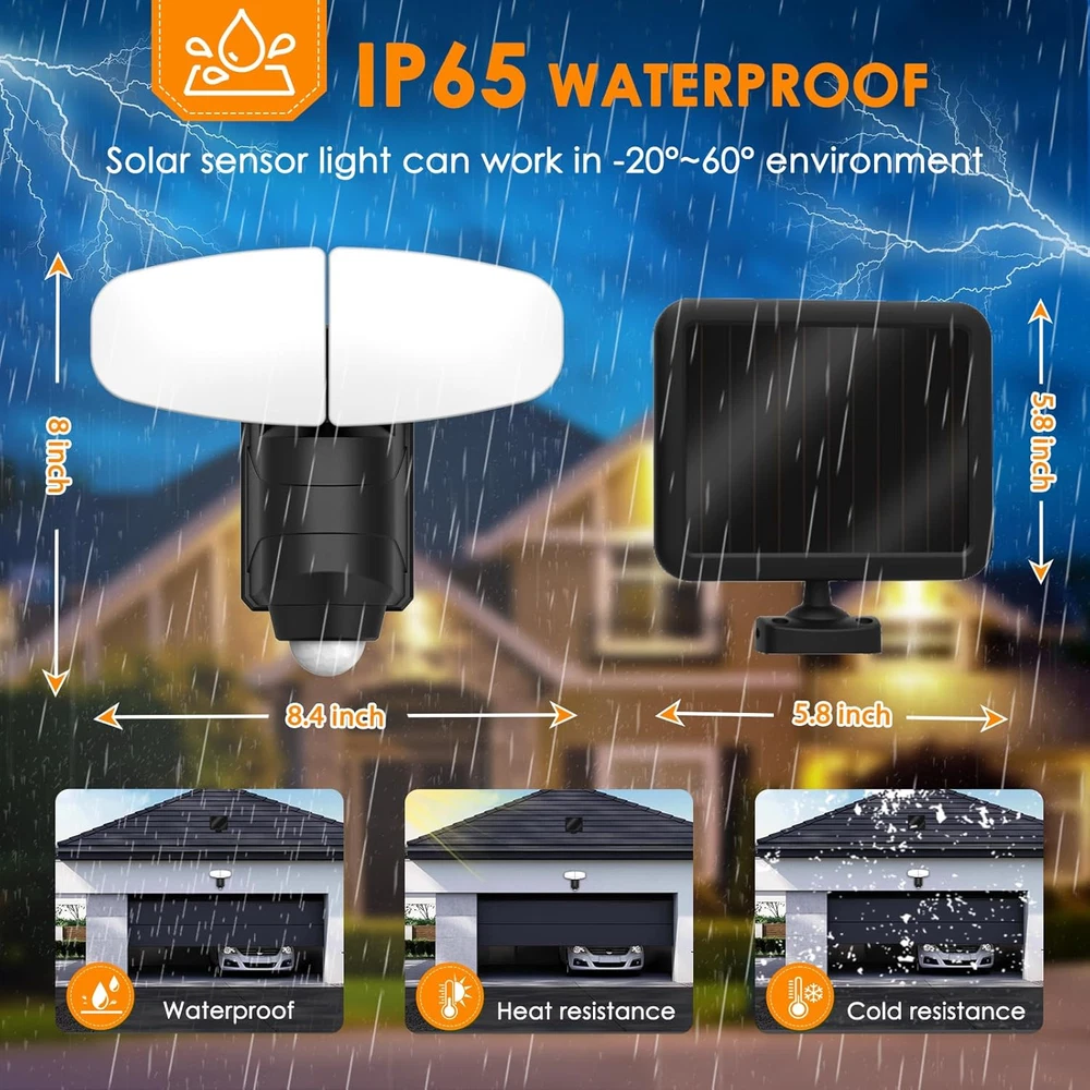 【Second Generation Upgraded LED】-The solar motion lights outdoor equipped with excellent quality bright SMD LED 2835 model beads that produce up to brightness output and good heat dissipation with less LED beads. 【New design lampshade】-Using advanced ABS material, the light effect is bright and soft, and it is not afraid of children looking directly at it. 【PIR Motion Sensor that Can Sense】-When you use it for the first time, turn on the white switch button. [ON] Turns on the automatic sensing function. The Motion Sensor Outdoor Lights will auto turn ON at dusk/night when a person passes through sensor range, and the solar light will turn off after adelay of 30 seconds when no movement detected. The solar light will automatically turn off during the day, no need to operate the switch button again, bringing convenience to your life. 【2 Heads Adjustable Design】-The 2 solar security light with 90°adjustable illumination angle and 120° detection angle, with a sensing distance of up to 26ft. Adjustable to different angles according to your daily needs, bringing extra security to your home. 【Large Battery and IP65 Waterproof】-The solar flood lights outdoor with High-strength ABS provides a higher heat dissipation efficiency. IP65, fully enclosed, no dead angle waterproof technical design, specially designed for extreme weather. 1800mAh large battery capacity, intelligent light control sensor chip, and solar panels up to 21% conversion rate make its lifespan reach 60,000+ hours. Product Description 1 Lighting Mode 2 lP65 Waterproof 1 Yard 2 Garage 3 Garden YITGOG Outdoor Motion Sensor Light Types Add to Cart Add to Cart Add to Cart Add to Cart Add to Cart Add to Cart Add to Cart Customer Reviews 4.3 out of 5 stars 51 4.3 out of 5 stars 51 4.3 out of 5 stars 51 4.3 out of 5 stars 51 4.3 out of 5 stars 51 4.3 out of 5 stars 51 4.3 out of 5 stars 51 Price $14.24 $ 14 . 24 $13.49 $ 13 . 49 $14.24 $ 14 . 24 $21.59 $ 21 . 59 $35.99 $ 35 . 99 $29.99 $ 29 . 99 $53.99 $ 53 . 99 Number of products 2Pack 1 Pack 2 Pack 1 Pack 2 Pack 1 Pack 2 Pack LED 80 12 12 108 108 256 256 LM 1000 750 750 800 800 1000 1000 Source of Power Solar Powered Powered by 4 D-Cell Batteries Powered by 4 D-Cell Batteries Solar Powered Solar Powered Solar Powered Solar Powered Overall Product Size 8.4*8inch 4.5*3.93inch 4.5*3.93inch 5.9*4.52 inch 5.9*4.52 inch 13.4*3.14 inch 13.4*3.14 inch
