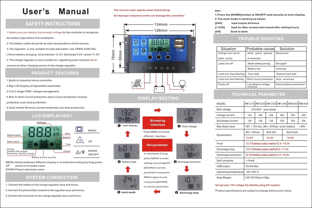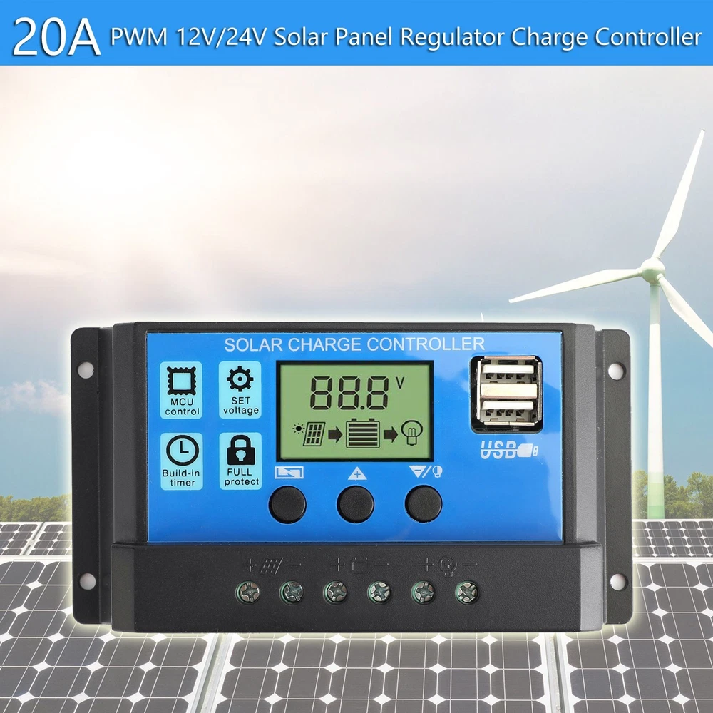 You may also like 50A 12V 24V 48V Solar Charge Controller With Wifi Monitor PWM LCD Regulator USA 69.85 USD Free shipping PWM 10-60A 12V 24V 48V Solar Charge Controller For Lifepo4 Lead Acid Gel 50.85 USD Free shipping 60A 12V/24V Solar Panel Battery Regulator Charge Controller PWM 4-Stage Dual USB 15.85 USD Free shipping 400W/120V IP60 Waterproof Solar Inverter Grid Tie MPPT Micro Inverter w Display 193.85 USD Free shipping MPPT PWM Solar Charge Controller Charger 12V/24V/48V with Color LCD Display US 26.85 USD Free shipping 60A MPPT Bluetooth APP Solar Charge Controller Charger Fits 12V-60V Battery Blue 38.85 USD Free shipping Solar Charge Controller PWM 12V Build In Timer Battery Control Adapter Black 12.85 USD Free shipping 12V/24V/36V/48V/60V 30A MPPT Wind Solar Hybrid Charge Controller Panel USB US 93.85 USD Free shipping PWM 60A 12V 24V 48V Solar Charge Controller For Lifepo4 Lead Acid Gel Battery 81.85 USD Free shipping 600W/700W Solar Inverter Grid Tie MPPT Micro Inverter APP Control with Display` 103.85 USD Free shipping PWM 40A Solar Battery Regulator Charge Controller 12V 24V 4-Stage Dual USB 13.85 USD Free shipping 1000W/220Vac IP60 WiFi Solar Inverter Grid Tie MPPT Micro Inverter APP Control 236.85 USD Free shipping 20A Solar Panel Battery Regulator Charge Controller PWM LCD Dual USB 12V/24V The Specifications: 1. Rated Voltage: 12V/24V Auto 2. Charge Current: 20A 3. Discharge Current: 10A 4. Application: Solar System Controller 5. Size: 150*78*35mm 6. Weight: 150g 7. USB Output: 5V/2A MAX 8. Operating Temperature: -35~+60℃ Safety Instructions: 1.Make sure your battery has enough voltage for the controller to recognize the battery type before first installation. 2.The battery cable should be as short as possible to minimize loss. 3.The regulator is only suitable for lead acid batteries: OPEN,AGM, GEL it is not suited for nickel metal hydride, lithium ions or other batteries. 4.The charge regulator is only suitable for regulating solar modules. Never connect another charging source to the charge regulator. With Timer and light sensor,it could work for solar light system. Only For off-Grid PV Solar System. Product Features: 1.Build-in industrial micro controller. 2.One-key setting,digital display,auto memory function. 3.Fully 4-stage PWM charge management. 4.Build-in short-circuit protections,open-circuit protections,reverse protections,over-load protections 5.Dual mosfet Reverse current protections ,low heat productions. System Connection: 1.Connect the battery to the charge regulator - plus and minus.it will show 1 ,if it detects 12V battery, 2 if it detects 24V battery. 2.Connect the photovoltaic module to the regulator - plus and minus. 3. Connect the consumer to the charge regulator - plus and minus. The reverse order applies when deinstalling! An improper sequence order can damage the controller! Note: Please allow 0-2mm error due to manual measurement. pls make sure you do not mind before you bid Due to the difference between different monitors, the picture may not reflect the actual color of the item. Thank you! Package included: 1x Solar panels Battery Charge Controller(Type as your choosed) 1 x User Manual -About US Founded in 2012, VIPJQ have professional development and sales, and are involved in various products, providing customers with various high-quality products. Since its establishment, VIPJQ has always adhered to the service concept of "customer first" and the management concept of "pursuit of quality", and is committed to providing customers with high-quality original designs. We commit to provide you the best innovative, quality products & professional services with competitive prices. We value every customer, and we look forward to providing solutions for your business needs to help your business achieve its goals, please contact us immediately! We are all about you! We are a Japanese seller,but with large warehouse in USA. We are profesional on Auto Parts,Car Parts,Motorcycle Parts,3C,other hot sale items and so on. We aim to provide to customers high quality product and best service. -About Shipment&Returns The item usually will be dispatched within 3 days after you ordered.All are free shipping. And it usually takes 3-10 working days to delivery depends on buyers' address or other majeure on the way. If you are not satisfied with the items and want to return the item,we hope you could message us first,we will give you the return details, we think we could give you the best service to save your time and money.Thank you. -About Feedback&Customer Service If you are enjoy your shopping here,not only enjoy the items but also the service,we are appreciate you could give us a 5-star feedback. If you are not satisfied with the item,before you give us the negative feedback,we hope we could give you the best solution through our commutication. We think we could do it if you give us the chance.Thank you.