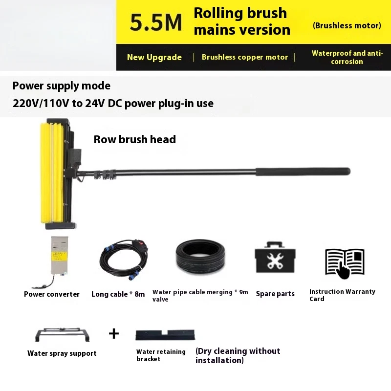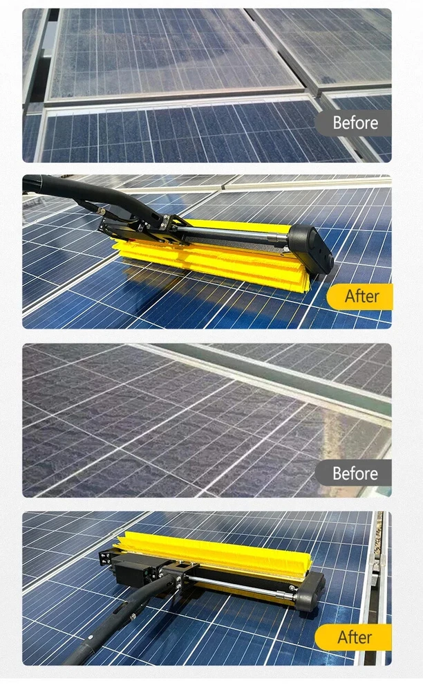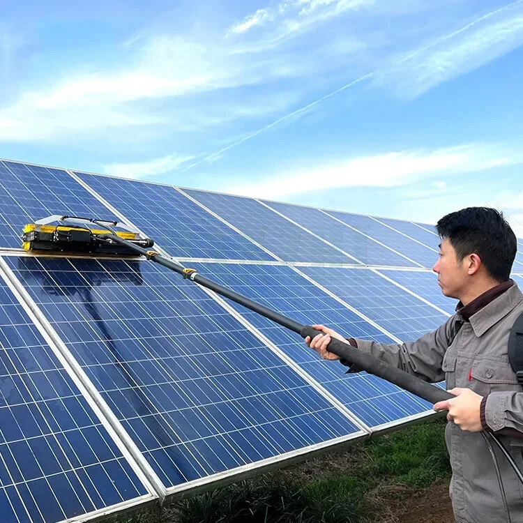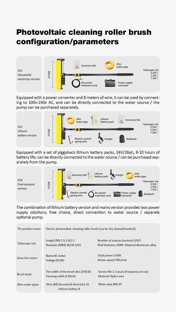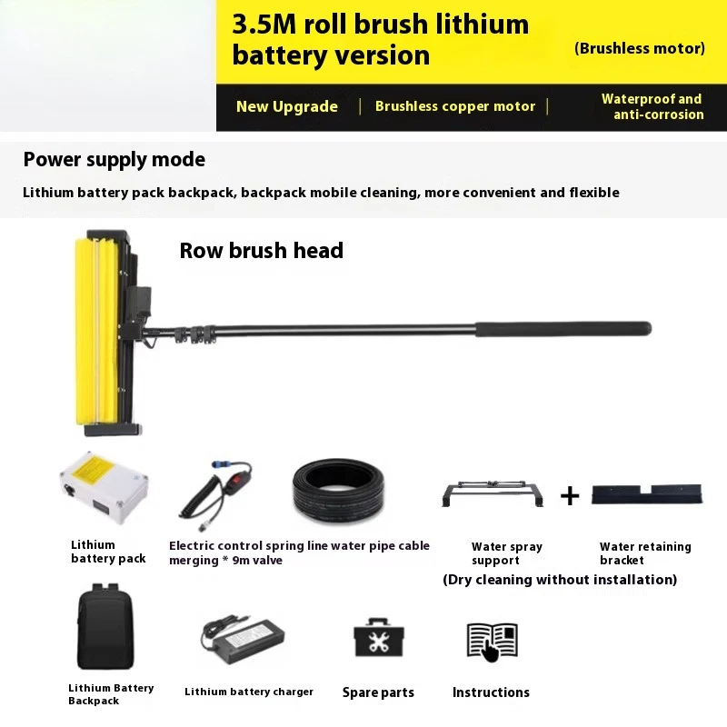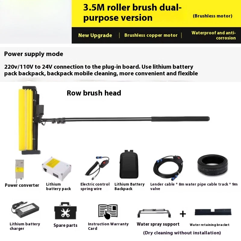 solar cleaner robot Panel Electric Cleaning Bru sh panel cleaning tools cleaner brush Motor speed 700r/min The motor power 150 watts The motor voltage 24v Rod length 3.5/5.5/7.5 Pipe diameter 35/40/40 The length of the wire 16 Length of water pipe 20 The power supply mode 220V mains/lithium batter The battery voltage 24v Lithium battery capacity 26 ah The battery 8 to 10 hours Use your time 4 to 5 hours Brush materials New nylon yarn Cleaning width 60 cm Application Details Images