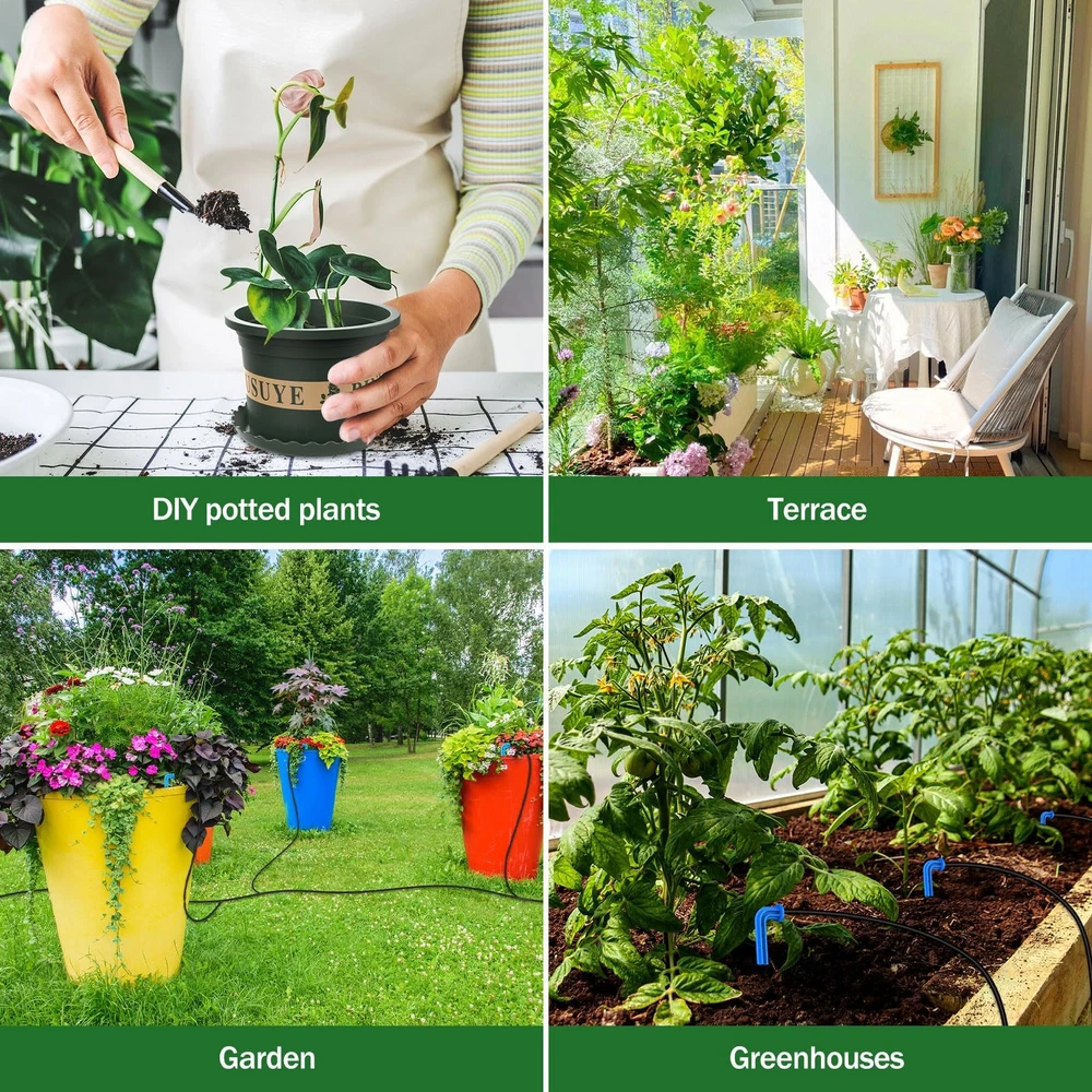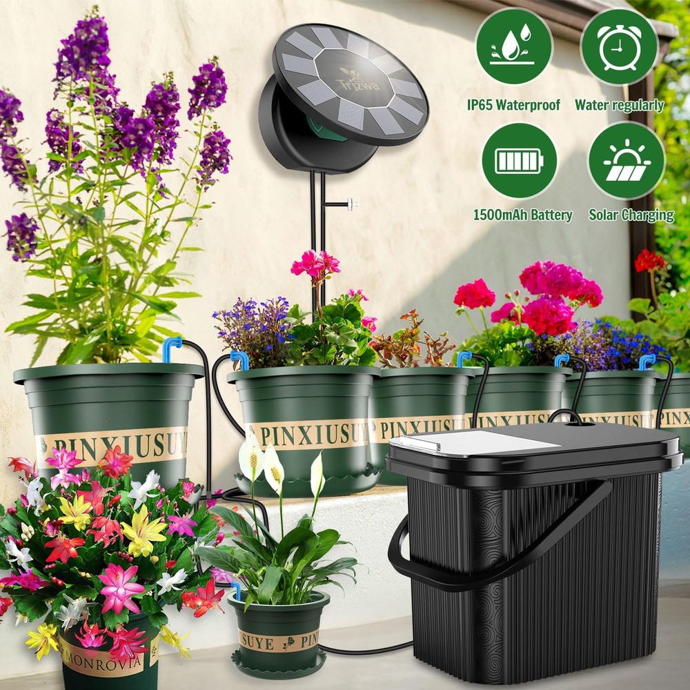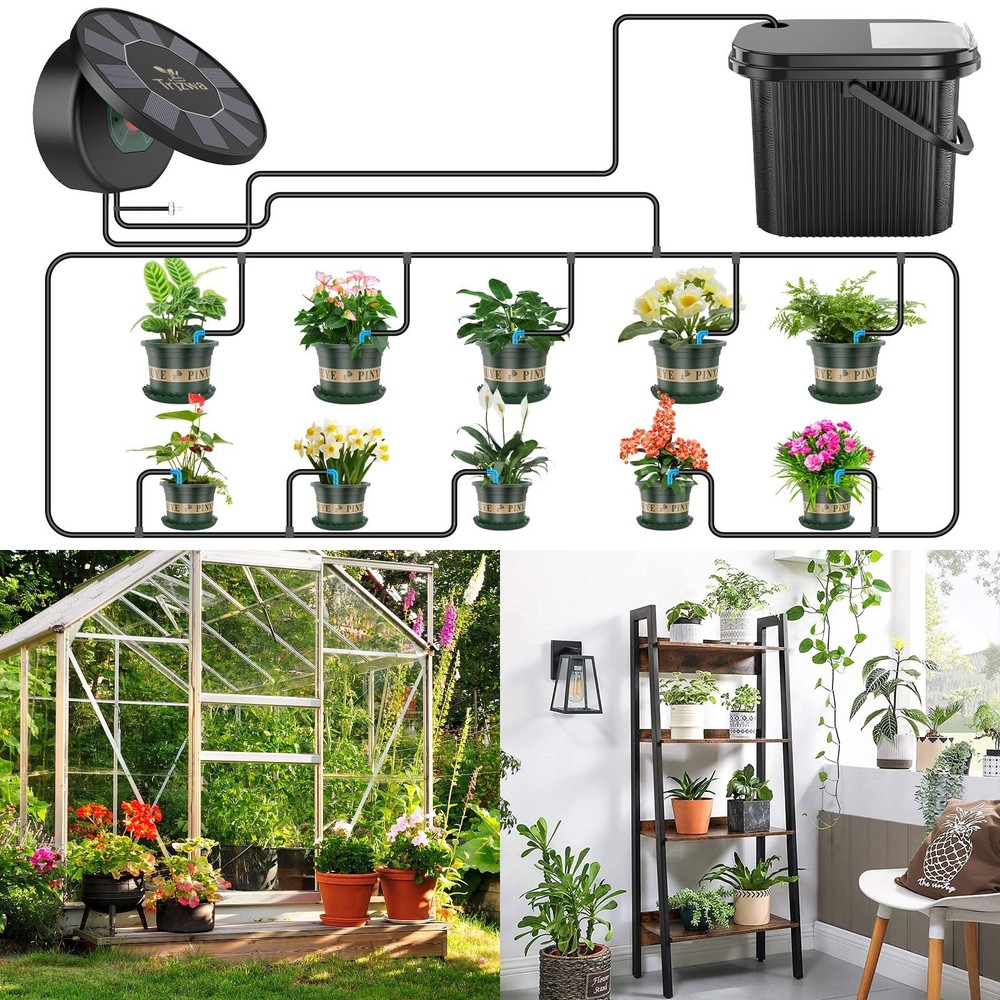Brand: Model: BSV-IC301S Material:Anti-UV Plastic Power Source:solar power Water Duration: 1,5,10,15mins Watering Frequency:1,3,7days Components:1 Solar Panel and Timer Controller integration kit,10 meters of Water Hose,10 Irrigation Drippers,10 Tee Head, 1 Anti-Siphon, 1 Filter, 2 Screw kits Waterproof:IP65 Water Hose Length:10 meters Package Size:10.94x8.94x8.94inch Package weight: 3.53lb Warranty description: 1 year Color: Black Product use: For indoor/outdoor watering. Model: BSV-IC301S Solar Automatic Drip Irrigation System Kit.This smart irrigation controller has a wide range of applications and is ideal for lawns, gardens, patios, greenhouses, flower beds and more. 【Solar-Powered Plant Watering】Solar Panel and Timer Controller Integrated Irrigation System Kit is designed for indoor, garden, balcony, patio and other scenarios where there is no water or power supply to irrigate, made of IP65 waterproof and Anti-UV material for indoor and outdoor garden drip irrigation system. The solar panel is adjustable in angle to get enough sunlight and convert it into electricity for the automatic drip irrigation system. 【Ample Gardening Planting Kit】Includes solar drip irrigation system and its accessories, 4.5 inches and 6 inches pots 10 pcs, with bottom bracket, and a 3.5 gallon capacity square bucket with handles, you can put your gardening tools inside the bucket, convenient for you to carry and storage tools, open lid design is convenient for you to get the tools inside the bucket 【Customizable Watering Schedules】The Solar Drip Irrigation Kit System comes with a timer that allows you to set a specific watering schedule. The timer controller is easy to operate, set the watering time (1 minute, 5 minutes, 10 minutes, 15 minutes) and intervals (1 day, 3 days, 7 days) to water your plants automatically and you can program the system to irrigation your plants at the optimal time even when you are not at home 【Prevents Overwatering】Automatic drip irrigation system kits deliver water directly to plant roots, providing slow, controlled watering that allows the soil to gradually absorb the water, thus reducing the risk of over-watering. Meanwhile water waste can be avoided by 70% compared to traditional manual watering 【Travel Without Worries】The solar drip irrigation system uses solar panels to charge and it can continue to work on cloudy days after it is fully charged. Simply prepare enough water and choose the number of drippers and customize the watering frequency according to your plants' needs, and you're ready to enjoy your long vacation