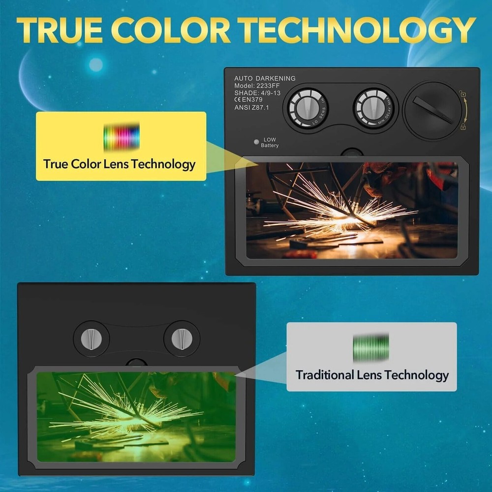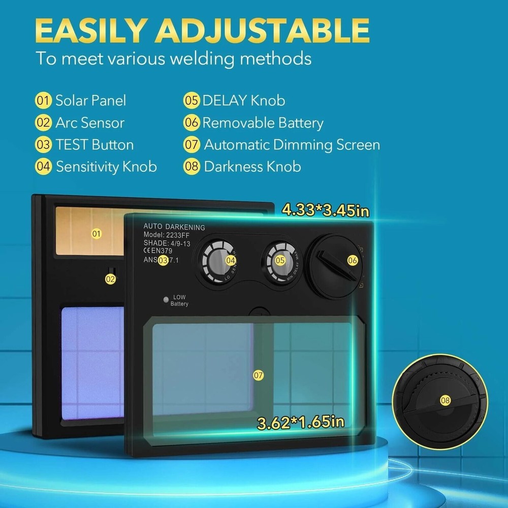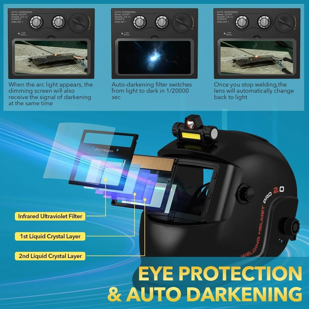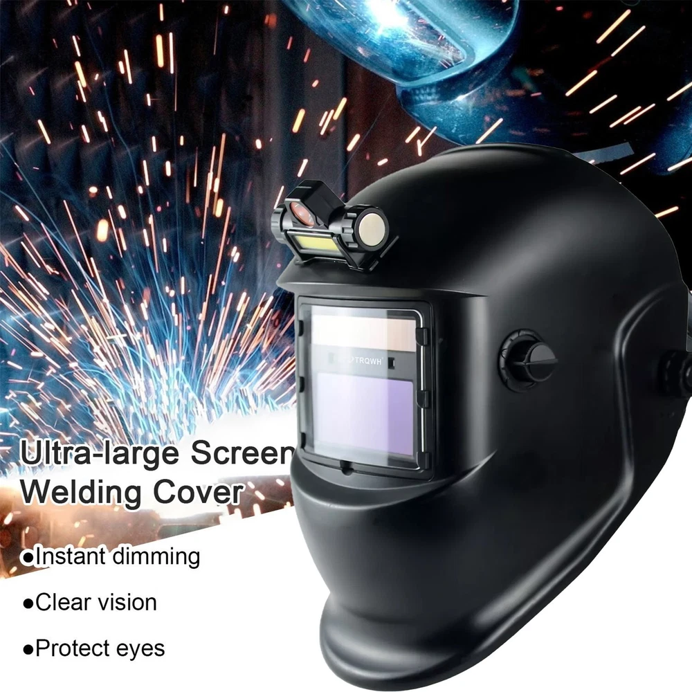 Features: 1. High quality materials: This product uses high toughness polycarbonate material, which is resistant to drops, impacts, splashes, and is not easily deformed, effectively protecting the face. 2. True color field of view: Intelligent dimming welding face mask, true color large screen, restoring real scenes, clearer vision, less eye burden, can adapt to fine operations, avoid arc welding glare to harm the eyes, and provide comprehensive protection. 3. Intelligent dimming: Using intelliagent sensitive filters, automatically dimming, instantly dimming for 0.1 seconds during welding, with adjustable shading effect, suitable for various environments. Instantly automatic light change, capturing welding light when the light change screen automatically dims, achieving eye protection effect. 4. 180 ° Flip: It can be freely flipped up and down by 180 °, providing comfortable and efficient work. It can be used for welding gaps or long-term use. And it can save storage space. 5. Wearable design: The wearable design has a large space between the face and the facial screen, which is refreshing and breathable, and is about 100 millimeters away from the face. It is lightweight, breathable, without stuffiness or pressure, and will not feel fatigued when worn for a long time. 6. Detachable design: The headlight is easy to install or disassemble, and can be adjusted to a 90 ° angle according to environmental needs, making it easy to work in the dark. It is suitable for welding, argon arc welding, etc. Parameters: Product Name: Automatic Dimming Welding Mask Material: PC Item size: 255 * 170 * 280 millimeters/10.04 * 6.69 * 10.2 inches Weight: 340g Thickness: 2mm Light blackout: 9-13 levels Scope of use: Widely used for welding The packaging includes: 1 x Auto Darkening Welding Helmet/Hood/Mask 1 x Welding Helmet Lens Cover/Protector Replacement (Outer) 1 x Welding Helmet Lens Cover/Protector Replacement (Inner) 1 x Welding Helmet LED Light 1 x User Manual