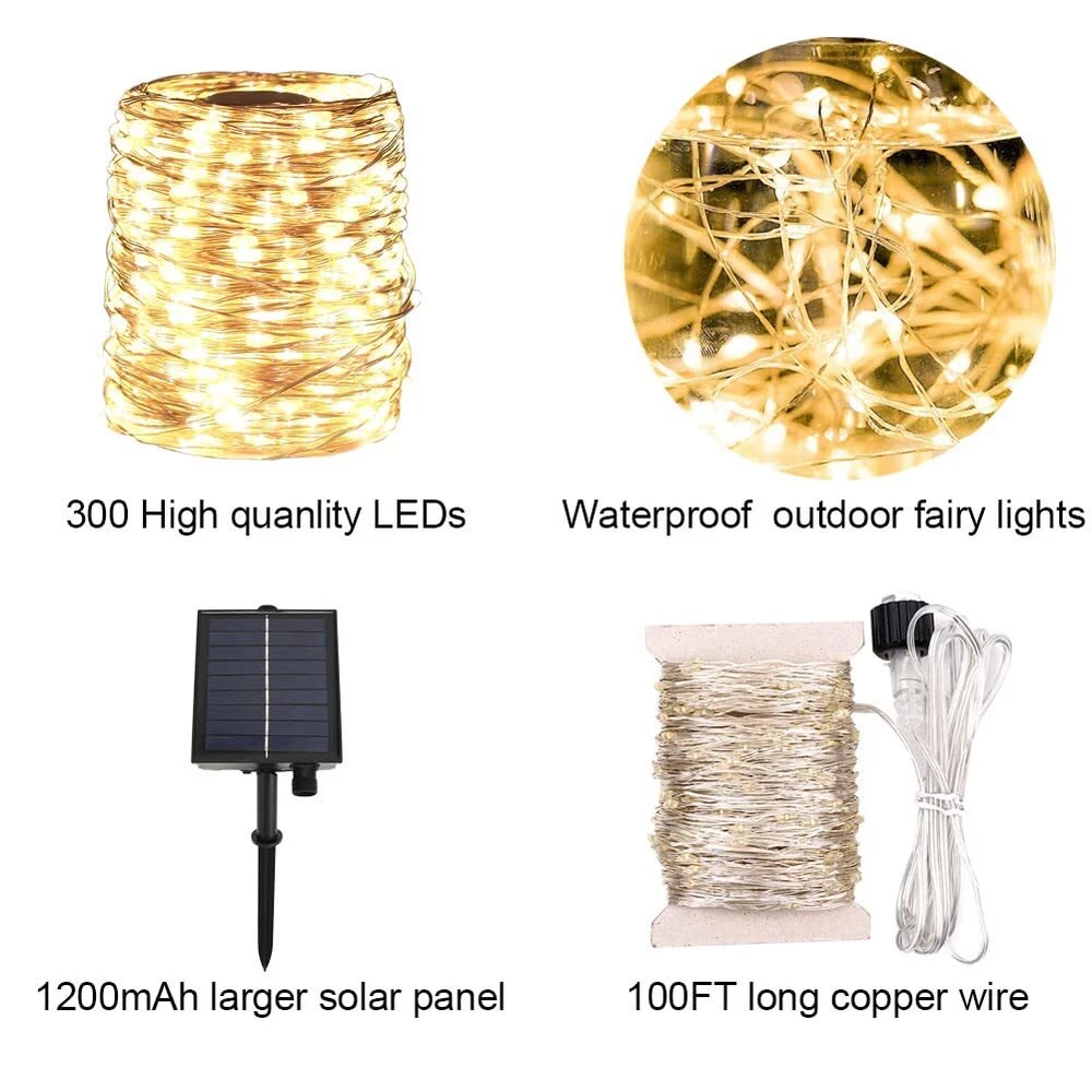Eco-friendly & Energy-saving: The solar string lights are powered with a built-in rechargeable 1200 mAh battery,which has large capacity for whole night lighting require.the string light will automatic illuminate at dark and off at dawn,work up to 12 to 18 hours after full charge.Adopting high-efficiency solar panels,it automatically absorbs sunlight and converts it into electricity during the day, no external power supply is needed, energy saving and emission reduction Continuous Shining Day and Night: Advanced battery technology ensures sufficient power, even on cloudy days can continue to shine, up to 8 hours of lighting time at night, allowing you to enjoy a warm night 8 Lighting Modes: The string lights outdoor waterproof create different aesthetic atmosphere with various light modes: Combination, in waves, sequential, slow glow, chasing/flash, slow fade, twinkle/flash, and steady-on Waterproof & Durable: IP44 waterproof design, no fear of rain, suitable for outdoor gardens, terraces, balconies and other environments, all year round, anytime and anywhere for you to light up.And the string lights also have good weather resistance and are able to work stably in a variety of climatic conditions, including high and low temperatures, humidity and sandy environments. This makes LED string lights perfect for outdoor decoration and lighting Bendable Copper Wires(Silver Color Wires): The solar fairy string lights inclued 3-copper wires.Extra long bendable copper wire could be shaped into any symbols.No need for complicated wiring, just fix the solar panel in the direct sunlight, hang the light strings at will, and start your eco-lighting journey instantly.With light weight and small size, it is portable and convenient for camping and traveling