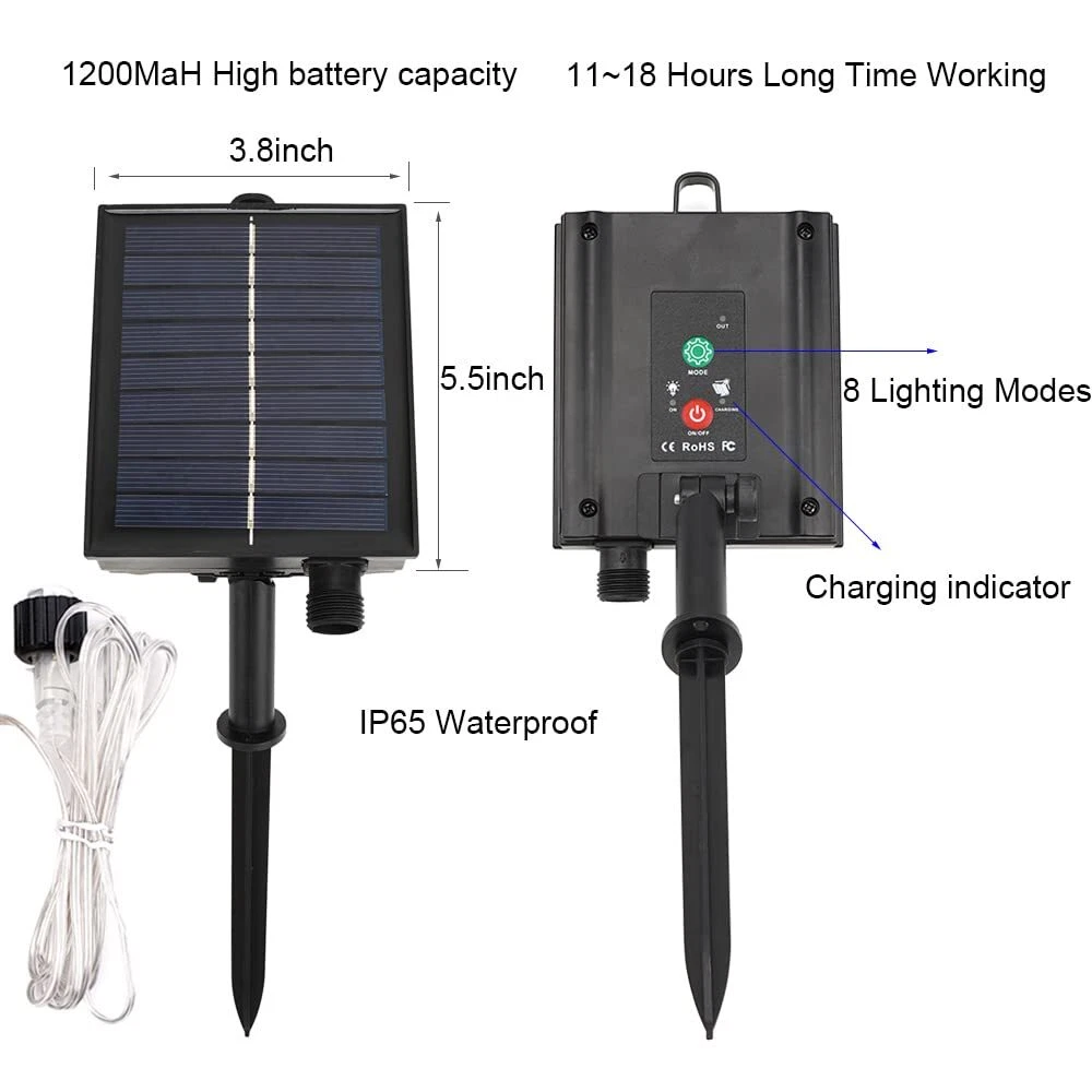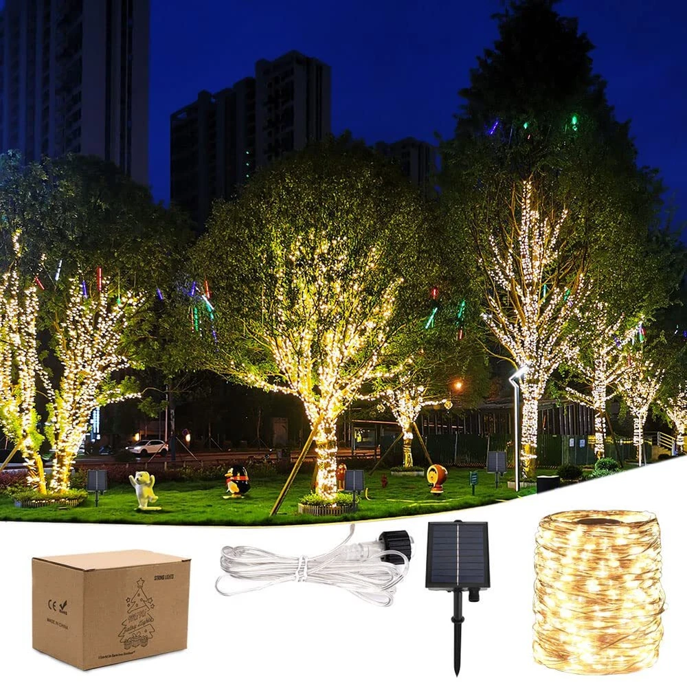 Eco-friendly & Energy-saving: The solar string lights are powered with a built-in rechargeable 1200 mAh battery,which has large capacity for whole night lighting require.the string light will automatic illuminate at dark and off at dawn,work up to 12 to 18 hours after full charge.Adopting high-efficiency solar panels,it automatically absorbs sunlight and converts it into electricity during the day, no external power supply is needed, energy saving and emission reduction Continuous Shining Day and Night: Advanced battery technology ensures sufficient power, even on cloudy days can continue to shine, up to 8 hours of lighting time at night, allowing you to enjoy a warm night 8 Lighting Modes: The string lights outdoor waterproof create different aesthetic atmosphere with various light modes: Combination, in waves, sequential, slow glow, chasing/flash, slow fade, twinkle/flash, and steady-on Waterproof & Durable: IP44 waterproof design, no fear of rain, suitable for outdoor gardens, terraces, balconies and other environments, all year round, anytime and anywhere for you to light up.And the string lights also have good weather resistance and are able to work stably in a variety of climatic conditions, including high and low temperatures, humidity and sandy environments. This makes LED string lights perfect for outdoor decoration and lighting Bendable Copper Wires(Silver Color Wires): The solar fairy string lights inclued 3-copper wires.Extra long bendable copper wire could be shaped into any symbols.No need for complicated wiring, just fix the solar panel in the direct sunlight, hang the light strings at will, and start your eco-lighting journey instantly.With light weight and small size, it is portable and convenient for camping and traveling
