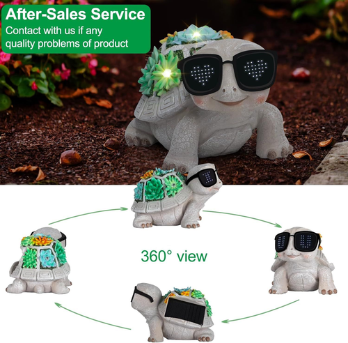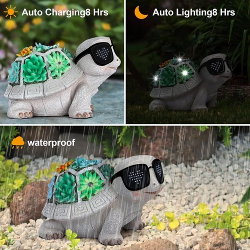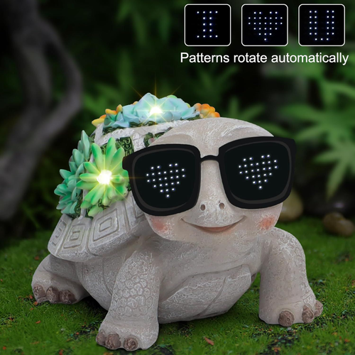 Solar Garden Statues Turtle with Succulent and LED Lights Birthday Gifts for Women Mom Grandma Solar Outdoor Decor for Patio Backyard Yard Lawn Decoration-Unique Housewarming Gifts LuxeFusion Product Description Introducing our exquisite Solar Garden Statues, the perfect addition to your outdoor space. Crafted with high-quality materials, these statues feature a charming turtle design adorned with succulent plants and LED lights. Symbolizing resilience and happiness, these statues are not only visually appealing but also weather-resistant. The eco-friendly battery is powered by solar energy, offering convenient and automatic lighting at customers love these large-size, durable solar garden statues for their thoughtful design and practicality. Whether as a decorative piece for your garden or a meaningful gift for a loved one, these statues are sure to bring joy and beauty to any outdoor setting. Enhance your garden decor with these stunning turtle garden statues that provide both aesthetic appeal and eco-friendly't miss out on this opportunity to elevate your outdoor space with our Solar Garden Statues. Experience the magic of these charming statues that combine artistry, sustainability, and convenience. Purchase now and enjoy the beauty of these solar-powered statues while contributing to a greener environment. Upgrade your garden decor with these exquisite solar garden statues today! Features 【Creative Lighting】The sunglasses on our turtle statue rotate the LED lights ‘i’, ‘❤︎’ and ‘U’, which is very creative, cool and cute and can add to your garden decor. A perfect addition to your outdoor space, this weatherproof statue exudes resilience and joy while lighting up your garden with eco-friendly solar power 【Finely Crafted】Our large-size Turtle Garden Statue is meticulously crafted to stand the test of time, embodying both style and durability. With succulent plants delicately integrated into the design, this statue captures the essence of nature, making it a unique and enchanting piece for any garden landscape 【Eco-friendly】Elevate your outdoor ambiance with the seamless integration of modern technology and nature-inspired aesthetics. This Turtle Garden Statue boasts an eco-friendly battery powered by solar energy, ensuring long-lasting illumination throughout the night while requiring minimal maintenance 【Solar Charge】Say goodbye to cumbersome wiring and batteries, as this Solar Garden Statue offers effortless solar charging and automatic lighting functionality. Simply place it in direct sunlight during the day, and watch it come to life at night, creating a captivating display that will enchant and delight both you and your guests 【Idea Gifts】Unleash the magic of our Solar Garden Statue as a thoughtful gift option for loved ones. Each purchase comes with excellent customer service, ensuring a seamless shopping experience from start to finish. Embrace the beauty of outdoor solar decor with this enchanting turtle garden statue that combines artistry, functionality, and eco-conscious design Product Details Color: Gray Brand: Pawatee Theme: Decor Material: Resin Style: Turtle Occasion: Womens Day, Mother's Day, Christmas, Birthday, Thanksgiving Product Dimensions: 7.48"D x 4.92"W x 4.72"H Recommended Uses For Product: Outdoor Mounting Type: Freestanding Included Components: Light kit inlcuded Item Weight: 1.4 Pounds Number of Items: 1 Item Weight: 1.4 pounds Manufacturer: Pawatee Country of Origin: China Item model number: 10011 🚚 Free Shipping All orders ship free and fast to your doorstep. 🔁 Easy Returns Satisfaction guaranteed. 30-day returns, no questions asked. 💬 24/7 Support Contact us anytime; we’re here to help, day or night. Brought to you by LuxeFusion – Quality you can trust.