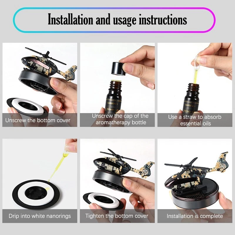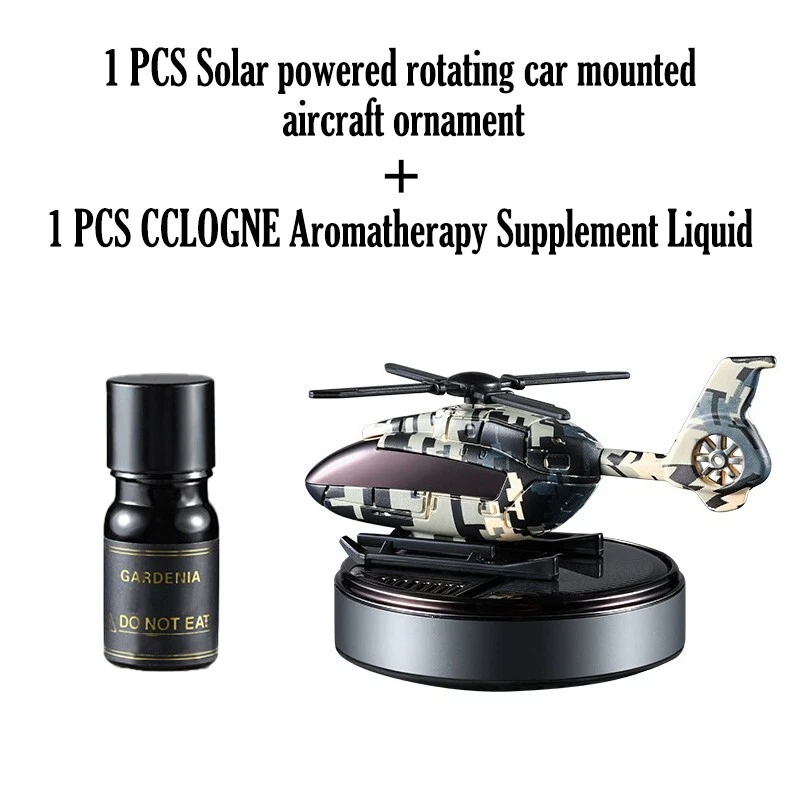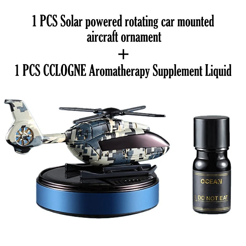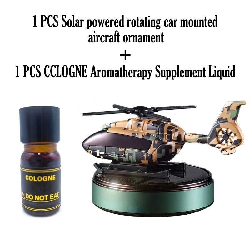 Solar car freshener, helicopter model, solid aromatherapy car air purifier [Compact size and high quality materials] : Camo Solar Aircraft in-vehicle Aroma: 11 x 7.5 x 6.5 cm /4.3 x 2.9 x 2.5 inches. The helicopter fuselage and metal rings are made of high-quality ABS+ aviation aluminum alloy. [Solar power supply] : Solar collector consists of solar panels, high efficiency. This camo solar Airplane in-car aromatherapy can spin itself anywhere in the sunny outdoors without the need for batteries and cables, so you can make it an excellent home ornament or unique car ornament [Safe ] : Essential oils are extracted directly from plants, 100% natural, evaporating without any pollution. Not harmful to children and pregnant women [Perfect Christmas gift] : The car aroma purifier is not only a car air freshener, but also an excellent decoration for the can or home, which is the perfect gift for family and friends 【 Available in three scents 】 : Camouflage blue [sea flavor] Top note: Bergamot, black tea shade, Gepong Middle note: broken lotus leaf, cardamom, clove after note: cypress wood, rock grass orchid, sandalwood Camouflage Green [Antique] Top note: Bitter orange flower oil, citrus Medium: Bergamot oil, neroli, rosemary Afternote: sweet orange oil, lavender Camouflage Black [Gardenia] Top note: Lavender, Gardenia, Gabon Medium note: Broken lotus leaves, cardamom, cloves After notes: Sweet orange, lemon, sandalwood