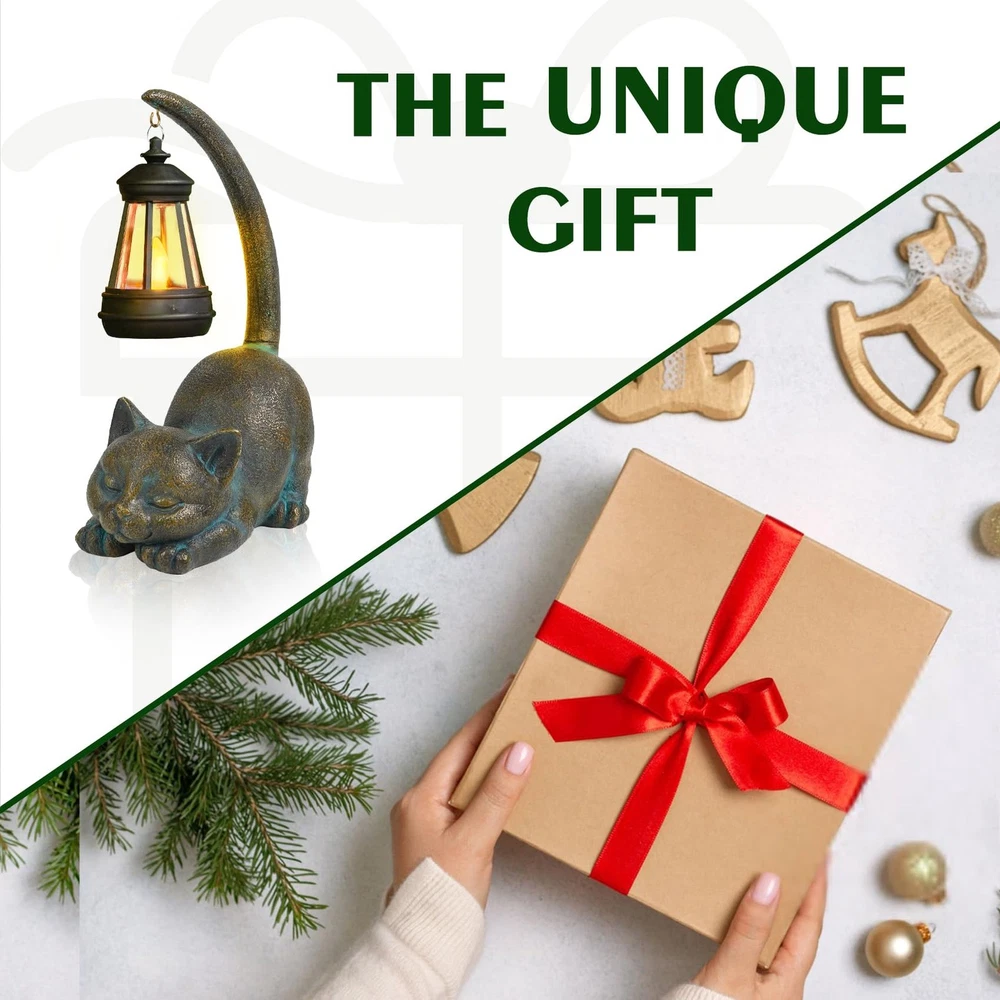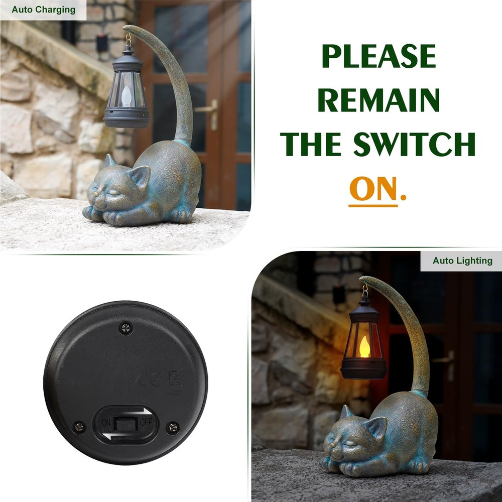 Resin statue with hand-painted UV resistant coating and solar panel is waterproof, you don't have to worry about the statue fading when you use it in rainy days. Auto switch solar light, charge the statue in the sunlight for 6-8 hours and it will automatically light up at night for 8-10 hours. Cute statue is suitable for patio, yard and porch in the garden, etc. Original Design: The size of the cat garden statue is 3.94''(W) x 6.69''(D) x 10.03''(H). Bronze cat with delicate textures and a lantern dangling from its tail. The light from the lantern mimics a vivid small flame and flickers in the darkness. NOTE: The cat's tail comes disassembled in the package and needs to be assembled for use. Sturdy & Waterproof: The outdoor garden statue crafted of safety resin, finished with protect coating for waterproof and long-lasting color does not fade. Automatic Solar Charging: Turn on the switch and place the solar statue in sunlight for 6-8 hours of charging. It will light up automatically at night for 8-10 hours. The lantern is automatically photosensitive. NOTE: If you are not sure whether the button is turned on, please cover the lantern with your hand and keep out of the sun. If the switch is turned on, it will light up. Unique Decorations: Cute cat figurine can be placed as decorations in the garden, patio, lawn, yard, front doors, front yards, and home. Place the sculpture in your garden or home to bring you a warm and cozy atmosphere. Great Gifts Choice: The solar garden statue comes with exquisite and designed box which can also be a good gift choice for housewarming, birthdays, mother's days and Christmas gifts for neighbors, family, and friends. After-sales Service: offers no worried after-sales service. If you discover any damage or flaws in the product, please reach out to our team, we will solve the problem for you!