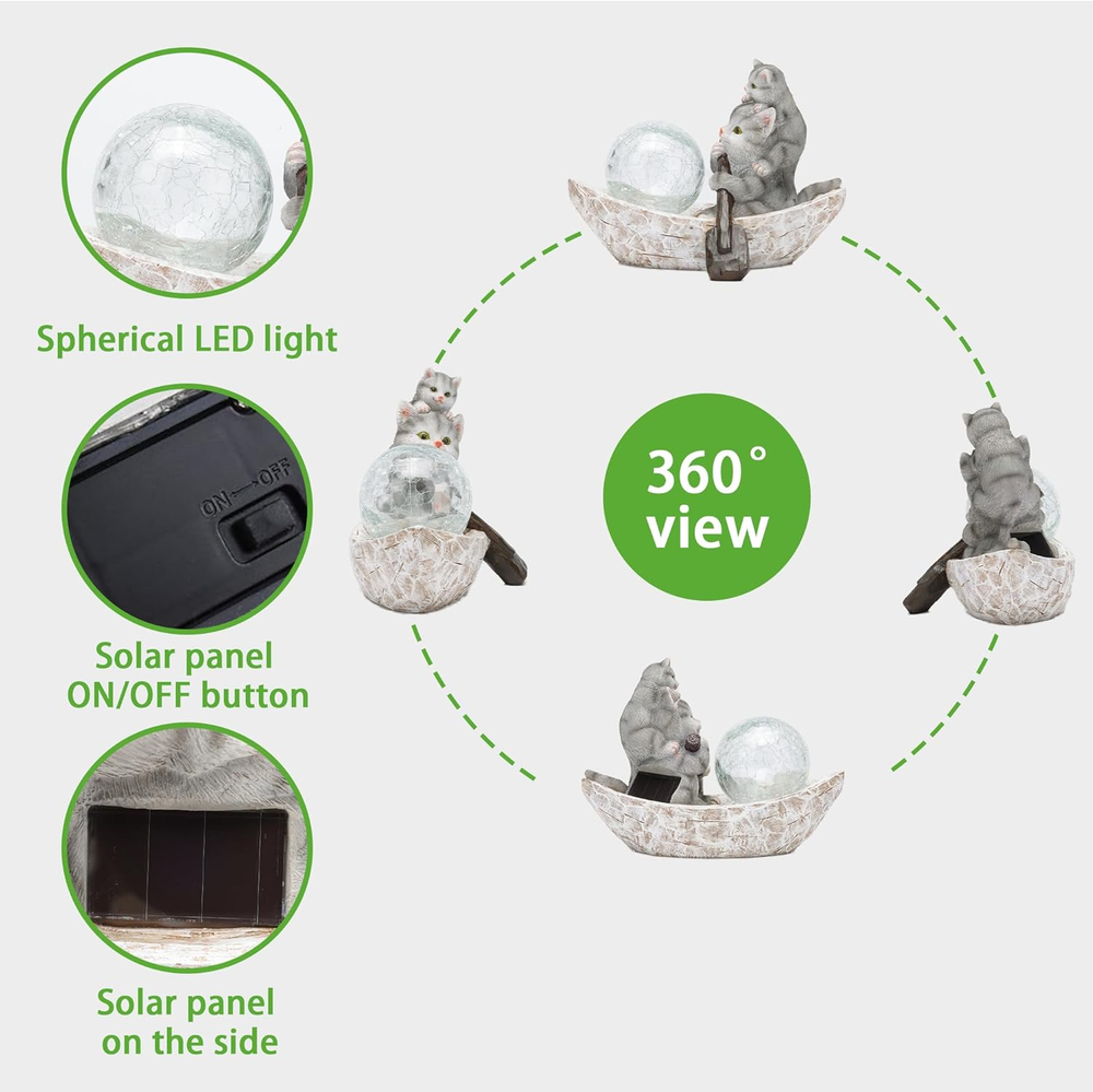 Garden Statue of Cat,Garden Decor Cat Figurine,Cats Outdoor Statue,Solar Decor for Patio,Balcony,Yard,Lawn Ornament 【Cute Outdoor Garden Decorations】This solar Cat garden decor is made of high quality resin.It looks dorable at day and the solar LED lights will Illuminate your front yard,lawn,patio,balcony or garden at night. 【Weatherproof】Rezpuao outdoor cat decor are hand-painted with UV protection coating.Each owl figurine is vividly and durable enough to withstand changing weather conditions without cracking and fading. 【Easy To Use】The patio Cat ornament which just toggle the bottom switchand leave it in the "on" position in the daytime.The solar Cat sculpture charge during the day and light up automatically at night.If the led lights don't turn on when you receive it that maybe caused by the long time shipping.Just place Cat in the sunlight for a few hours,and the problem will be fixed. 【Wonderful Garden Gift】Outdoor cat figurine is perfect for various areas,such as the garden,patios,lawns,yards,outdoor spaces,backyards,flower beds,sunrooms,and more.It's a great present for housewarming and ganrden lovers. 【Perfect Service】Rezpuao solar cat statues are professionally tested before they are shipped out from the factory.We are dedicated to provide customers with high quality products through constantly improvement.If you have any problems,please send us an email and we will give you a satisfactory answer as soon as possible. Product Description Cat Statue for Patio Lawn Ornaments Rezpuao Cat Decorations for Garden with Solar Light Cute Cat Decoration The garden cat statue of rowing designed from Scandinavian stories who has a modern look and colorful paint. Solar cat figurine acts as a wonderful addition to brighten up your garden.Size:8.50*5.2*6.30 Weatherproof & Anti-Fade Rezpuao outdoor Cat decor is made of premium resin and carefully hand-painted with UV protection coating. Each cat figurine is vividly adorned with bright color, making them unique individuals meanwhile durable enough to withstand changing weather conditions without cracking and fading. Easy To Use The patio cat ornament which just toggle the bottom switchand leave it in the "on" position in the daytime.The solar cat sculpture charge during the day and light up automatically at night.If the led lights don't turn on when you receive it that maybe caused by the long time shipping.Just place cat statue in the sunlight for a few hours,and the problem will be fixed. Wonderful Garden Gift Outdoor cat figurine is perfect for various areas, such as the garden, patios, lawns, yards, outdoor spaces,front doors, front yards,walkways, front steps, backyards,flower gardens, flower beds, sunrooms, courtyards and more. I have this cute little guy to make me smile. If you're looking for something different for your yard or as a gift for friends or relatives who appreciate amusing and useful patio, deck, and yard decorations , this is a perfect choice. Cat Statue for Patio Lawn Ornaments Rezpuao Garden Cat Statue,Solar Gnomes Figurine,Outdoor Cat Decorations This little cat is adorable. His solar light is very bright at night, especially when he's had a nice sunny day to soak up the rays through the solar panel on his side. Definitely a great addition to the patio or garden decorations. Resin Cats Figurine Solar Cat Garden Decorations,Garden Gift Parent child cat rowing, both cats are very cute.The cat is carrying an attractive glass orb in the front of the canoe. A solar panel on his side charges the lithium batteries underneath. The orb had a lovely glow as the evening rolled in. Rezpuao Garden Statue Decor Add to Cart Add to Cart Customer Reviews 5.0 out of 5 stars 1 4.6 out of 5 stars 241 4.6 out of 5 stars 241 5.0 out of 5 stars 1 4.3 out of 5 stars 9 Price $34.89 $ 34 . 89 $26.99 $ 26 . 99 $29.66 $ 29 . 66 $35.99 $ 35 . 99 $29.99 $ 29 . 99 Material Resin Resin Resin Resin Resin Style Garden & Home Decor Garden & Home Decor Garden & Home Decor Garden & Home Decor Garden & Home Decor Height 6.3 inch 5.51 inch 6.3 inch 7.48 inch 6.1 inch Waterproof √ √ √ √ √ Lighting Time 6-8h 6-8h 6-8h 6-8h 6-8h Item model number CA81343 Style Decorative Number of Items 1 Power Source Solar Powered Country of Origin China Warranty Description Two month return and exchange. Switch Style Touch Theme Love Batteries Included? Yes Usage Decoration Cartoon Character Cat Batteries Required? Yes Battery Cell Type NiMH Material Resin Type of Bulb Led Batteries 1 AA batteries required. (included) Item Weight 14.4 ounces Occasion Mother's Day Special Features Solar Powered Special Feature Solar Powered Part Number CA81343 Color Gray Shape Cat Figure Recommended Uses For Product Decoration Included Components On-Off Switch Product Dimensions 5.2"D x 8.5"W x 6.3"H Number Of Pieces 1 8.5 "h x 5.2 "h x 6.3 "h. Weight: 14.4 oz Shipping from the USA All of our products are shipped from the USA, ensuring quick delivery to your destination. Payment We offer the following payment methods: PayPal, credit card, bank transfer, and eBay's secure payment system. Free Shipping & Free Returns Shipping within the USA is FREE. Additionally, any return is absolutely free for you. Risk-Free Purchase You have the option to return an item within 30 days without any justification. We cover the return shipping costs! Fast Shipping We ship immediately upon receipt of payment. Generally, the package is delivered within 2-3 days in the USA. If it takes longer, we will contact you. Quality and Costs Made in Europe, USA, China No customs fees or additional charges Total satisfaction guarantee Invoice with declared VAT available upon request in .pdf format Feedback Your feedback is very important to us. After you pay for your purchase, you will automatically receive positive feedback from us.
