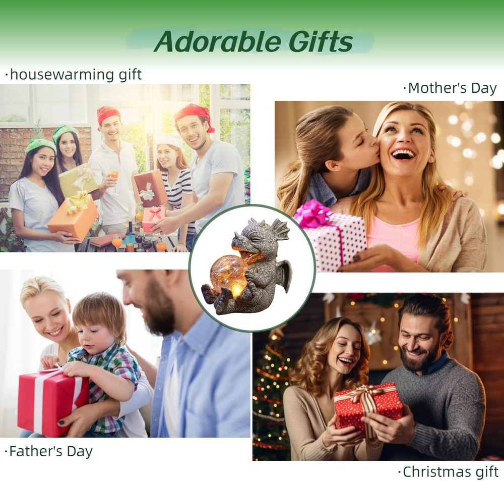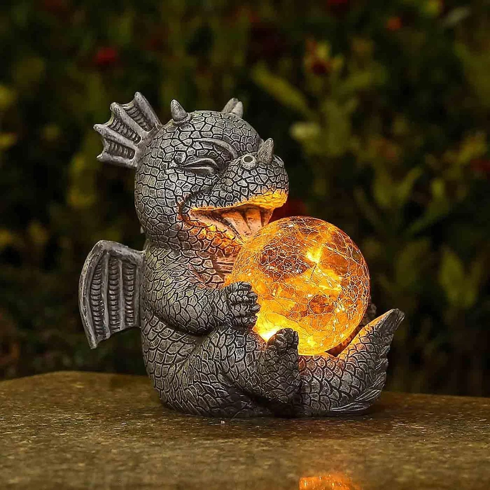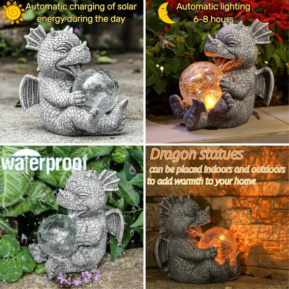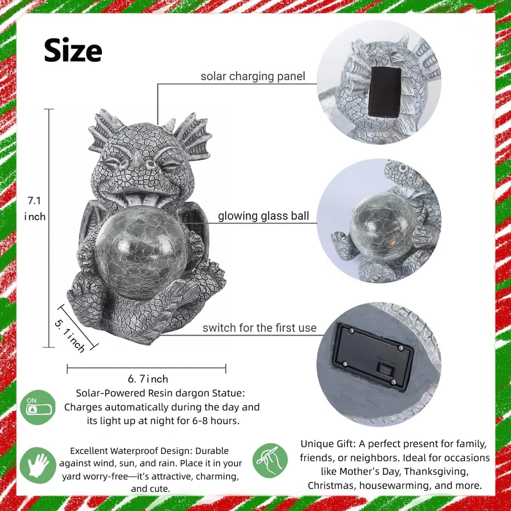 Garden Dragon Statue Solar Powered Outdoor Figurine Light Decor Cute and Hold Glowing Glass Ball Resin Sculpture Home Decoration for Porch Patio Lawn Farm Yard Housewarming Ornament Gift Charming Dragon Garden Decor: Bring whimsy to your garden with our adorable baby dragon holding a glowing solar orb. Perfectly sized at 6.7 x 5.1 x 7.1 inches, it adds a magical touch to any outdoor space. Efficient Solar-Powered Light: Equipped with an automatic solar charging system, this statue charges fully in 8 hours under sunlight, providing 6-8 hours of enchanting illumination at night. Simply switch it to “ON” for hassle-free operation. Exquisite Handcrafted Detail: Each dragon is meticulously crafted from high-quality resin and hand-painted to capture every fine detail, making every piece a unique work of art. Weather-Resistant Durability: Designed to withstand the elements, this dragon statue is made from rust-resistant resin and coated for added weather protection, ensuring it remains a delightful garden feature all year round. Perfect Gift for All Occasions: Whether it’s for Mother’s Day, Easter, Christmas, birthdays, or housewarmings, this solar-powered baby dragon makes a thoughtful and charming gift for friends and family who love garden decor. Product Description Light Source Type LED Style Magicball Number of Items 1 Power Source Solar Powered Number of Light Sources 1 Country of Origin China Lighting Method LED Lamp Type Mood Light Cartoon Character Dragon Number of Pieces 1 Room Type yard, porch, garden, Patio, lawn Bulb Shape Size B9 Efficiency Highly Efficient Product Dimensions 5.1"D x 6.7"W x 7.1"H Material Resin Shape Dragon Installation Type Tabletop Age Range (Description) All Ages Finish Type Natural Specific Uses For Product Garden, Yard, Outdoor, Home, Decoration Indoor/Outdoor Usage Outdoor Water Resistance Level Water Resistant Item Weight 1.5 Pounds Special Feature Garden Shade Height 7.1 Inches Mounting Type Tabletop Color Magicball Is Cordless? Yes Base Material Resin Is Waterproof true Batteries 1 AAA batteries required. (included) Voltage 1.5 Volts (DC) Recommended Uses For Product Garden Shade Material Resin 6.7 "h x 5.1 "h x 7.1 "h. Weight: 1.5 lb Shipping from the USA All of our products are shipped from the USA, ensuring quick delivery to your destination. Payment We offer the following payment methods: PayPal, credit card, bank transfer, and eBay's secure payment system. Free Shipping & Free Returns Shipping within the USA is FREE. Additionally, any return is absolutely free for you. Risk-Free Purchase You have the option to return an item within 30 days without any justification. We cover the return shipping costs! Fast Shipping We ship immediately upon receipt of payment. Generally, the package is delivered within 2-3 days in the USA. If it takes longer, we will contact you. Quality and Costs Made in Europe, USA, China No customs fees or additional charges Total satisfaction guarantee Invoice with declared VAT available upon request in .pdf format Feedback Your feedback is very important to us. After you pay for your purchase, you will automatically receive positive feedback from us.