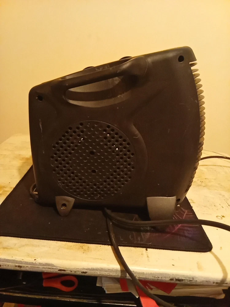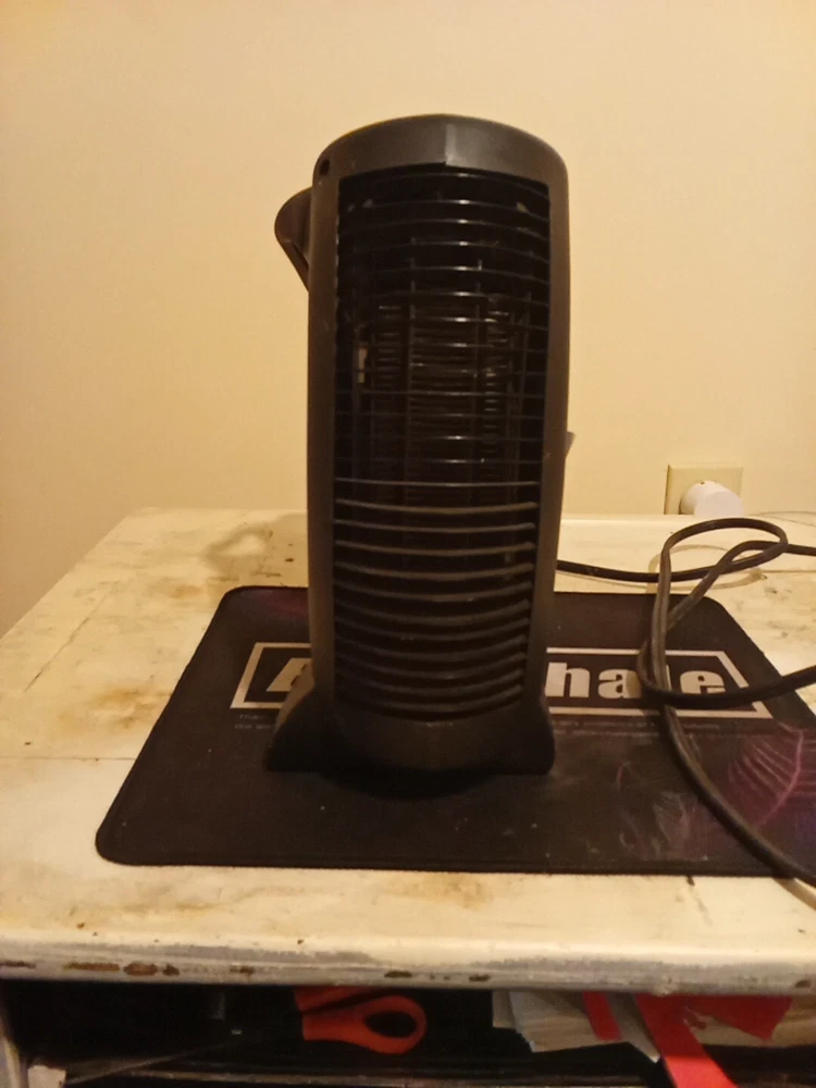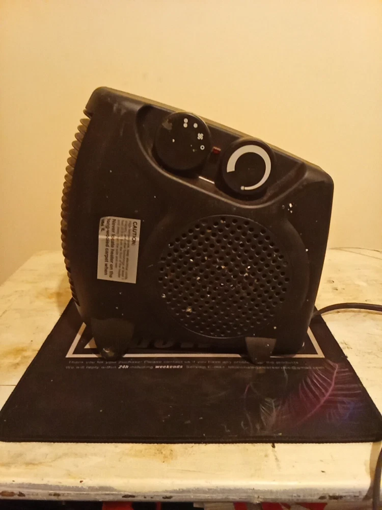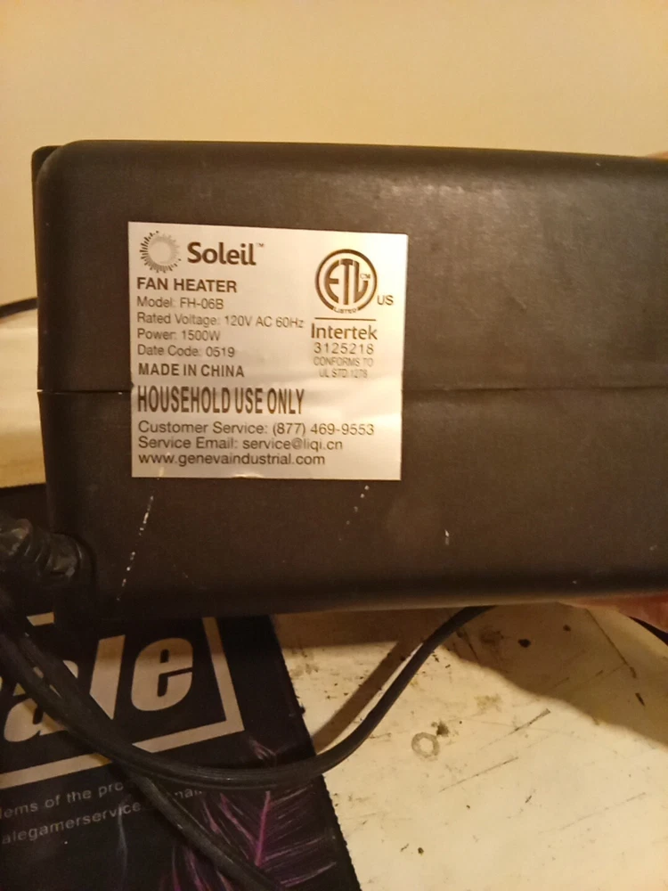 The Soleil Fan Heater FH-06B is a portable electric space heater manufactured in 2019. It features a coil heating element made of copper with two heat settings and a heating capacity of less than 2000 BTU. This desk/tabletop heater has a 1-way air direction, suitable for heating areas between 101-150 sq ft. The compact design in black plastic includes a dial control, auto shut-off feature, and a 5-foot cable, making it convenient for small spaces and quick heating needs.
