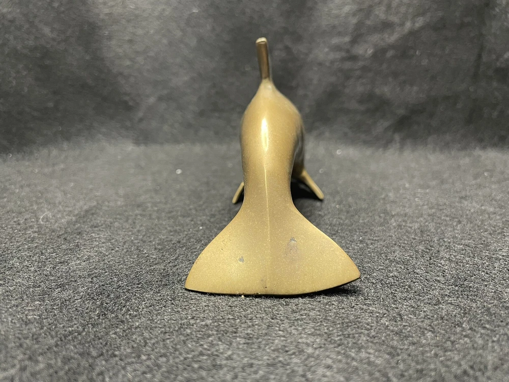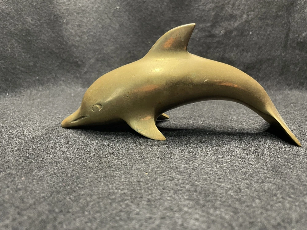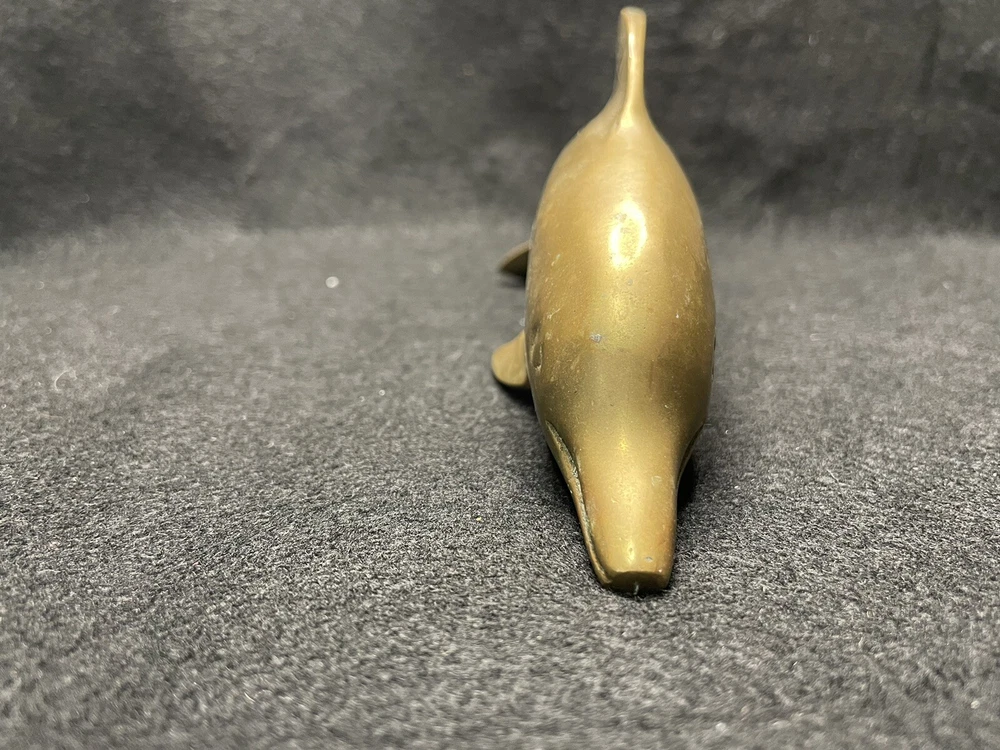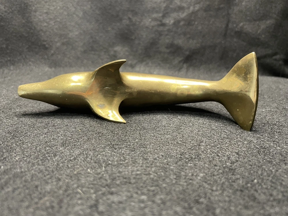 This solid brass dolphin sculpture statue figurine is a late mid-century modern piece that will add a touch of elegance to any collection. This dolphin is approximately 3 inches tall and 6 1/2 inches long. The sculpture is perfect for collectors of figurines and decorative items from the mid-20th century. It will make a great addition to any room or space, and its intricate details will be sure to catch the eye of anyone who sees it.