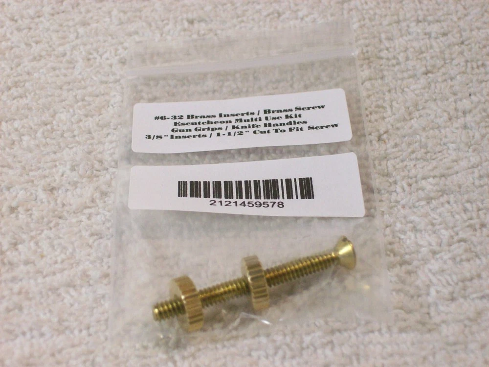 Solid Brass Universal Multi Use Escutcheons Pack of 1.... Can purchase additional packs ...no additional shipping charges for multiple purchases of these.....We have 2 packs listed.....See other listings We have sold 1000s of these over the years. Great for all kinds of wood working projects. ****SEE REFERENCE photos of a grip panel project that used these kits.....These items are not in the sale....**** Universal Escutcheons Kit / Knife Handles / Gun Grips / Brass Inserts With Cut To Fit Brass Screw 1 Pack READ**** Wood craft projects , gun grips , knife handles , other projects...... Multi use brass escutcheons kit.....**** 3/8" Brass Inserts X 1/8" thick... # 6-32 ****..... With Brass 1 - 1/2" cut to fit..... Brass Screw.... # 6-32 oval slotted head .......... No additional shipping charge for multi purchases of these. You only pay one shipping charge no matter how many lots are purchased per order.