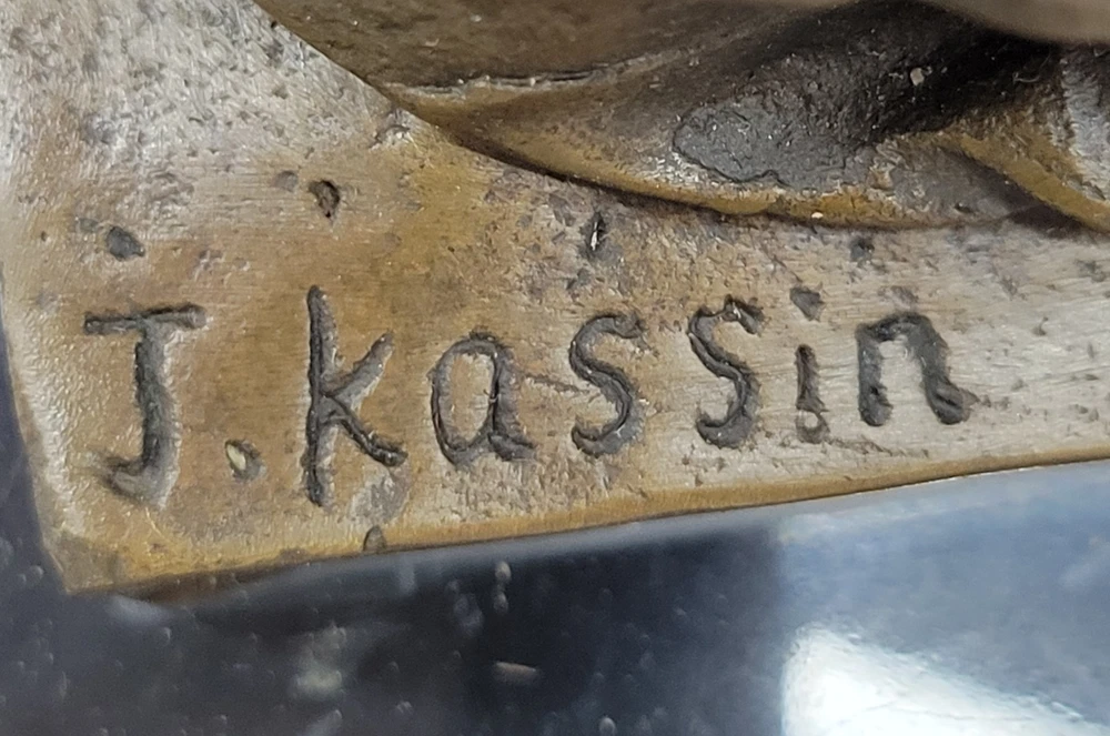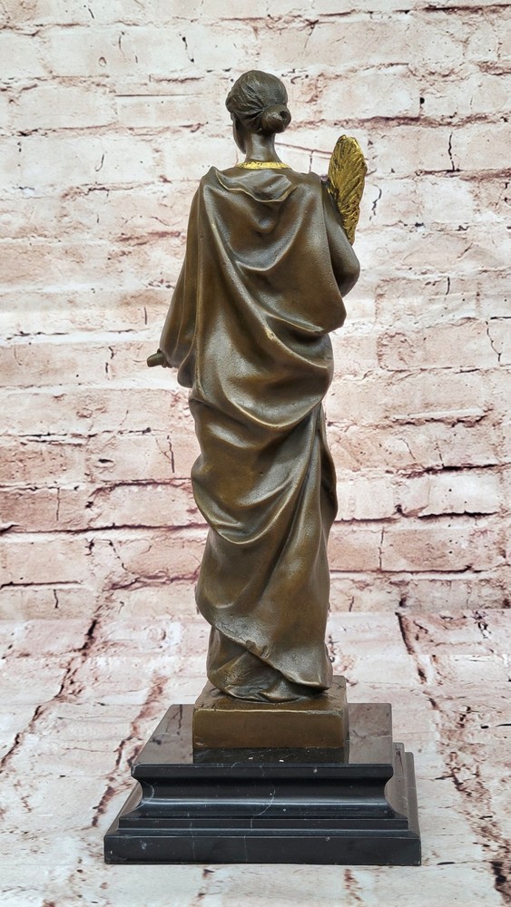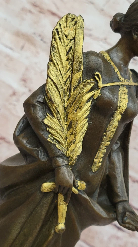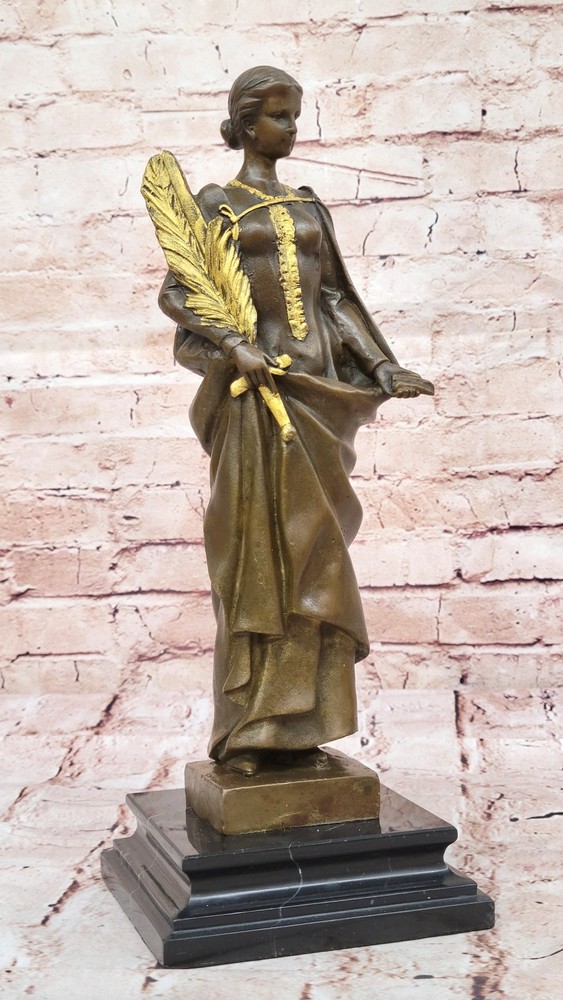 Condition : This sculpture is in perfect condition. Bronze Dimensions with Marble Base: Height 14" x Width 4.5" Marble Dimensions:4.5" X 4 Height without base:13" Weight:8 LBS Inventory: 71STE240BG4517 This symbolic bronze sculpture beautifully embodies the essence of peace and resilience. The woman stands with poise and strength, her arm firmly clutching a sword partially covered by a palm branch, a powerful representation of the delicate balance between war and peace. In her other hand, she holds a small lantern, illuminating the path forward with hope and wisdom. A smaller recast of the original "Peace" sculpture, this piece carries historical significance, as similar versions were produced during World War I. The intricate details bring depth to the sculpture, from the delicate folds of her garments to the fine textures of the sword and lantern, enhancing its artistic and symbolic value. Handcrafted from 100% bronze, this stunning work was cast using the traditional "Lost Wax Method," ensuring durability and precision. The rich brown patina accentuates its timeless appeal, and it is mounted on a black marble base for an elegant presentation. Signed by the artist J. Kassin, this sculpture is a compelling tribute to the enduring pursuit of peace. Athena Lady Wisdom Greek Goddess 100% Solid Bronze Sculpture Art Deco Statue Figurine STE-240BG Video will open in a new window Using the eBay App? Paste link into a browser window: [isdntekvideo]