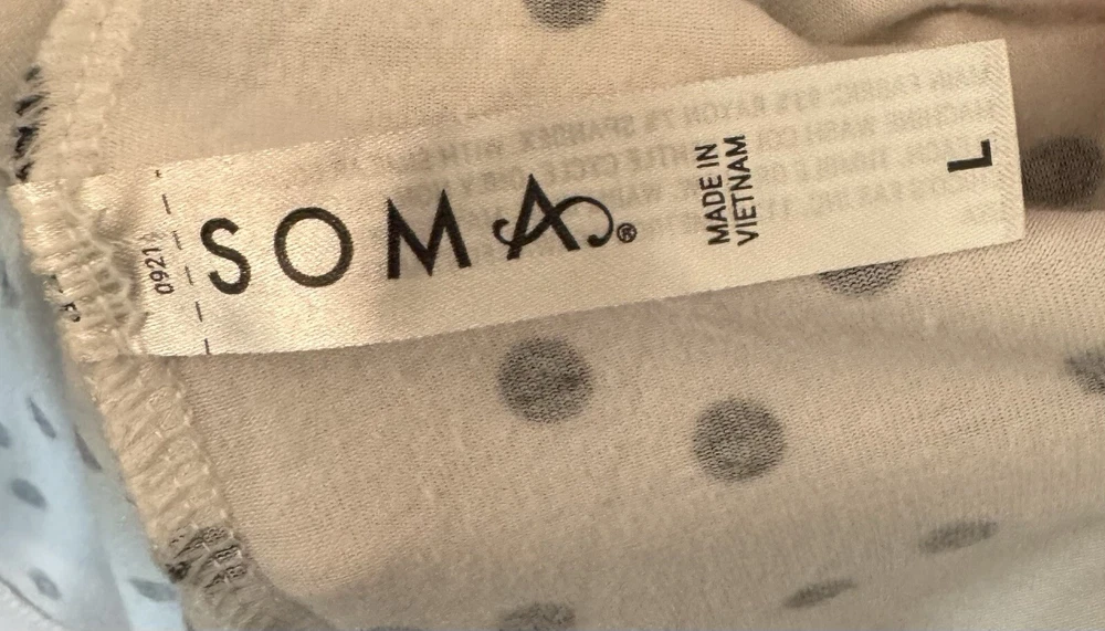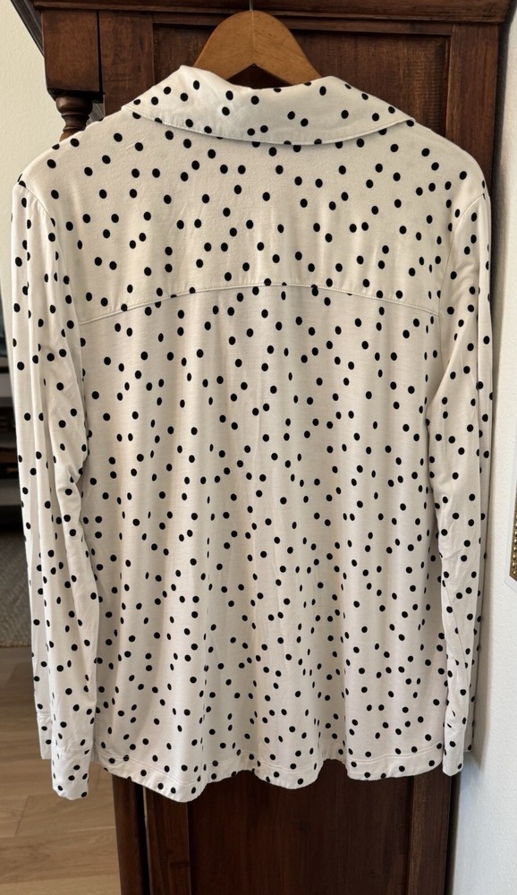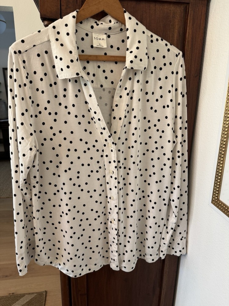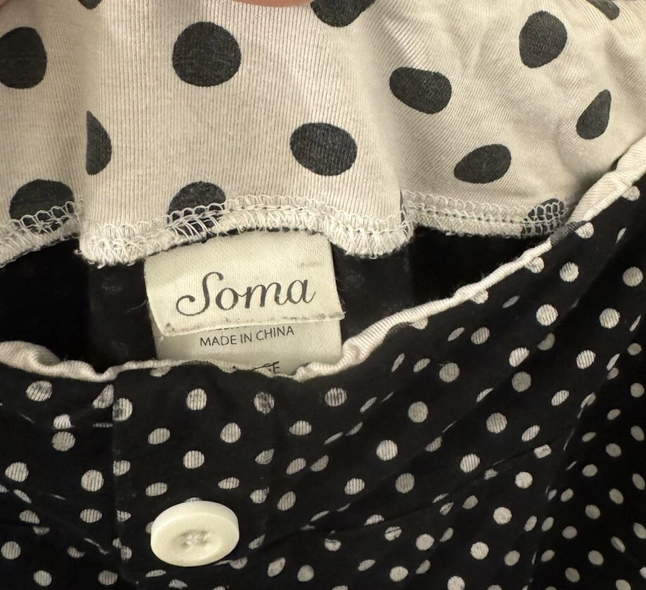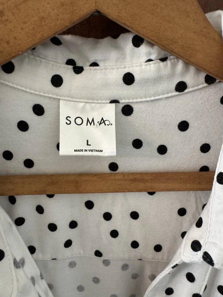 Note: two sizes in this pj set. Measurements: Large Top length is 26”, width is 22” (from armpit to armpit) and sleeve length is 24”. XL shorts have an elastic waist of 36”; with a 4” inseam. The shorts measure 13” from top to bottom. Soma Intimates women's pajama top and shorts. Top is size large and bottoms size XL. The black and white polka dot shorts reminiscent of a Dalmation's coat. Made with a blend of rayon and spandex, the fabric is soft and stretchy for a comfortable fit. The long sleeve top has buttons and is collared. The shorts are pull-on closure allowing for easy wear with 3 white decorative front buttons. The garment care is simple, as it is machine washable. This items are preowned but in good condition with no visible stains or flaws, unless specifically pointed out in photos. Color: We photograph items as accurately as possible; however, colors may vary depending on your monitor and the lighting.