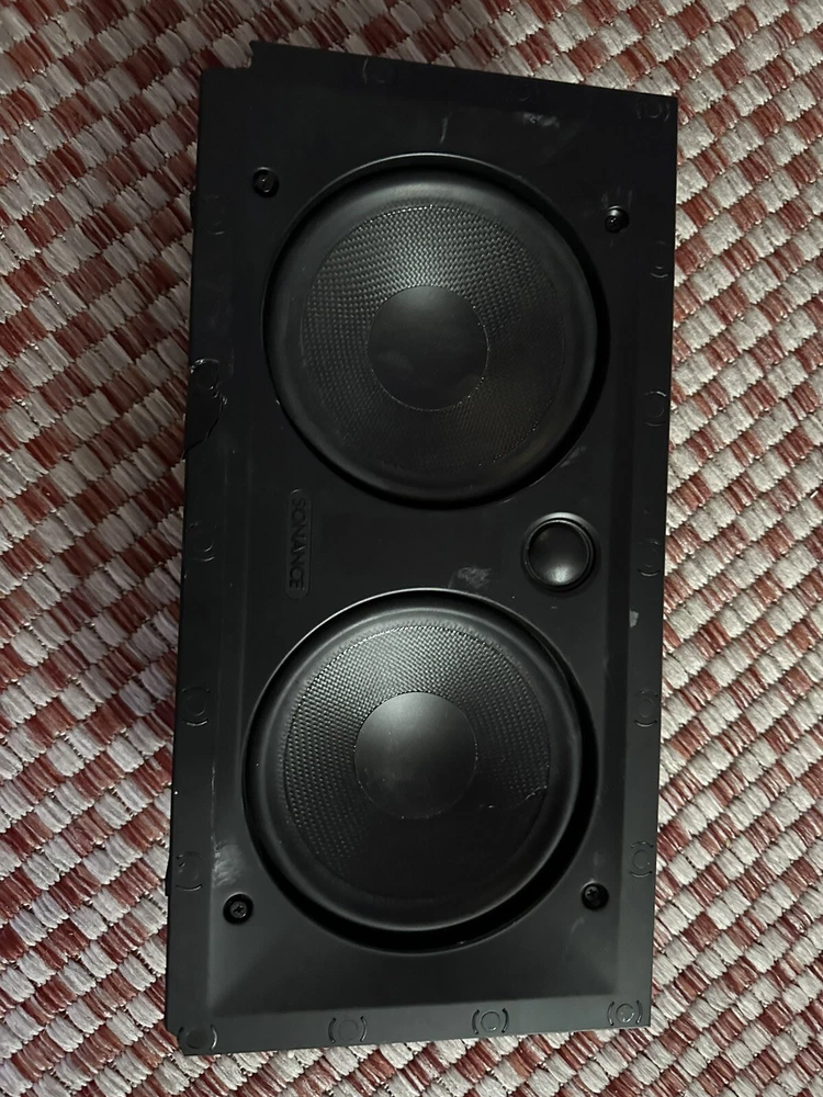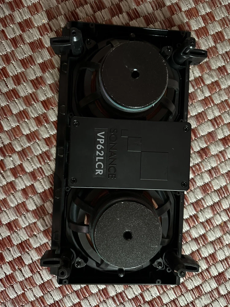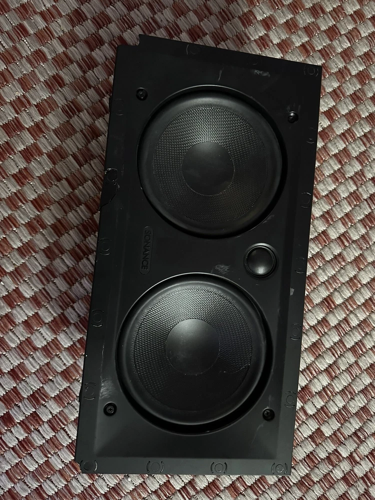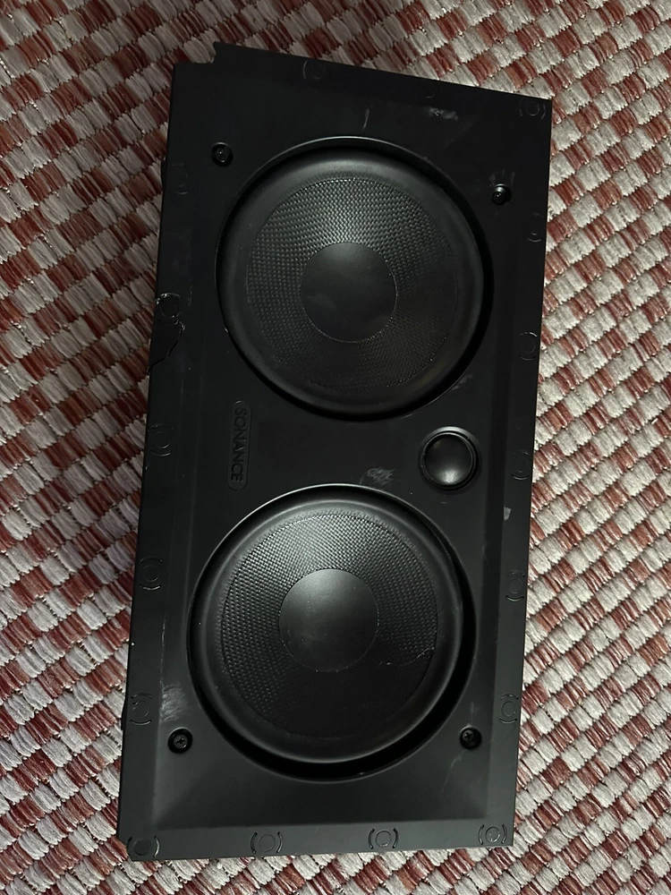 Sonance Visual Performance 2-Way In-Wall Rectangle LCR Speaker (1) VP62LCR Speaker has severe signs of use. Part of the plastic plate is broken see pictures. There is a cut in one of the speakers see pictures. All speakers still play as they should and sounds great.