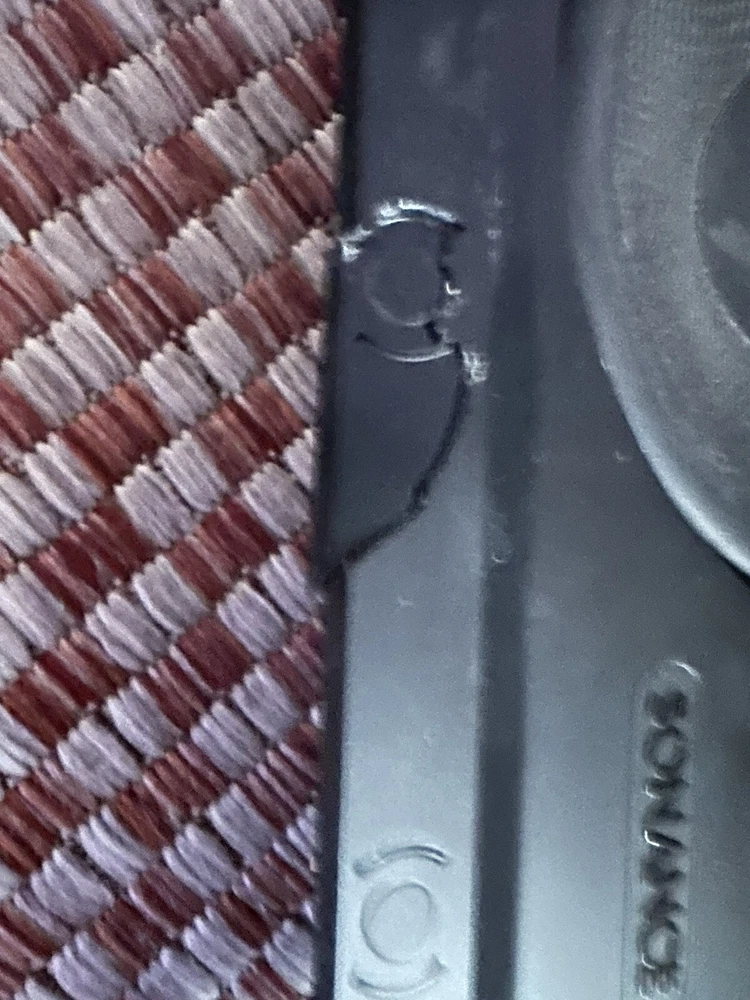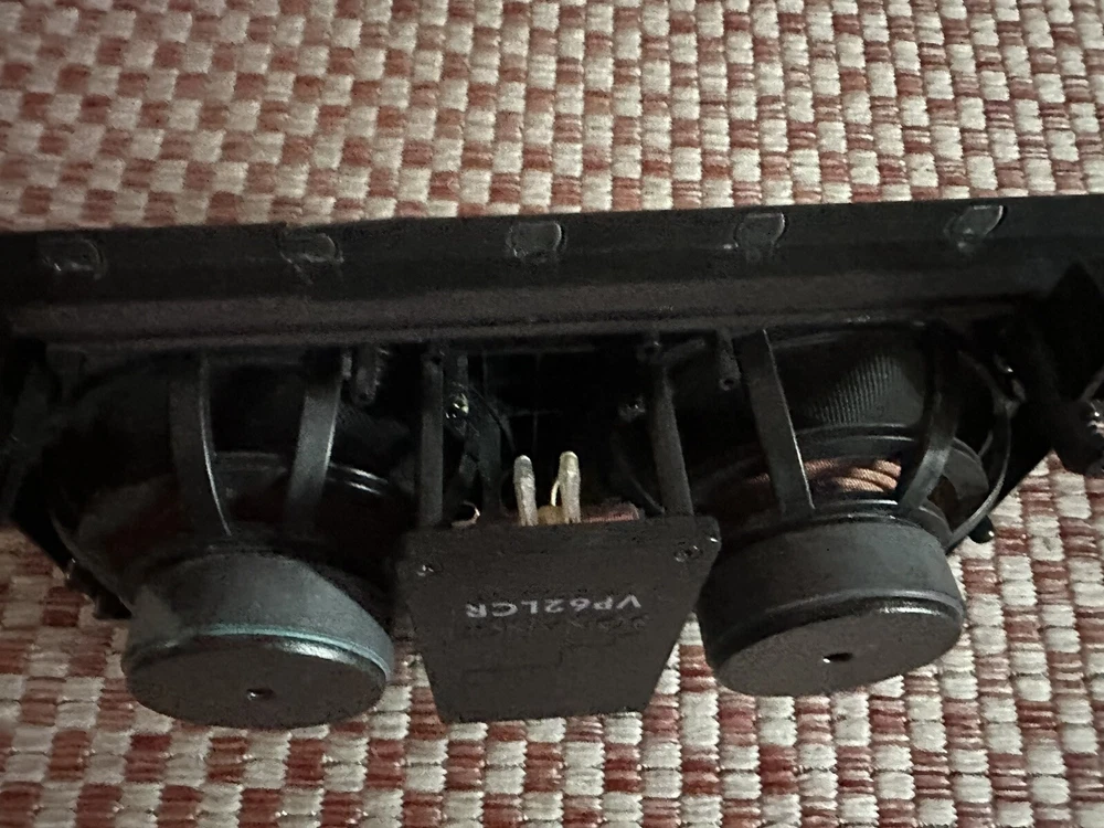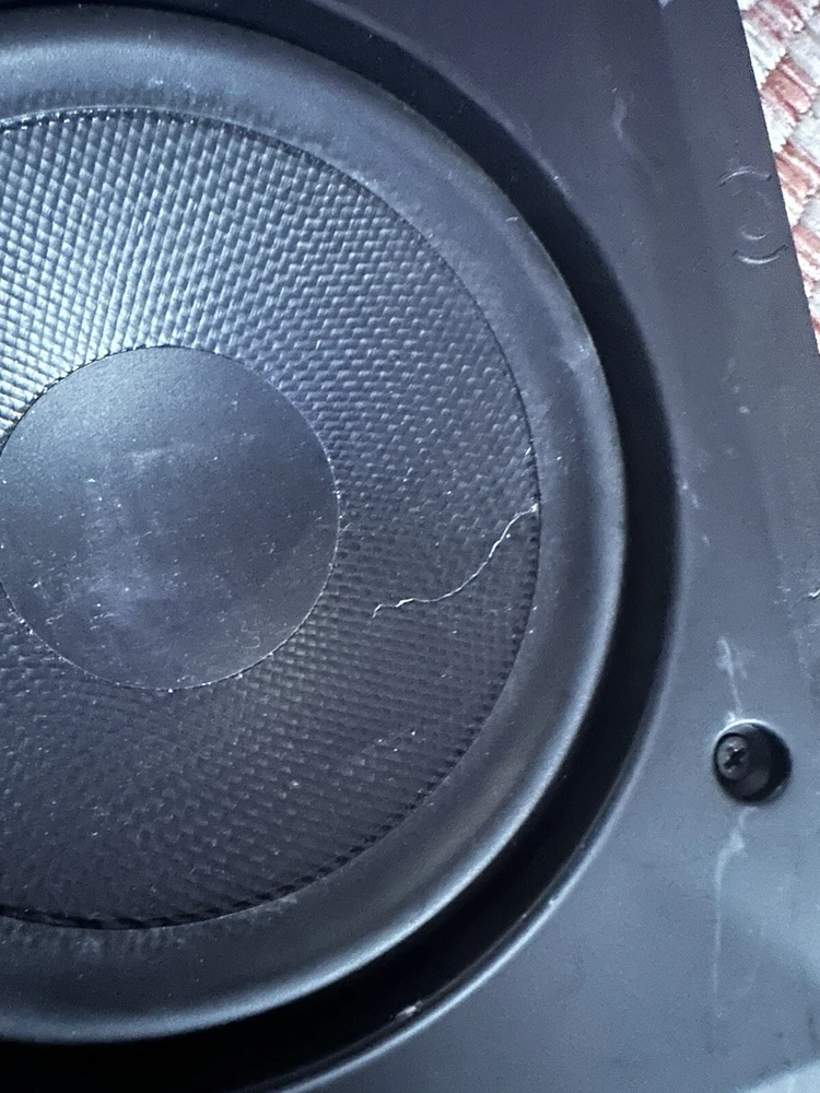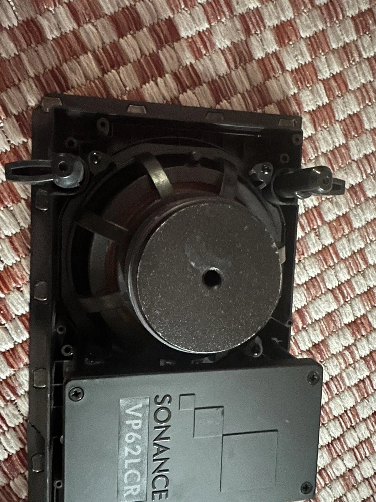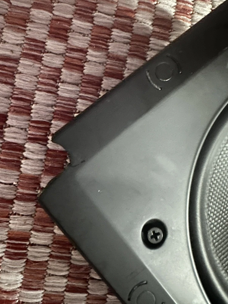 Sonance Visual Performance 2-Way In-Wall Rectangle LCR Speaker (1) VP62LCR Speaker has severe signs of use. Part of the plastic plate is broken see pictures. There is a cut in one of the speakers see pictures. All speakers still play as they should and sounds great.