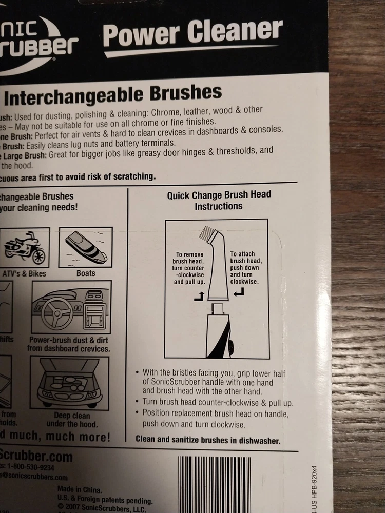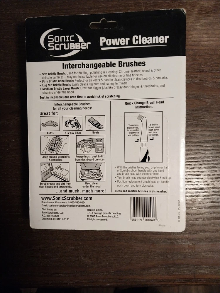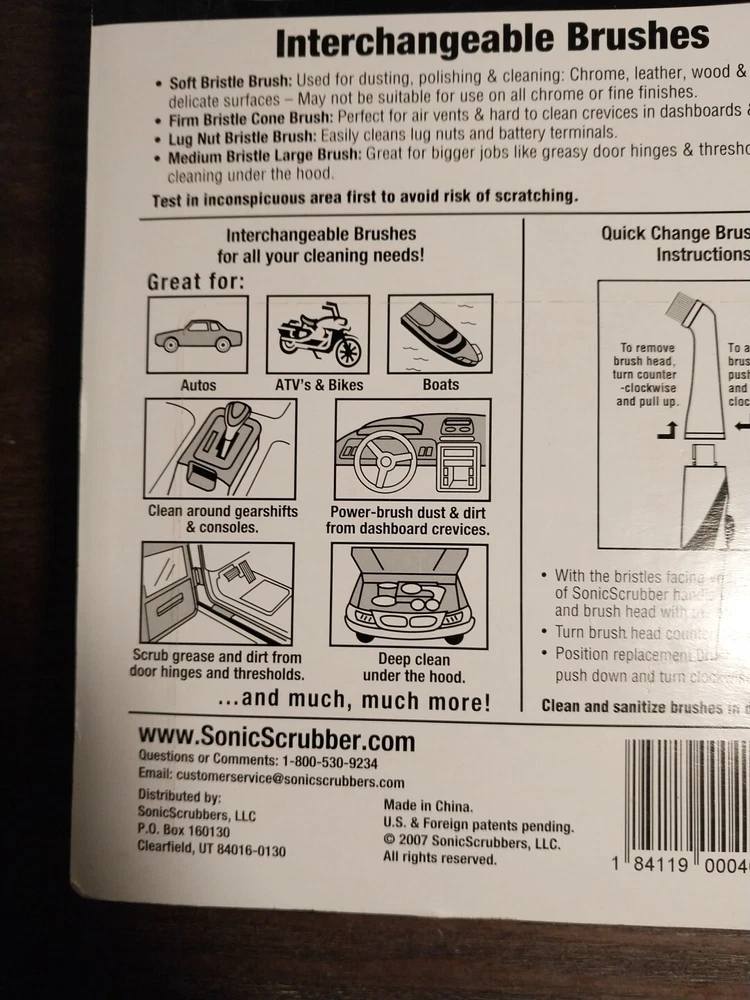 The Sonic Scrubber Pro Detailer Power Cleaner includes a pack of 4 interchangeable brushes designed for heavy-duty cleaning tasks. It features twist removal functionality, making it easy to switch between brushes, and is lightweight for comfortable use. This all-purpose cleaner is suitable for automotive cleaning and is cruelty-free. The brushes are multifunctional and attached to the scrubber for convenience, providing a versatile cleaning solution for various surfaces.
