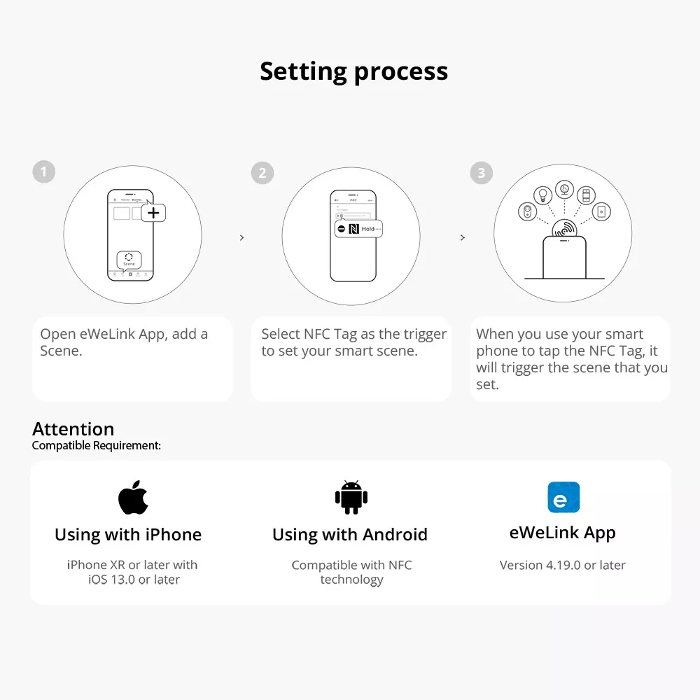 Store Categories Store Categories Central Control Panel DIY Smart Switches 4CHR3 / 4CHPRO R3 BasicR2 BasicR3 BasicZBR3 CC2531 D1 DUALR2 DualR3 / DualR3 lite IFan04 Micro MINIR2 MINIR3 Pow Elite POWR2 POWR3 RE5V1C RFR2 RFR3 S-MATE SlampherR2 SPM SV TH Elite USB Dongle Plus WIFI Smart Switch ZBMINI ZBMINI-L ZIgBee Smart Switch eWeLink-Item WIFI Smart DIY Switch WIFI Smart Socket Plug WIFI Smart Wall Switch Zigbee Series Gateway & Sensors Home Appliances Security Camera Smart Accessories Smart lighting Bulb Smart Plug & Socket Smart Wall Switches SONOFF-Item SONOFF Outlet Wi-Fi Smart Lighting WIFI Smart Plugs WiFi Smart Switches WiFi Smart Wall Switches Zigbee Series Other Sonoff Smart NFC Tag 215 Chip for NFC-enabled Phone Control Smart Devices Scenes Product Description Descr iption Do you want to have a quicker way to control your SONOFF devices? For example, raise your smartphone. Now, we get you covered! You can use the NFC Tag to control SONOFF devices in scene. Each NFC Tag can be set to one smart scene. Tear off the NFC Tag and stick it on the wall. Tap the NFC Tag with your phone to turn on the lights with ease. And you can carry it with ease and use it wherever you want, or stick it on the wall then you can see it at a glance. Whatever demands you want, SONOFF NFC Tag will help to achieve it~ Featu res : 【Chip Feature】215 chip has 540 bytes larger capacity, and can be read and written more than 10,000 times. 【Wide Compatible】Compatible with NFC-enabled phones (iOS 13 and above, Android with NFC technology) 【Metal Resistant Capacity】Built-in anti-metal layer for use on metal surfaces. laminated white PVC cards with glossy finish and waterproof PVC material, effectively protecting the NFC chip inside. 【Easy to Use】Tap the NFC Tag with your phone to turn on the smart devices with ease. 【Convenient】You can carry it with ease and use it wherever, or stick it on the wall or desk. Payment Policy Shipping Policy Returns Policy Feedback About US Payment Policy We accept payment via Paypal only. Please settle the payment via PayPal within 3 days upon auction ended. You can left us a message about your special request. Shipping Policy Packages will be sent out with 24-48 hours (except holidays). Packages are only shipped via Paypal Address. We will not bear for duties or taxes. We offer free shipment via Economic method.we also offer express transportation,while you need to pay for the extra postage. If you have not received your items within 30 days,please contact us trough Ebay message,please contact us before you contact ebay. Returns Policy We accept returning with 30-days,please add your ebay ID into the package. You can receive the replacement or money back. Feedback We will appreciate for your positive feedbacks,if you have any questions,please Contact us firstly we will try our best to help you. Emails will be replied with 12 hours,replies will be delayed in holidays. About US Working time:Beijing Time From 9:00am to 6:00pm,from Monday to Friday. (we don’t work on weekends).we will get back to soon on working time. Copyright © 2023 Dianxiaomi