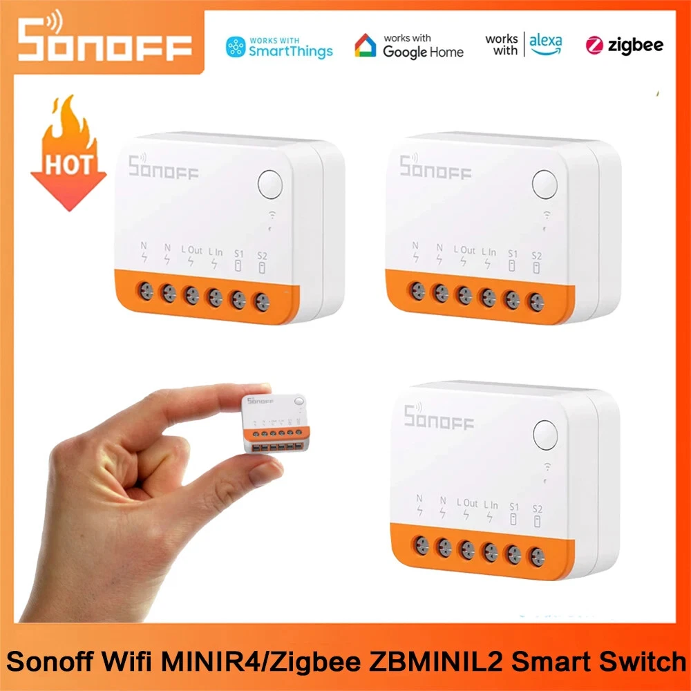Sonoff Wifi MINIR4/Zigbee ZBMINIL2 Smart Switch 2 Way Module Home EWeLink APP Wireless Remote Voice Control Alexa Google Home Description: Model:MINIR4 Dimension:39.5x33×16.8 mm casing material: PC V0 Wifi:IEEE 802.11blg/n 2.4GHz Input:100-240V ~ 50/60Hz 10A Max outputL100-240V ~ 50/60Hz 10A Max Specifications: 1.【Super Tiny Size】Its compact size allows it to be installed in various mounting boxes, including the smallest European standard. 2.【External Switch Control】Easily connect to the momentary switch, door exit switch, SPDT switch, latching switch, and even dry contact sensors. 3.【Detach Relay Mode】MINIR4 has “detach relay” mode, which means the states of external switches and relay are separated, so operating the external switch button won’t affect the relay state. 4.【eWeLink-Remote Control】MINIR4 is a smart switch with the gateway function of “eWeLink-Remote”. You can add “eWeLink-Remote” sub-devices, R5 and S-MATE, after pairing with MINIR4, both R5 and S-MATE can act as remote controllers to control MINIR4 locally through the eWeLink-Remote signal. 5.【Safe & Reliable】TÜV, CE, and FCC certifications ensure a safer and more reliable product. Package Included: 1*Smart Switch Description: Model:ZBMINIL2 wireless connection:zigbee 3.0 Dimension:39.5x32×18.4 mm Casing material:PC V0 lnput:100-240V ~ 50/60Hz 6A Max Output:100-240V ~ 50/60Hz 6A Max Specifications: 【 Super Tiny Size】The tiniest Zigbee smart switch can be easily fit in the smallest EU-type/86 type/120 type mounting box. 【Support External Switch】 Work with different type of external switches to control your devices, like rocker light switch, push button wall switch.etc, no neutral wire required for easy installation & simple use. 【Simple and Reliable】As a Zigbee 3.0 switch, ZBMINI Extreme can combine with Zigbee hubs to form a home LAN,No longer worry about no internet, you are able to freely control the appliances normally even the light is as low as 3W, no anti-flicker module is required. 【Application Scenes】ZBMINI Extreme can achieve two-way control for your staircase light; set countdown/scheduled/loop timers to create your situational life; work well with Amazon Alexa and Google home to turn on/off your light by voice command; support setting the smart scene to trigger connected devices to make your life easier. Package Included: 1*Smart Switch