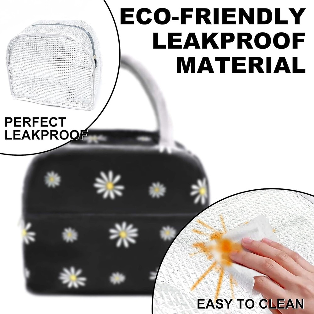 Sonuimy Insulated Lunch Bag for Women & Men, Reusable Leakproof Tote (Black with White Daisy) 【HIGH QUALITY】The insulated lunch box bag is made of high quality high-density oxford cloth and food-grade waterproof aluminum foil to prevent tears and ensure maximum durability, can be leakproof, easy to clean and reusable 【JUST THE RIGHT SIZE】About 9 x 6 x 7.9 inches and weighing only 0.21 pounds, this insulated tote lunch bag is light in weight but big enough to easily hold all the food and dinnerware as you want (lunch box containers, food, fruit, snacks, canned drinks) 【KEEP YOU FOOD FRESH】The cooler lunchbox bag can keep food warm and fresh for a long time, keep your drinks cold, don't worry about food spoilage, it's like a good assistant for your life 【PERFECT DESIGN】Lunch bag with tote style and front pocket design, you can put in some small stuffs you need in life: keys, cards, tissues, cell phone etc.Cute Floral pattern style lunch bag ,ideal gift for teen women or ladies