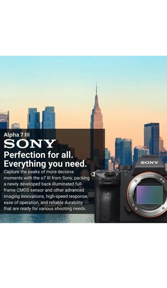 The Sony Alpha a7 III Full Frame Mirrorless Digital Camera Body Only is a high-quality camera with impressive features. It boasts a 24.2 MP CMOS sensor, allowing for stunning images with intricate detail. The camera also has a UHD 4K30p Video with HLG & S-Log3 Gammas capability, ensuring that your videos are crisp and vibrant. With a maximum aperture of f/1.8, this camera is perfect for capturing images in various lighting conditions. Additionally, the camera is compact with dimensions of 8.3 x 6.6 x 5.4 inches and weighs 2.4 lbs., making it easy to carry for on-the-go photography.