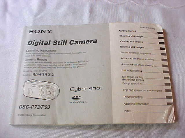 I HAVE UP FOR AUCTION A NICE SONY DSP-P93 DIGITAL STILL CAMERA. THIS IS IN GOOD CONDITION AND WORKS GREAT. IT COMES WITH THE CASE ~ INSTRUCTION BOOK ~ SD CARD AND NEW BATTERIES. GOOD LUCK!!!