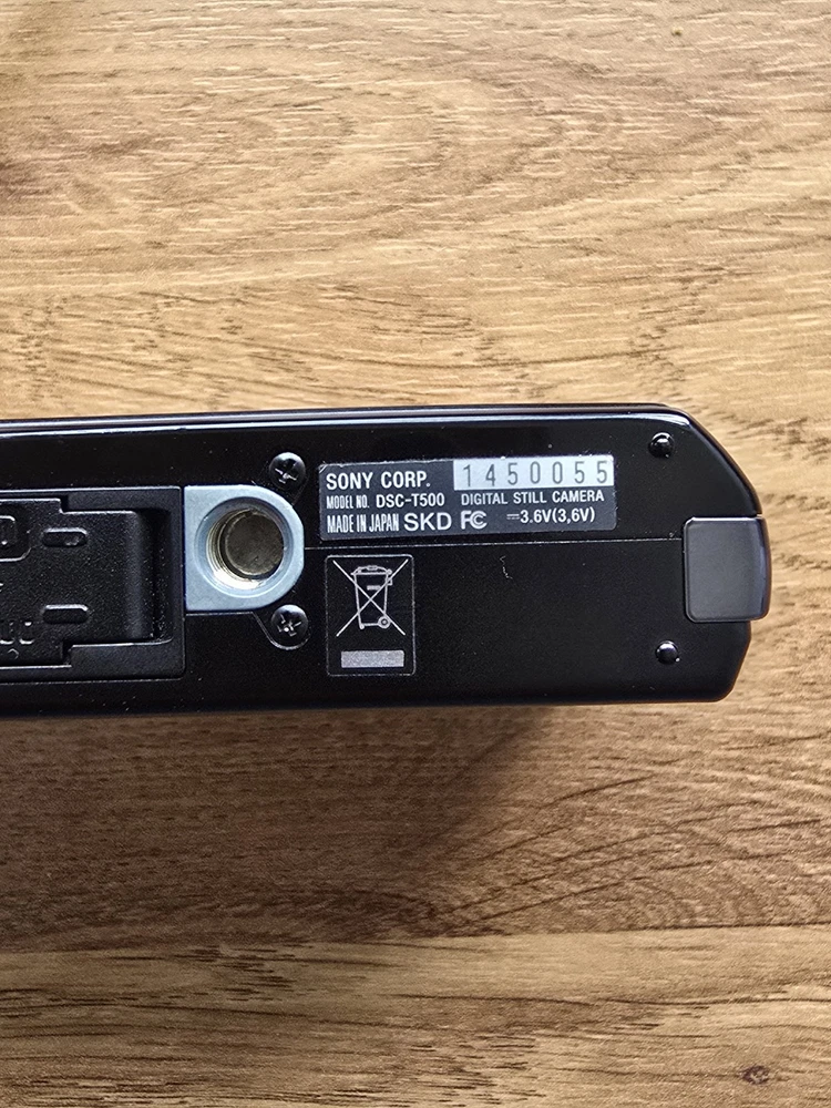Series:Sony Cyber-shotCountry/Region of Manufacture:JapanColour:BlackCharger Included:YesItem Height:97 x 59 x 22 mm (3.82 x 2.32 x 0.87″)Screen Size:3.5 inDigital Zoom:5xType:CompactMaximum Resolution:10.1 MPOptical Zoom:5xConnectivity:USB, AV SocketBattery Type:Lithium-IonFeatures:720p HD Video Recording, Auto Focus, Built-in Flash, Red-Eye Reduction, Touch ScreenItem Weight:185 gModel:DSC-T500Maximum Aperture:F3.5–4.4Brand:Sony