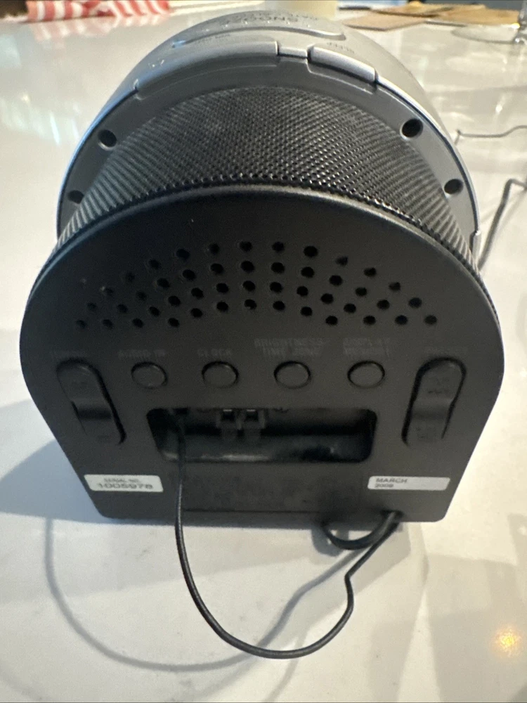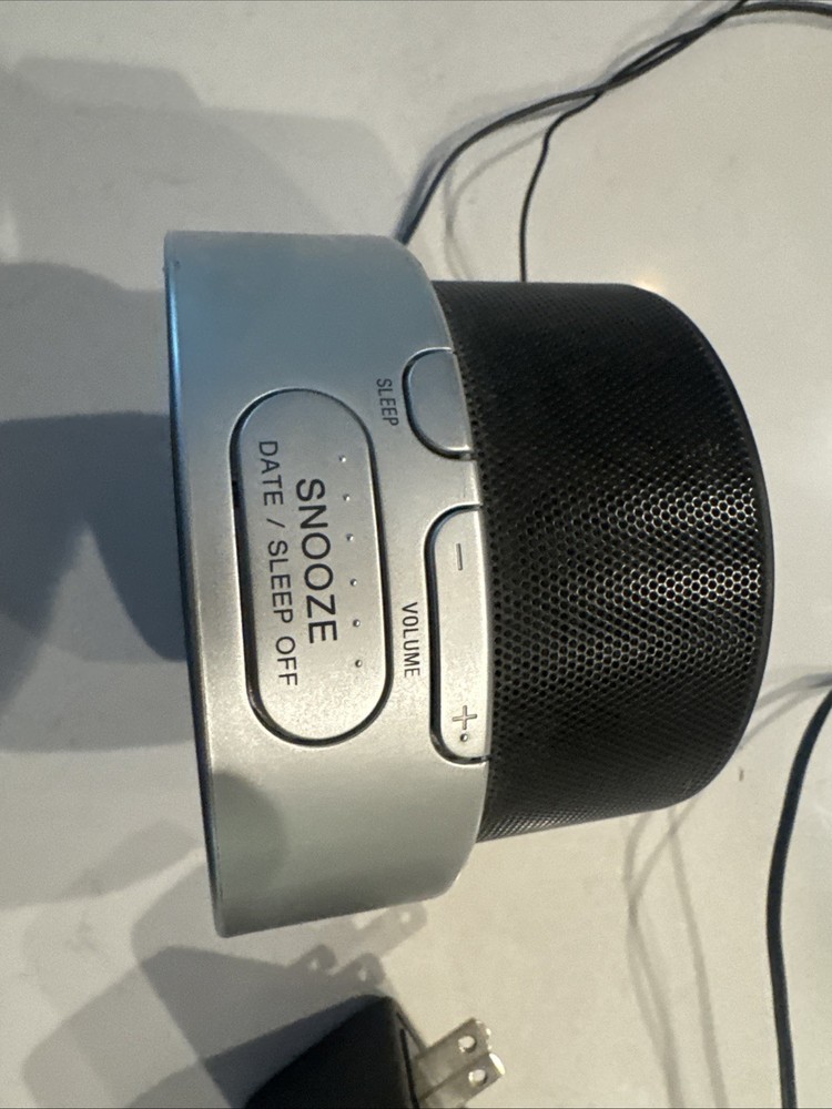 The Sony Dream Machine ICF-C7iP is a modern clock radio with a round shape and a sleek silver and grey/black color design. This iPod dock features AM/FM radio capabilities, alarm function, battery backup, and a 3.5 mm auxiliary input for expanded connectivity. Perfect for teens, adults, and kids alike, this 21st-century clock radio from Sony is a stylish and functional addition to any bedroom, kitchen, home office, or garage. With its digital display and convenient remote control, this clock radio offers a seamless blend of aesthetics and practicality for a contemporary lifestyle.